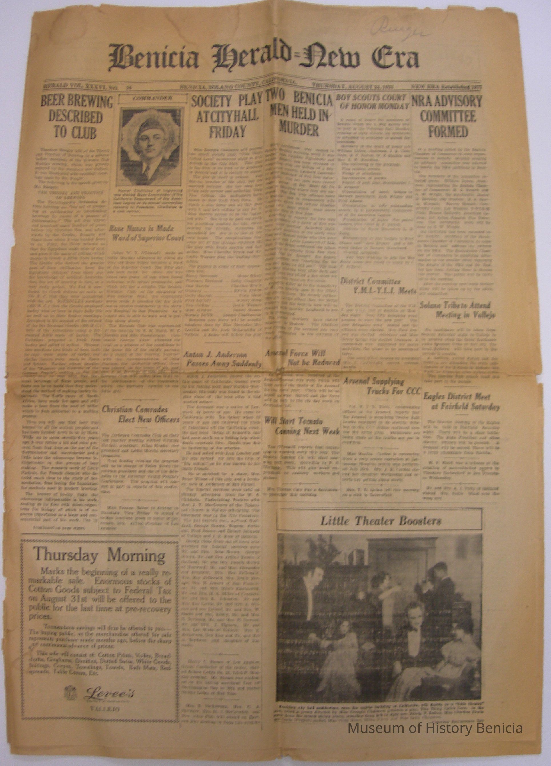 Benicia Herald=New Era Newspaper, Vol. XXXVI, No. 26. Thursday, August 24, 1933. This newspaper contains an article about Theodore Rueger describing the brewing of beer to a local club.