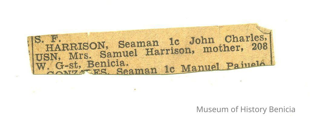 "HARRISON, Seaman 1c John Charles, USN. Mrs. Samuel Harrison, mother, 208 W. G - St. Benicia."