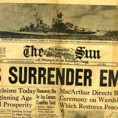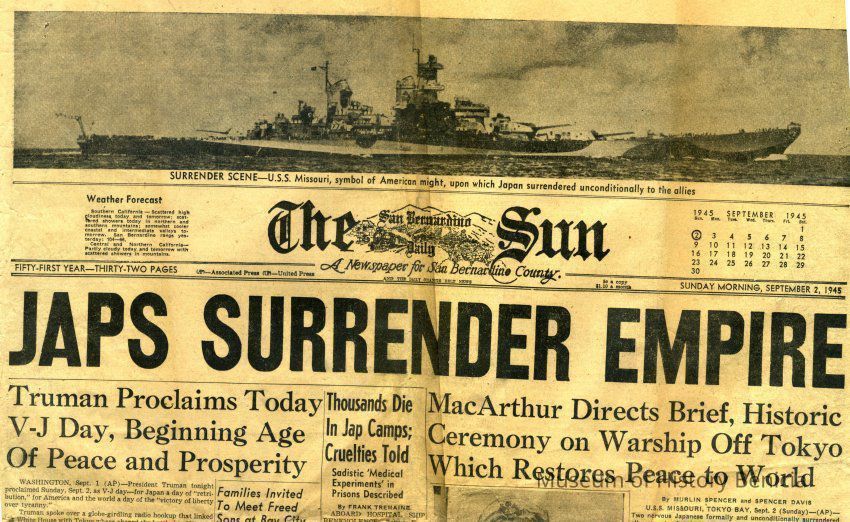The San Bernardino Sun newspaper from 09/02/1945 with the headline "Japs Surrender Empire". Has a large photo of the USS Missouri at the top of the front page.Collection