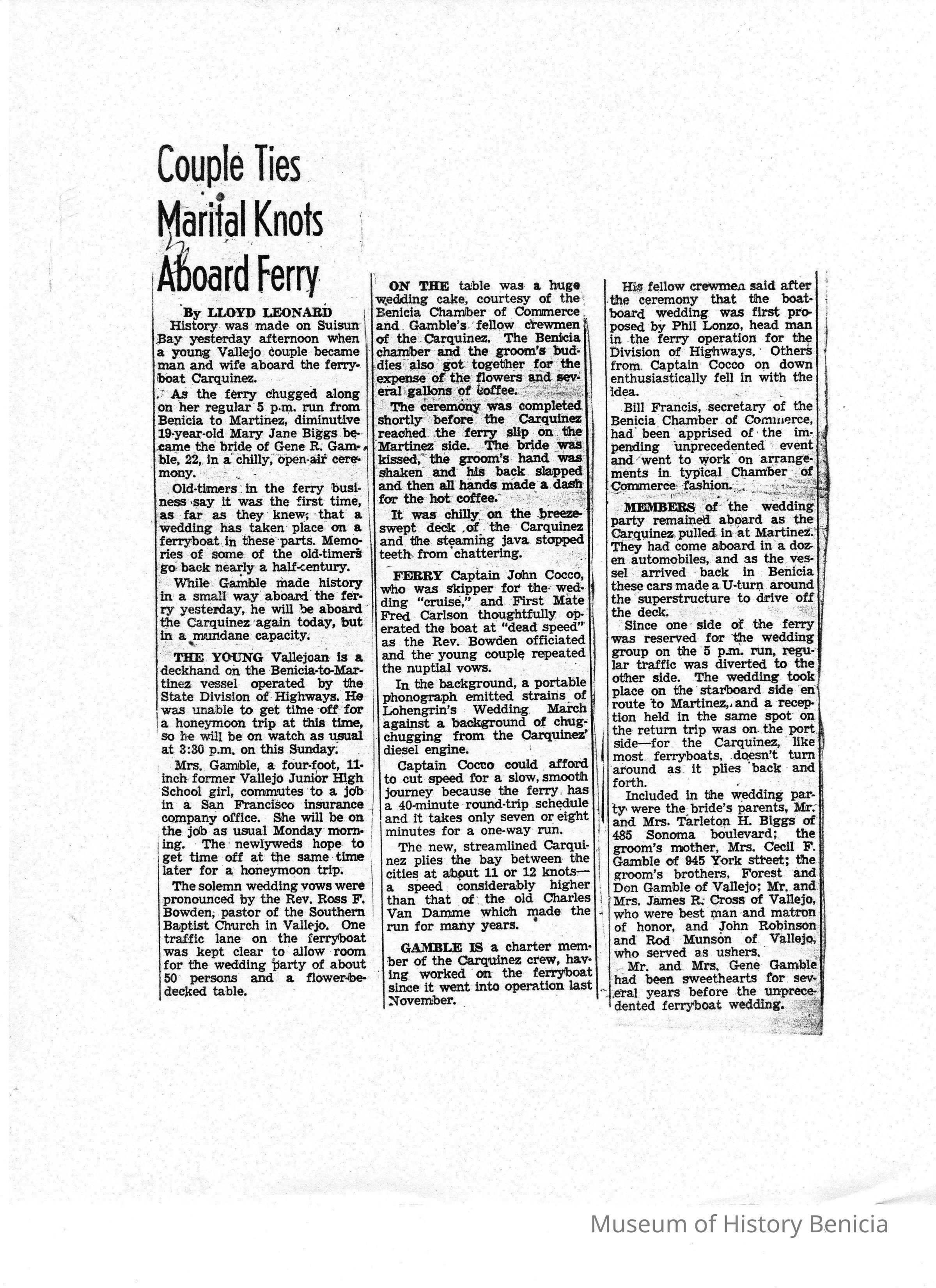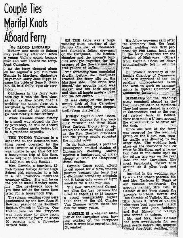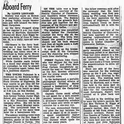 B/W photocopy of article entitled "Couple Ties Marital Knots Aboard Ferry," concerning the Aboard-the-'Carquinez' marriage of Gene Gamble and Mary Jane Biggs.Collection