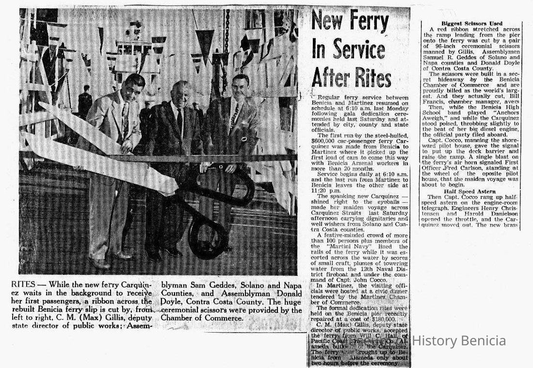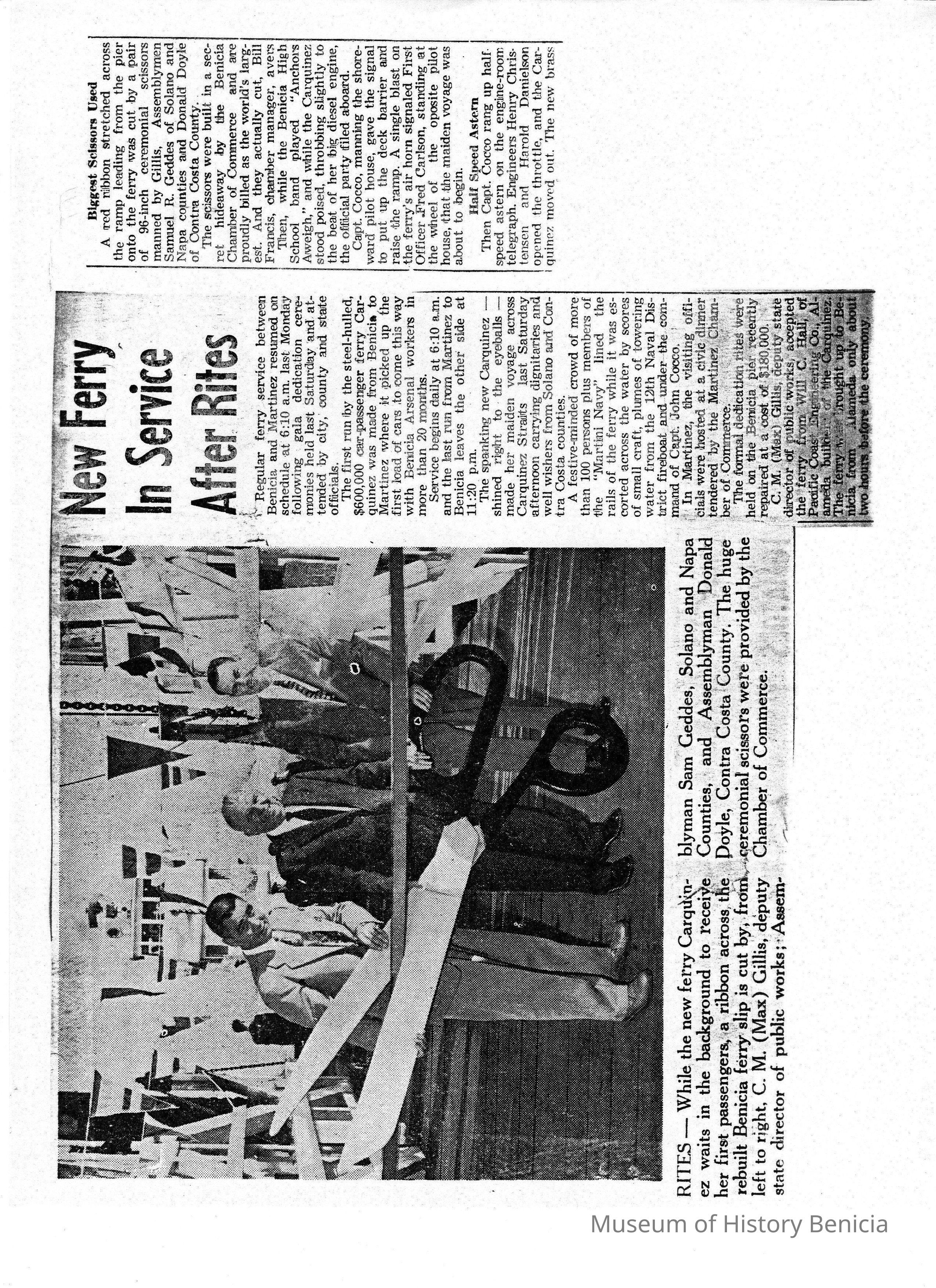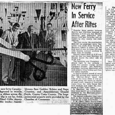 B/W photocopy "New Ferry in service after rites," about the dedication rites for the ferry 'Carquinez.' Photo and article. Three men are shown holding large scissors: left to right: C.M. (Max) Gillis, deputy state director of public works; Assemblyman Sam Geddes, Solano and Napa Counties, and Assemblyman Donald Doyle, Contra Costa County.Collection