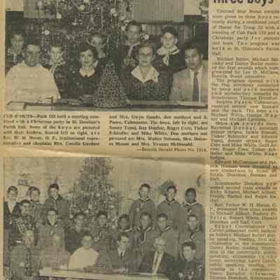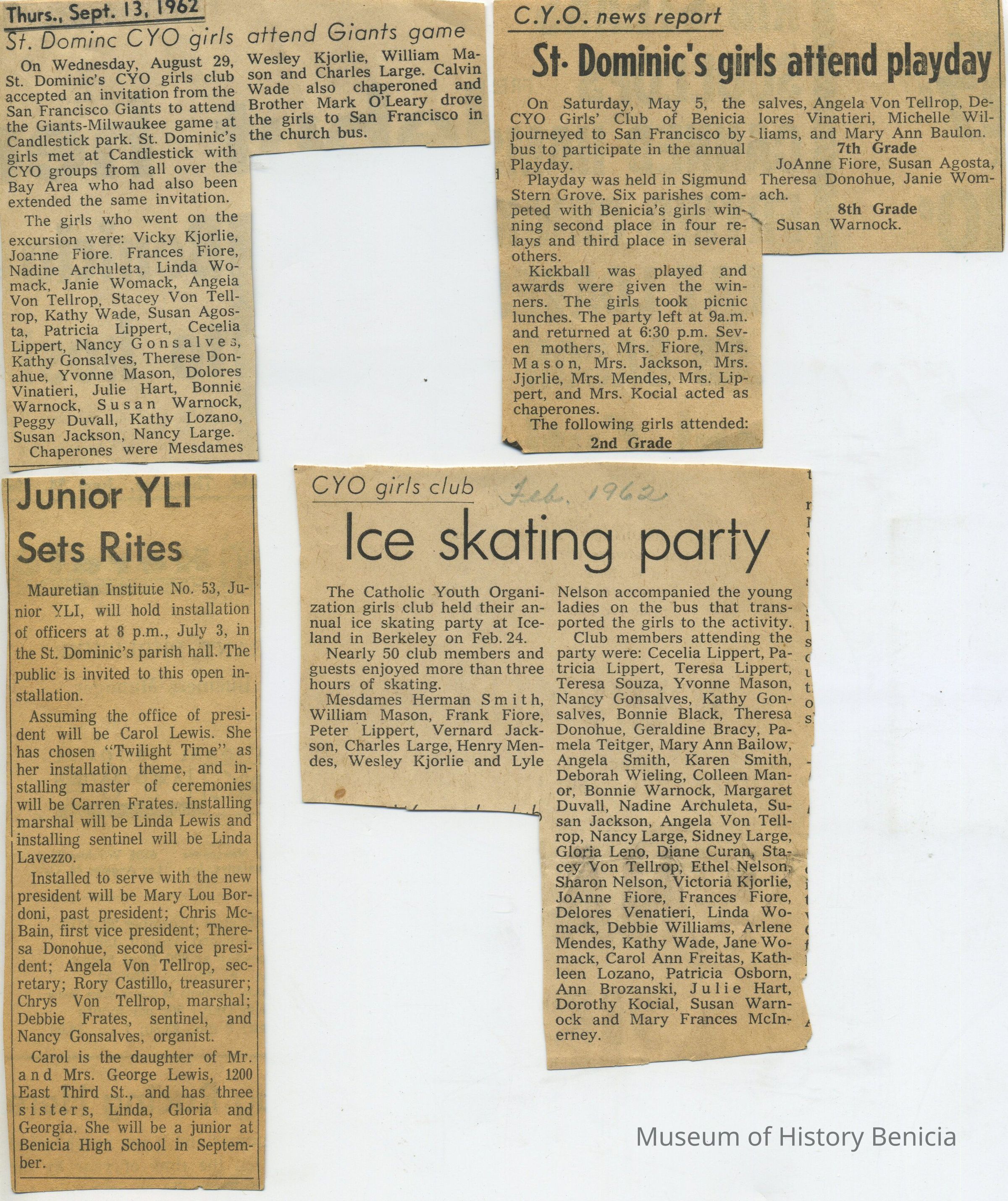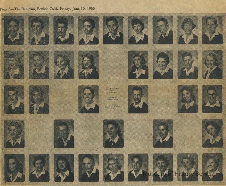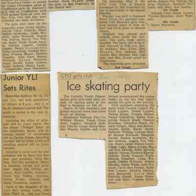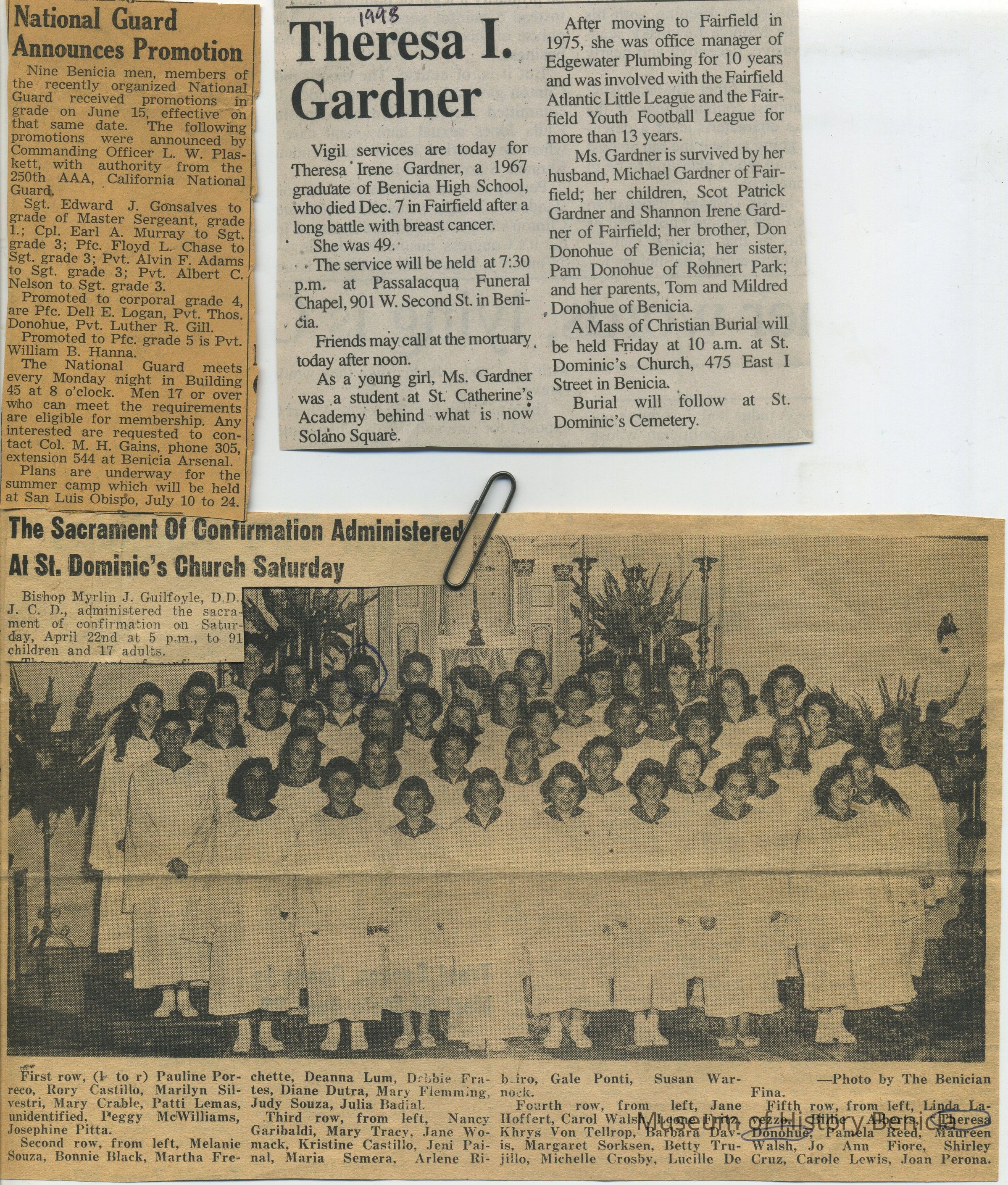Subjects include: Benicia National Guard (1950's), obituary for Theresa Gardner, Boy Scout Awards, St. Dominic's graduation 1960, Junior Y.L.I., St. Dominic's CYO Group (mid-1960's);