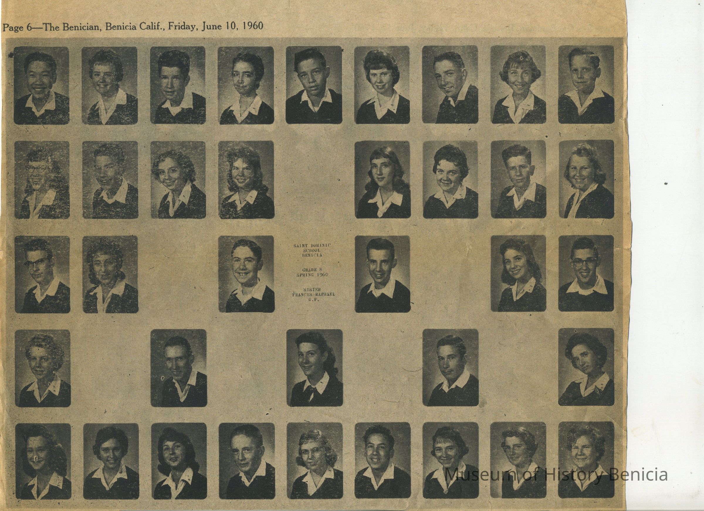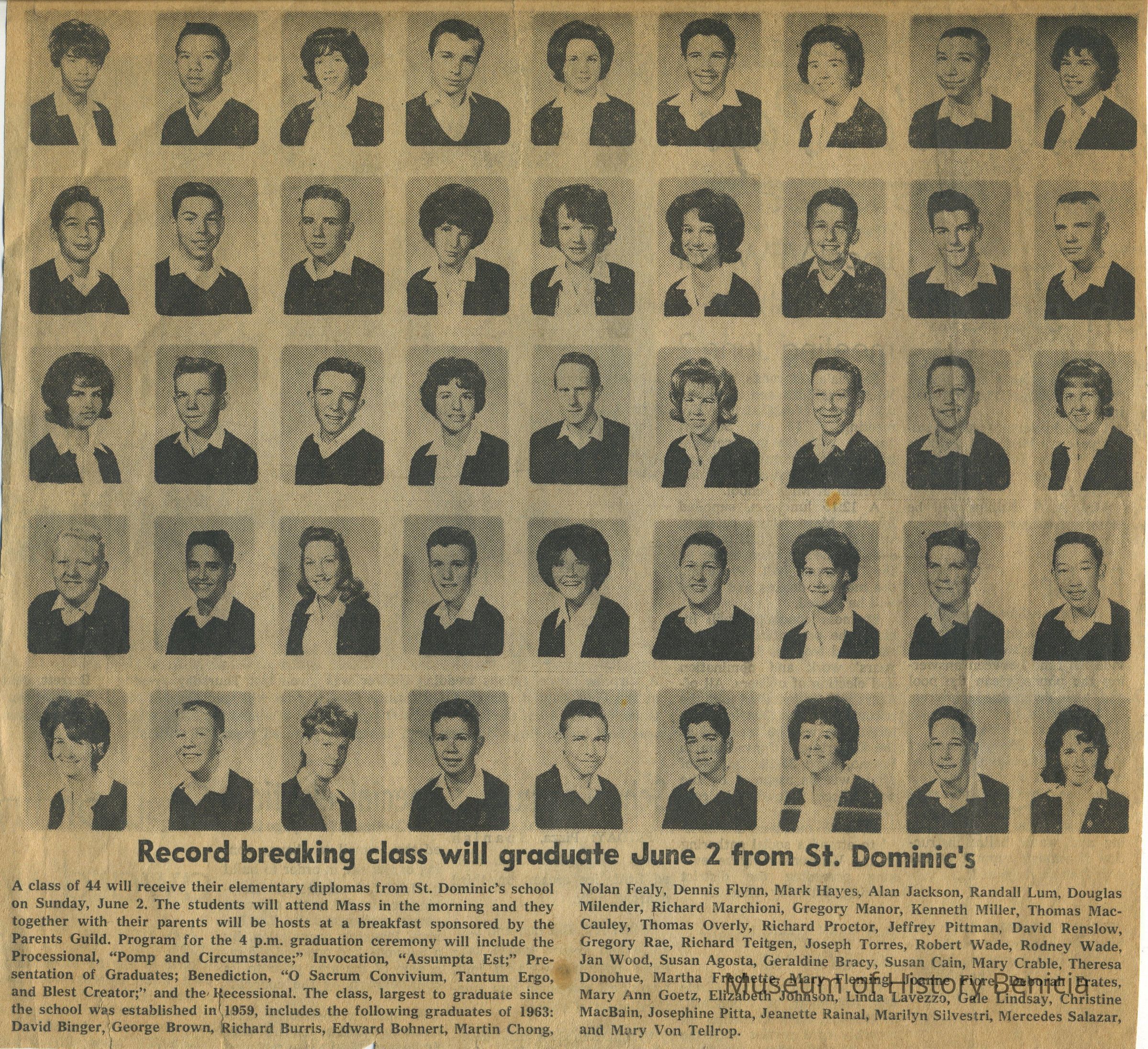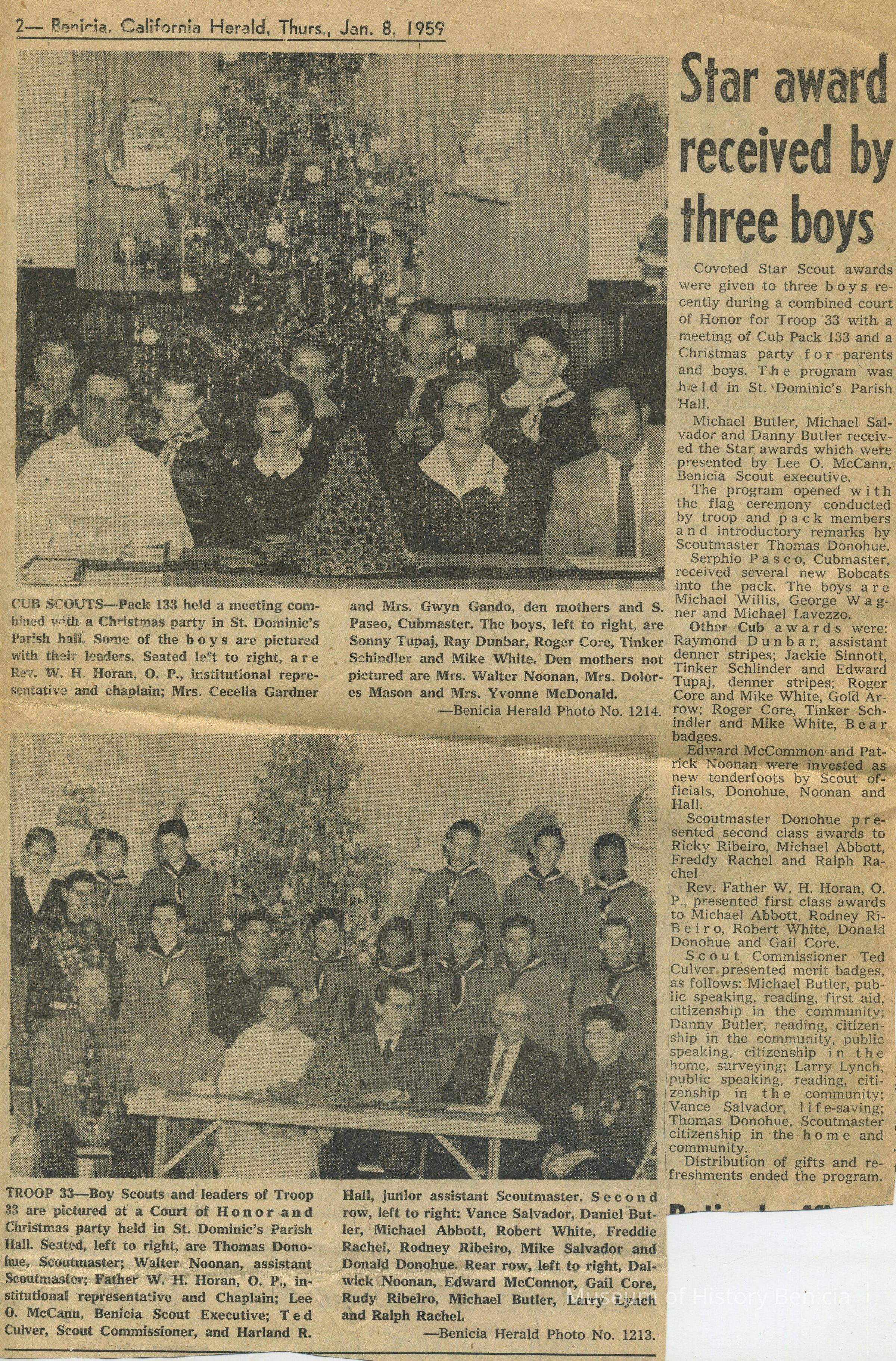 Subjects include: Benicia National Guard (1950's), obituary for Theresa Gardner, Boy Scout Awards, St. Dominic's graduation 1960, Junior Y.L.I., St. Dominic's CYO Group (mid-1960's);