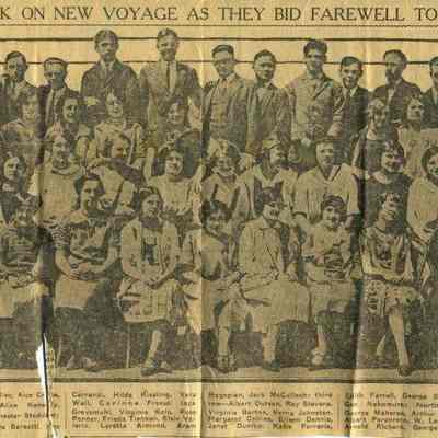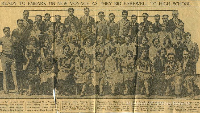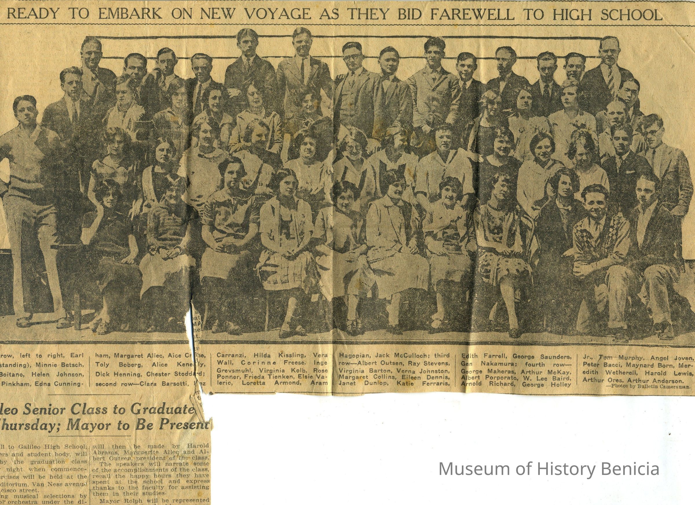 Newspaper article/photograph of the graduating Class of 1925 at Galileo High School, San Francisco; Headline: Ready to Embark on New Voyage as They Bid Farewell to High School. Among the group is Alice Mary Keneally, who married Raymond Rankin and lived in Benicia. She is ninth from the left in the front row.