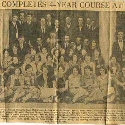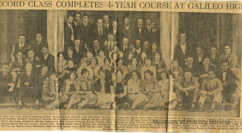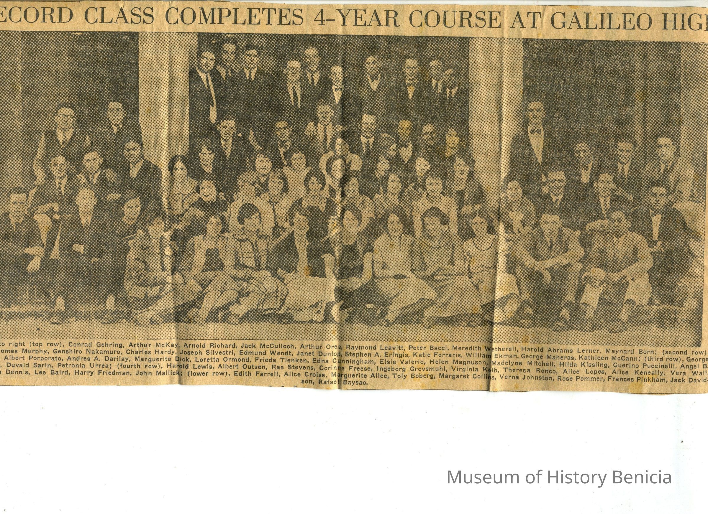 Newspaper article/photograph of the graduating Class of 1925 at Galileo High School, San Francisco; Headline: Record Class Completes 4-Year Course at Galileo High, from "The Daily News" (San Francisco); Alice Keneally, who later married Raymond Rankin and lived in Benicia, is ninth from the left in the second row from the front.