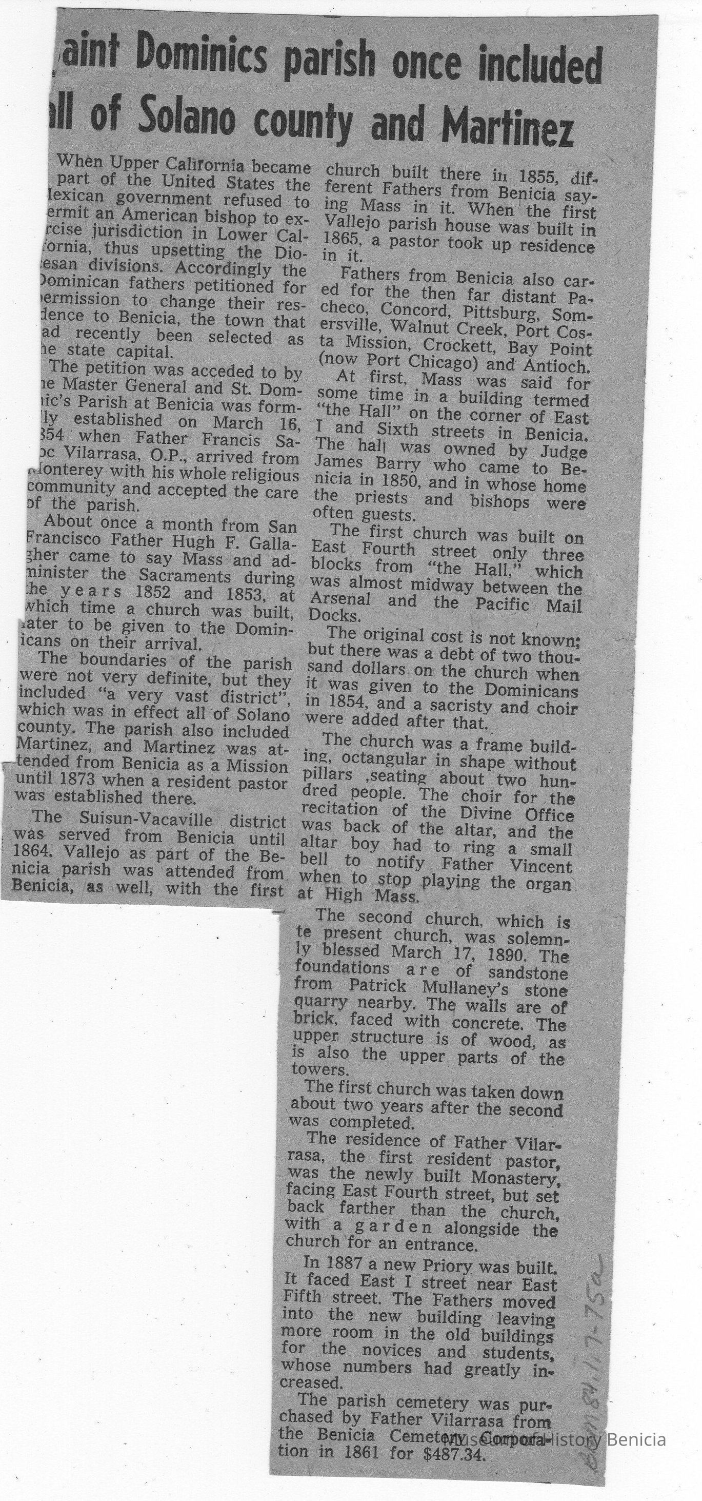 An undated newspaper article with the headline "Saint Dominics parish once included all of Solano county and Martinez".