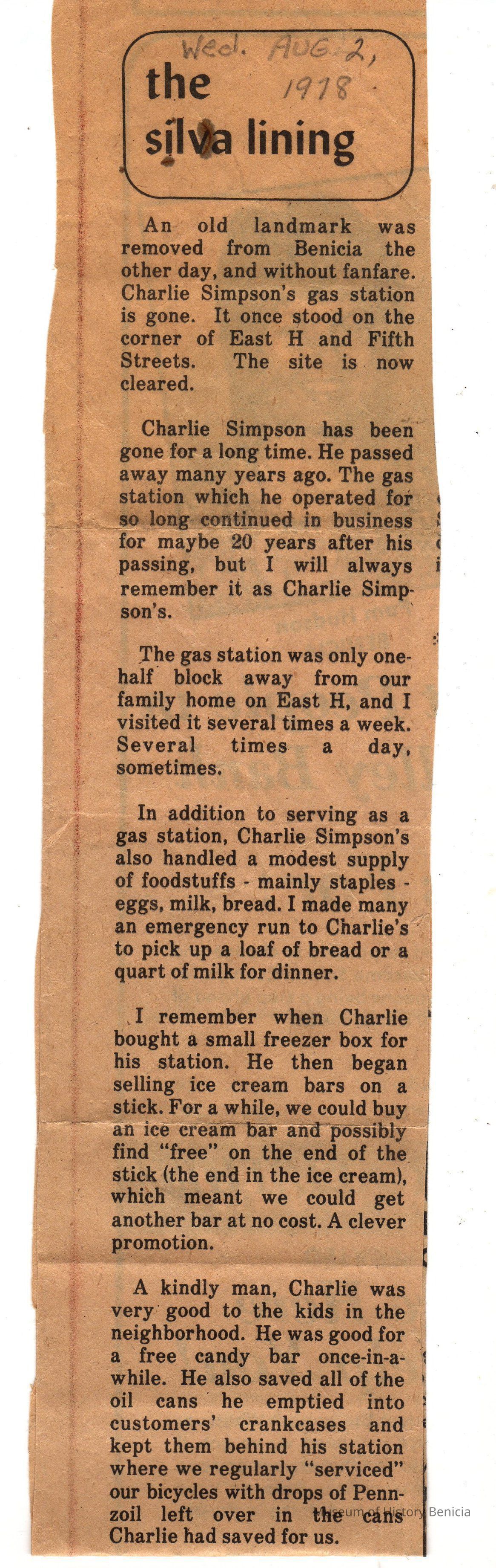 newspaper column "The Silva Lining" by Bob Silva, which appeared in the Benicia Herald on a regular basis, dated Wednesday, August 2, 1978 about Charles Simpson Sr. garage