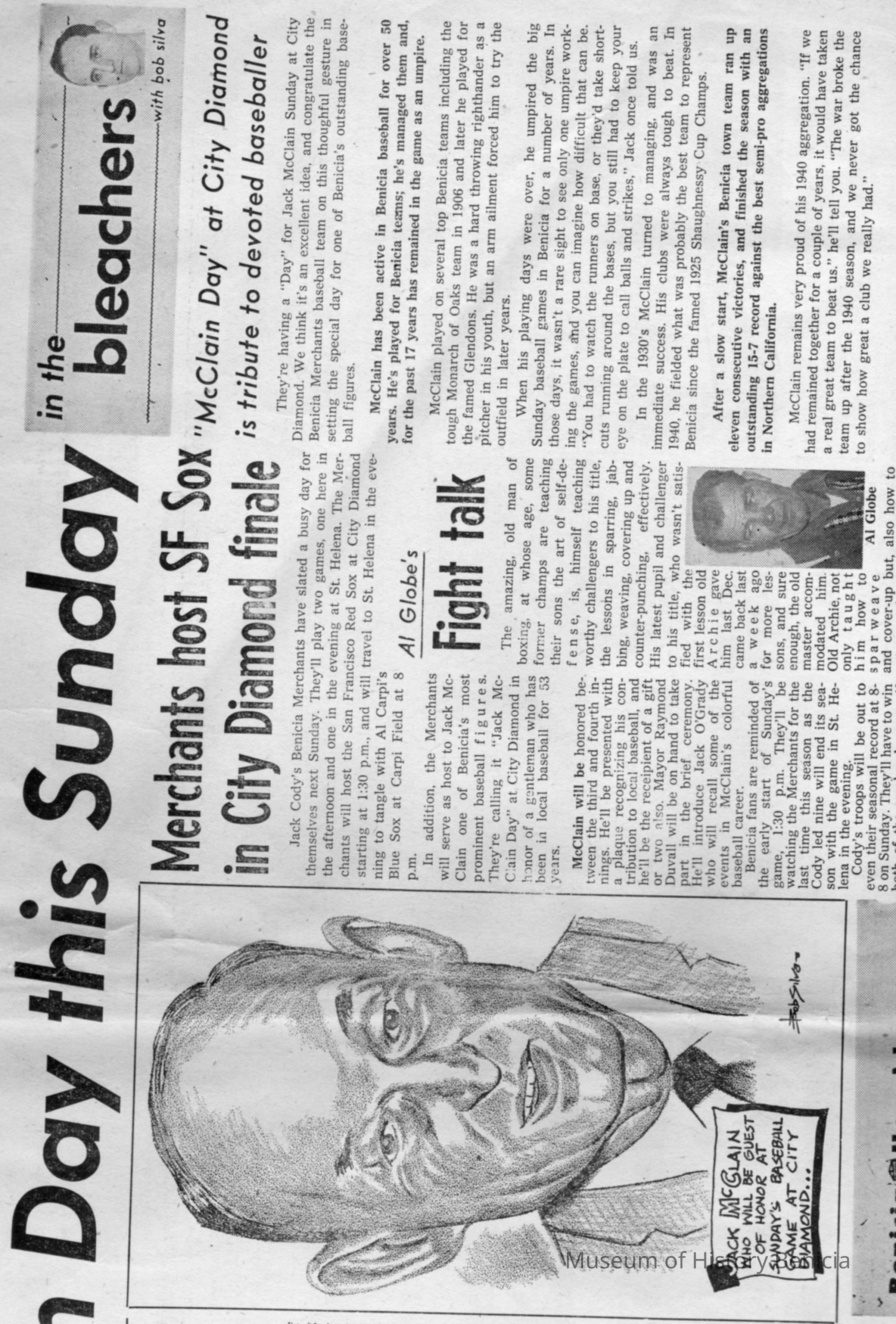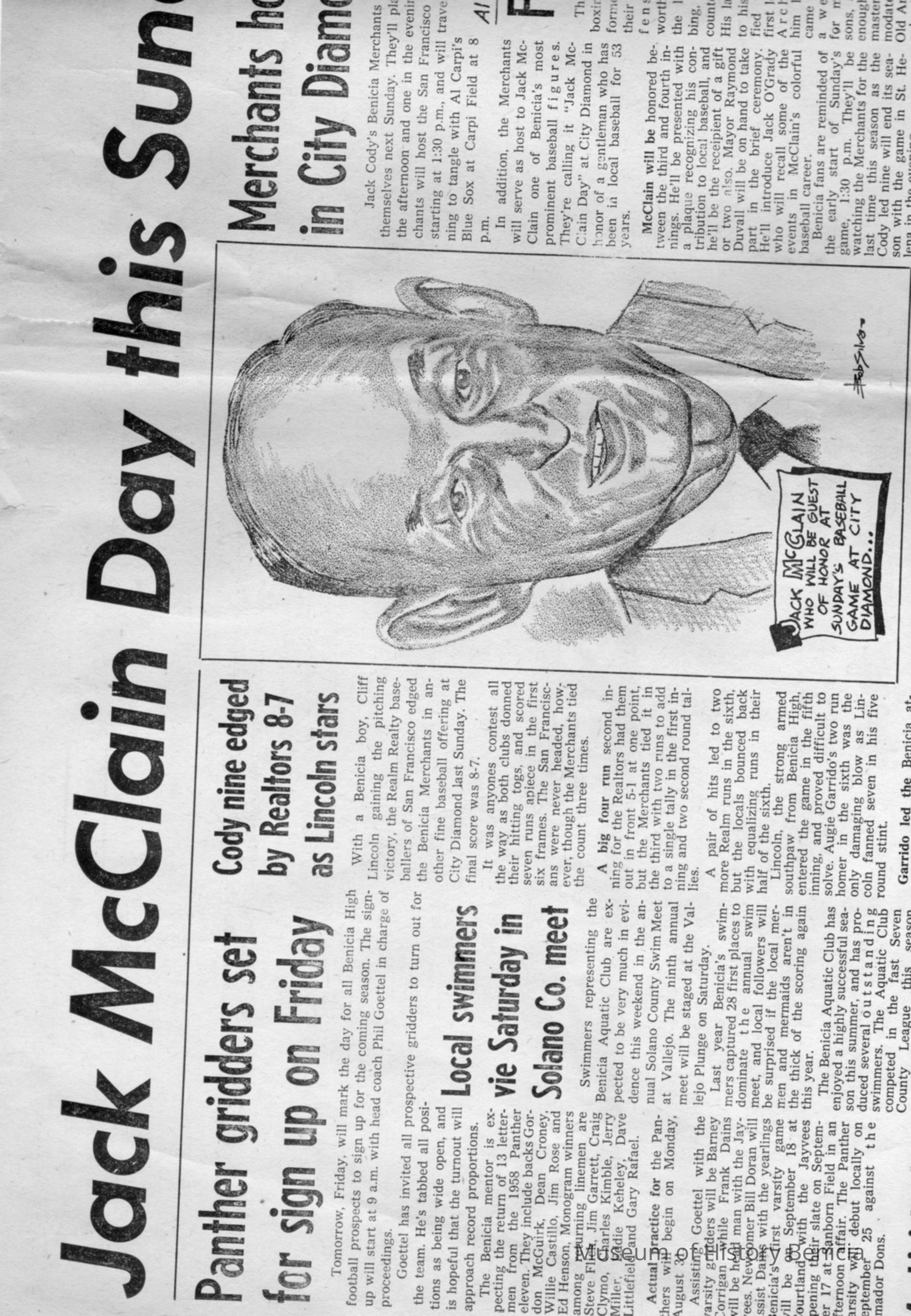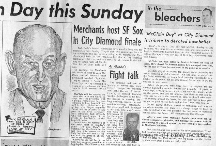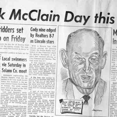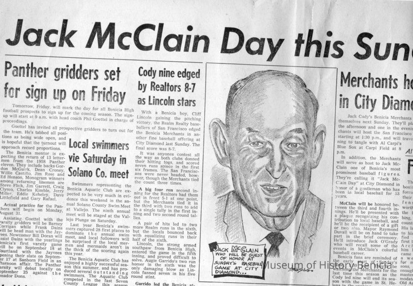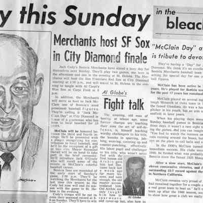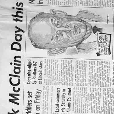 Newspaper article from The Benicia Hearld of 08/27/1959 , announcing "McClain Day" in Benicia to honor Jack McClain local baseball star and umpire/ Played on Monarch of Oaks team in 1906.Collection