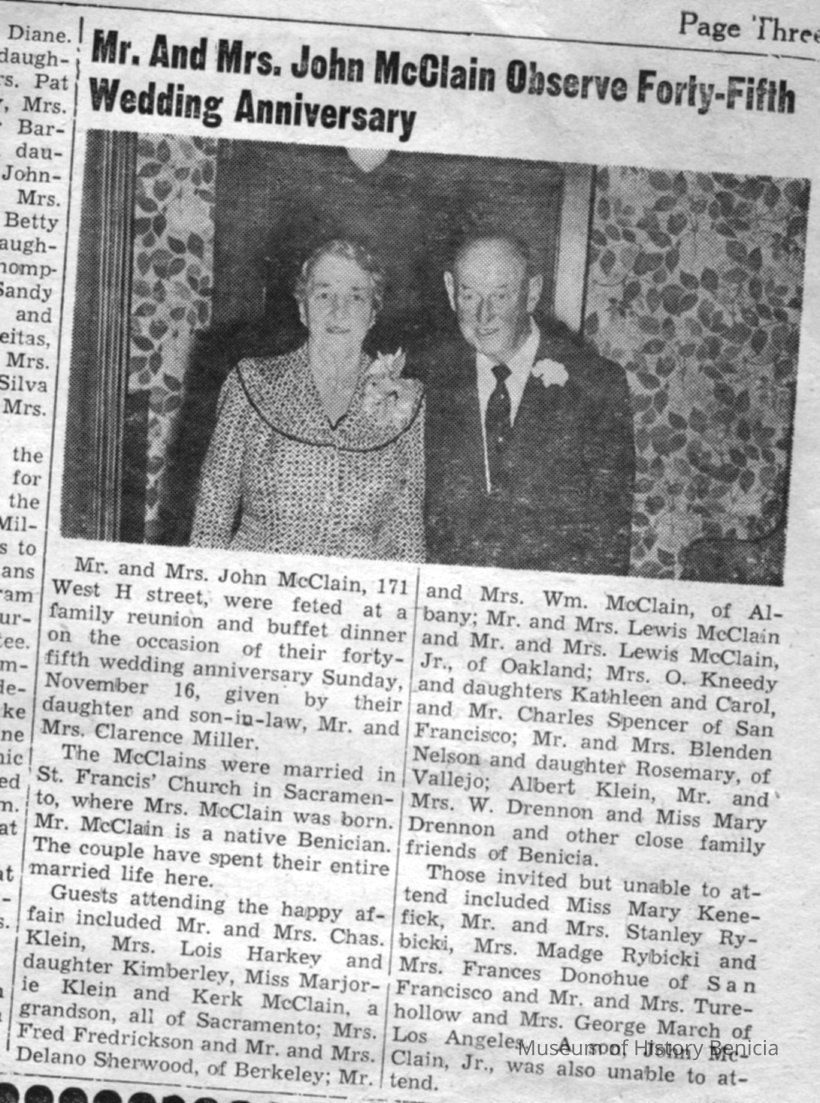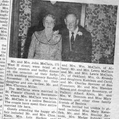 Newspaper article from The Benician of 11/22/1957 , the 45th anniversary of Mr & Mrs John McClain.