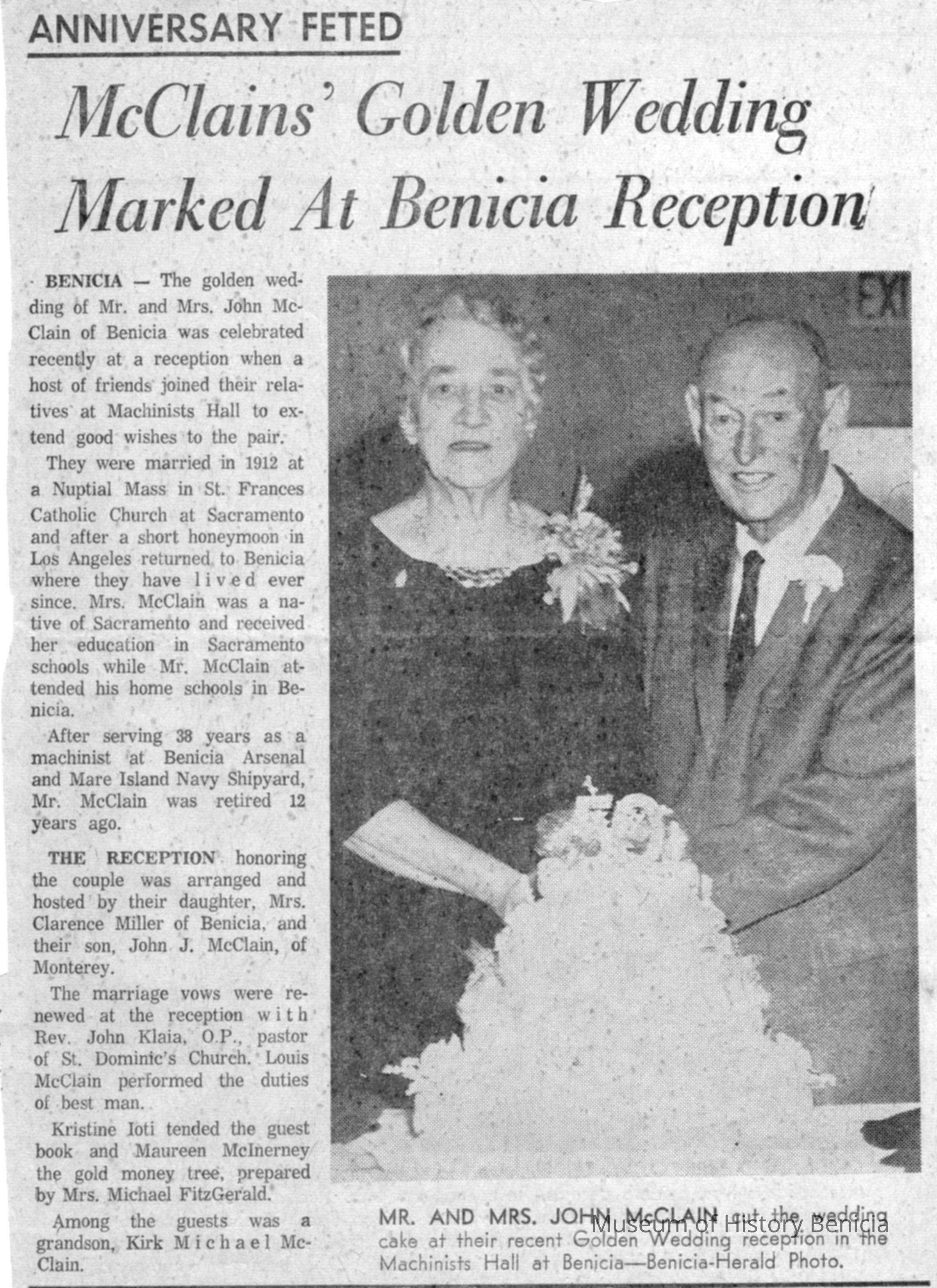Newspaper article from Vallejo Times Herald newspaper of 1962 (even though date stamped on one copy says 01/06/1963) about the 50th wedding anniversary of Mr & Mrs John McClain.Collection