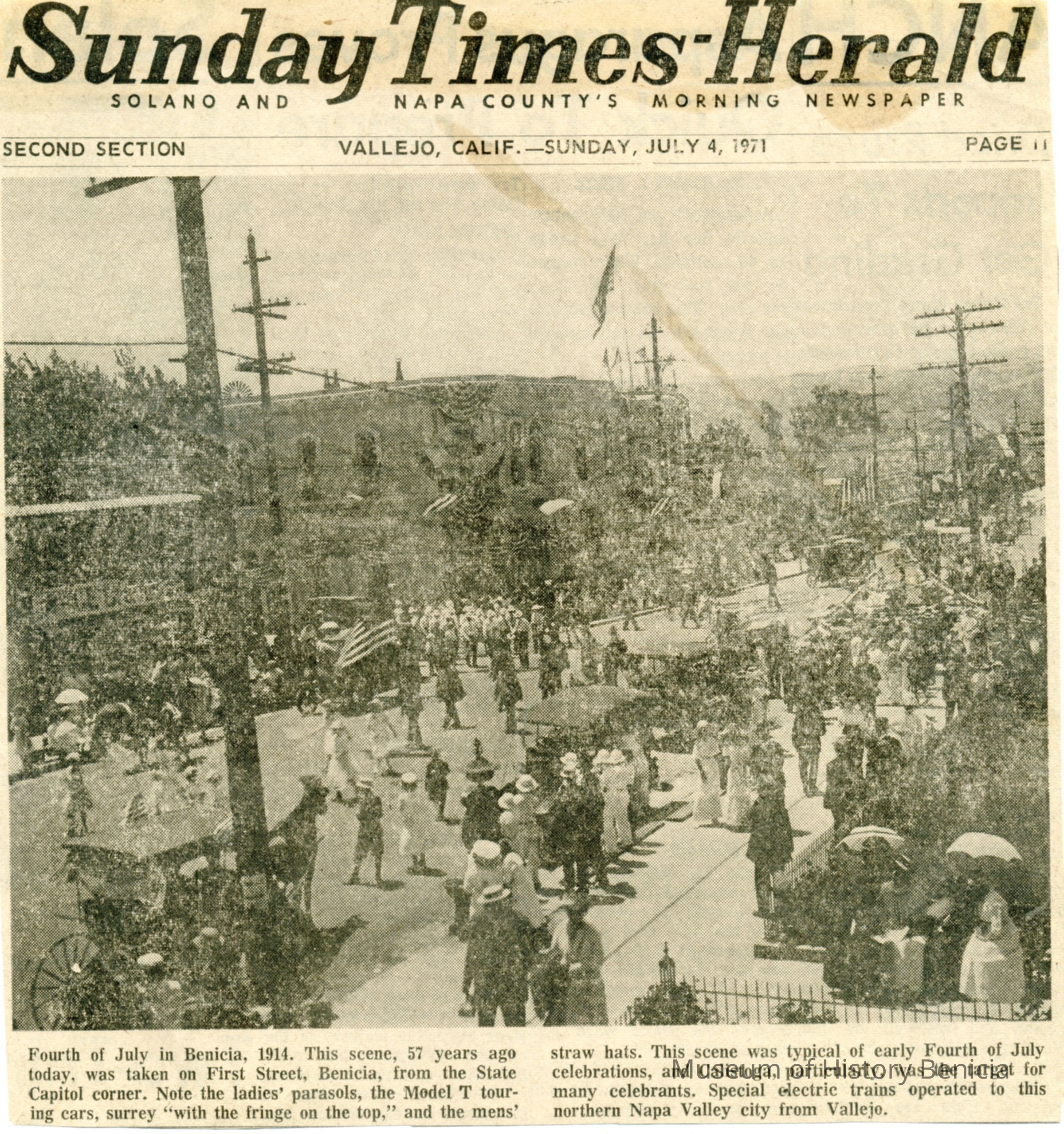 This is a newspaper clipping from the Sunday Times Herald of 07/04/1971. It shows an old photo of Benicia First Street and a Fourth of July parade. The caption says it is from 1914.Collection
