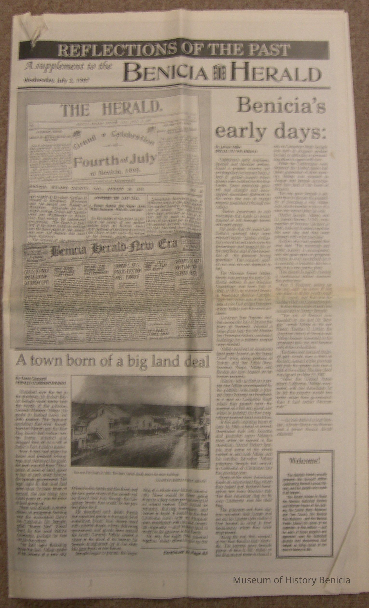 Newspaper Supplement to the Benicia Herald on Wednesday, July 2, 1997 in celebration of the 150th Anniversary of Benicia's founding. Reflections of the Past includes the following articles (some old, some new): "Benicia's Early Days", "A Town Born of a Big Land Deal", "Benicia Sprang from the Bear Flag Revolt", "Gardens Springing up all over Town" (February 16, 1856), "Recollections of St. Paul's", "Boomtown Turns into Hometown", "Rip-roaring Town Had Its Share of Characters - Benicia in the 1890's", "A Section of the Front Page of 'The Herald' dated June 10, 1899", "A Full Page of the 'California Signal' dated May 31, 1895", "A Full Page of 'The Herald dated July 2, 1898", "Editor's column by A. Dalton Jr., Editor 'The New Era of Benicia', March 26, 1892", "A Full Page of 'The New Era of Benicia dated January 2, 1897", "Volunteer Firemen Guarded Benicia's Safety" (with pictures from the 1860's of fires in Benicia and firemen pulling a hose cart), and also advertisements from various businesses congratulating Benicia on its "Birthday".