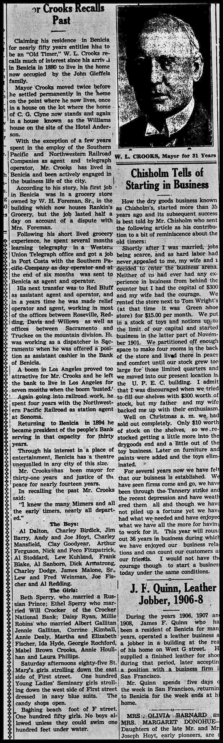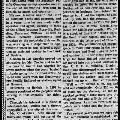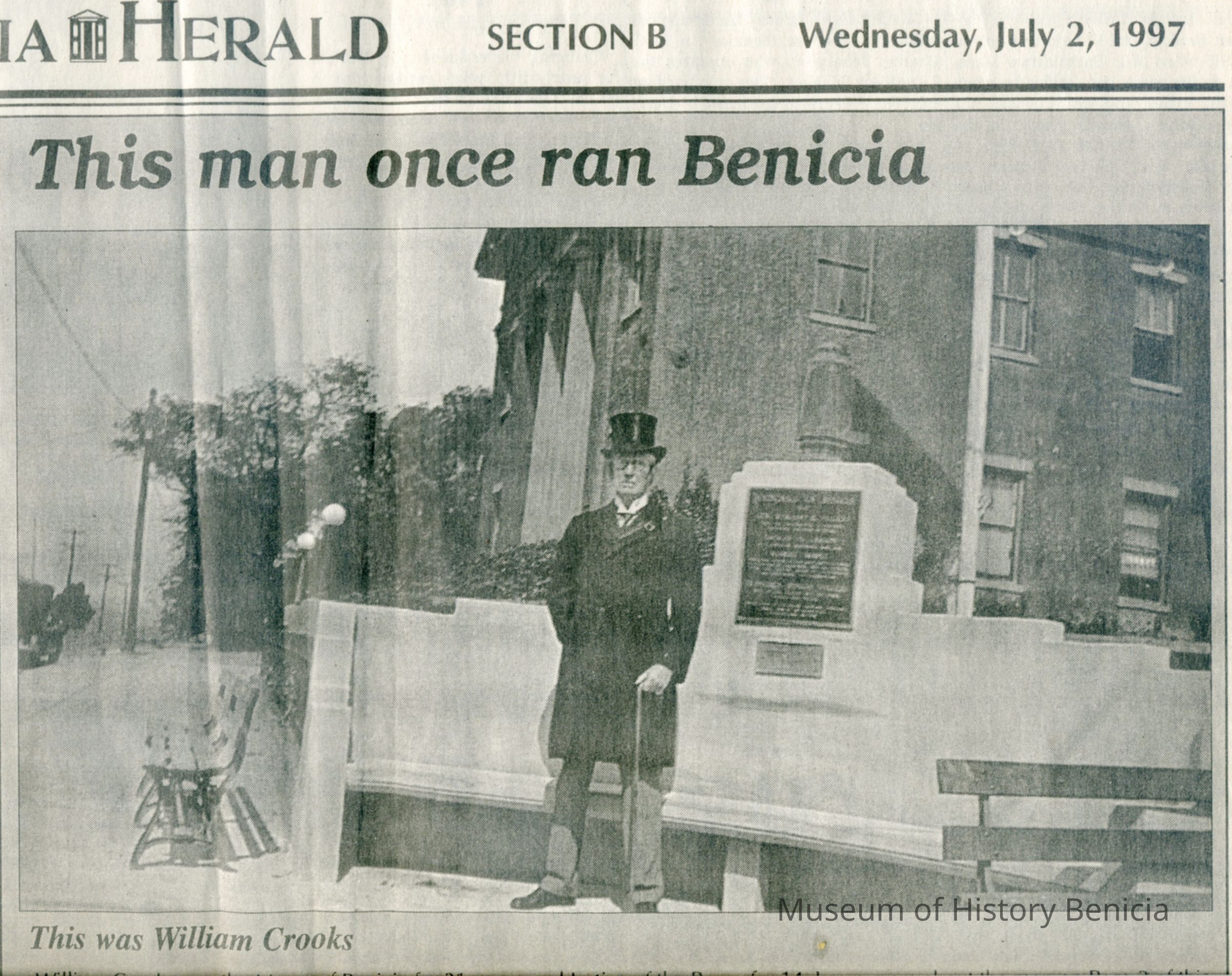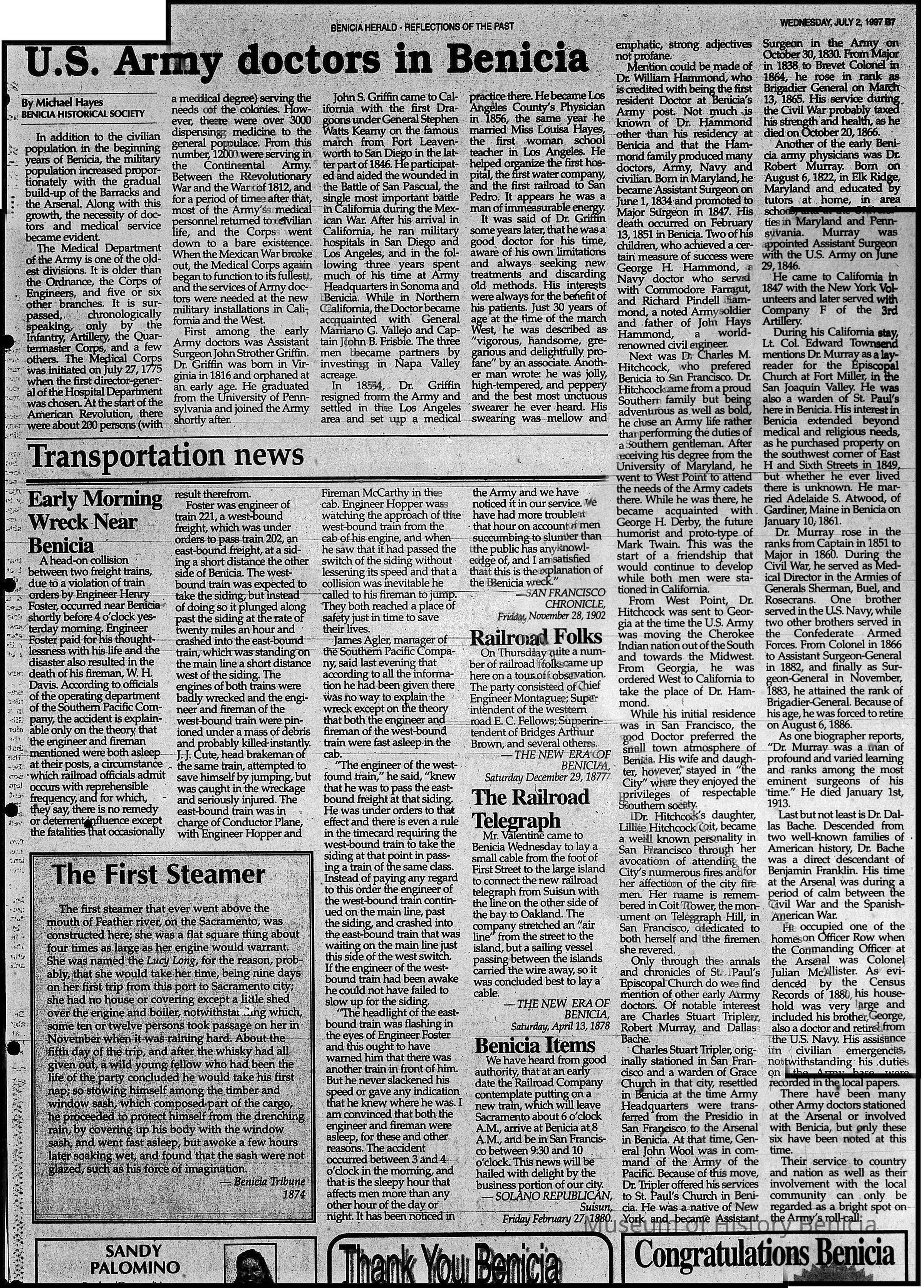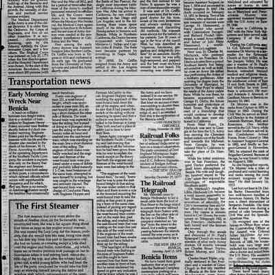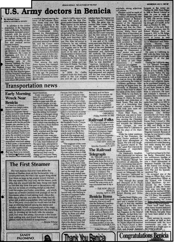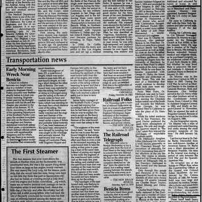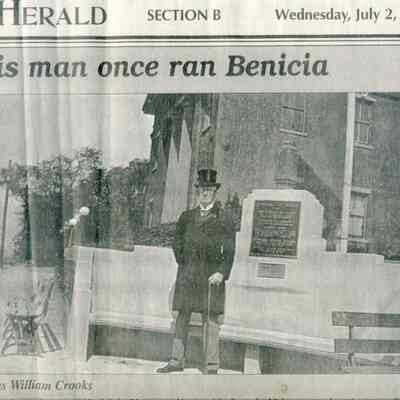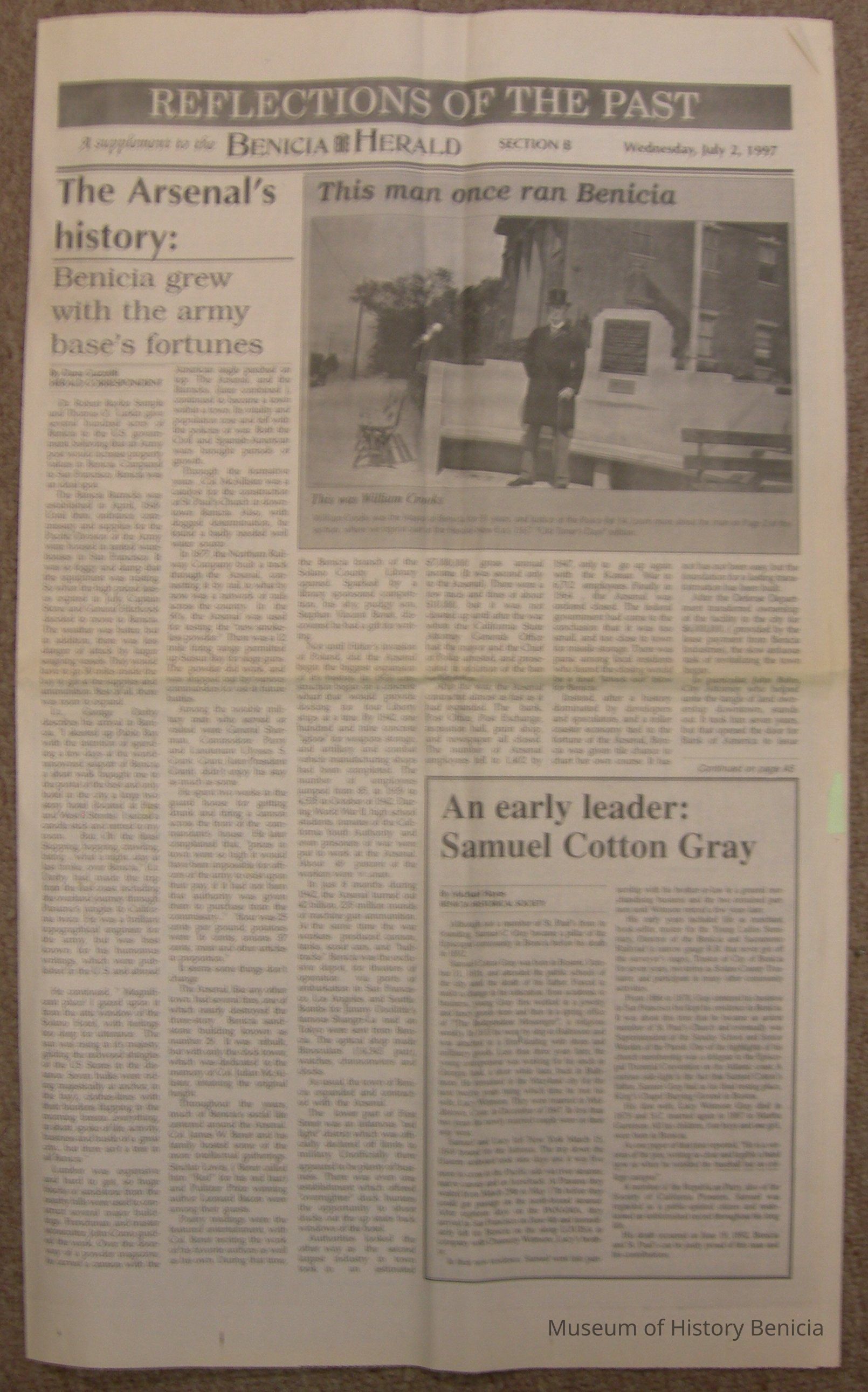 Newspaper Supplement to the Benicia Herald on Wednesday, July 2, 1997 in celebration of the 150th Anniversary of Benicia's founding. Reflections of the Past includes the following articles (some old, some new): "The Arsenal's History - Benicia Grew With the Army Base's Fortunes", Photo of William Crooks (1937) caption 'This Man Once Ran Benicia', "An Early Leader, Samuel Cotton Gray", Information on various leaders: M. Passalacqua, Chas Johansen, Mr. Chisholm, J.F. Quinn, T. Wright, Dr. H.C. White, "Public Schools in Benicia - Rough Times for Schools as Many Kids Worked", "Flour Mills were Big Business in Benicia", "When Port Costa was called South Benicia" ('The New Era of Benicia' 1879), "This Old House is Among Oldest in Benicia" w/1939 photo, 717 West Second St.), "Dominican & Mills Colleges Founded Here - They Came but They Didn't Stay", "A Full Page of the 'Benicia Herald = New Era' dated December 14, 1939", "U.S. Army Doctors in Benicia", Transportation News: "Early Morning [train] Wreck Near Benicia" (S.F. Chronicle November 28, 1902), "The First Steamer", "Railroad Folks" and "The Railroad Telegraph", The Sporting Life: "The O'Briens Defeated" (baseball) and "Sports Always Big News".