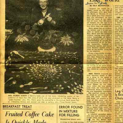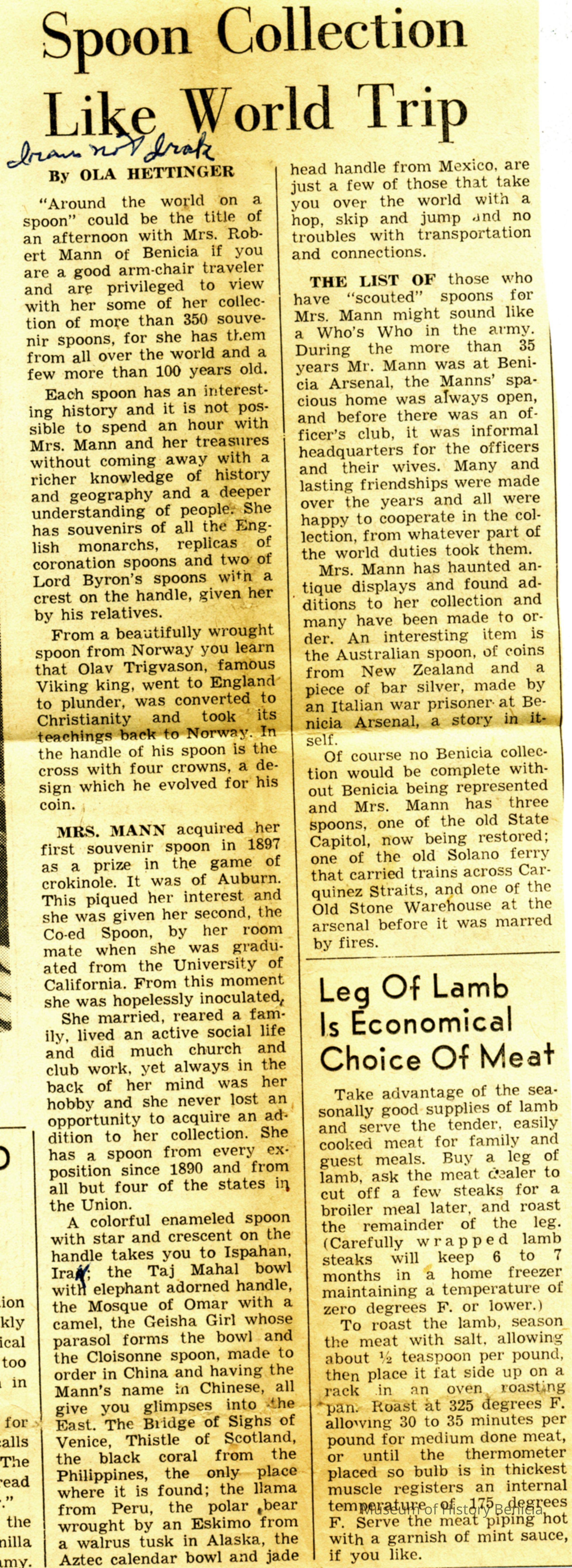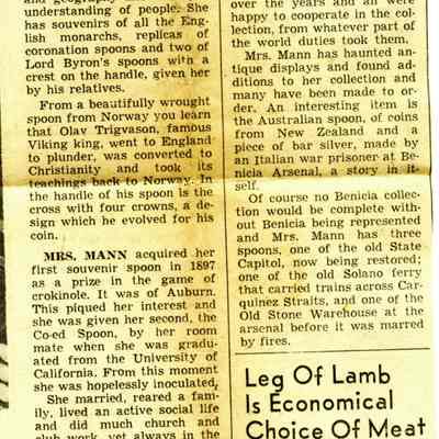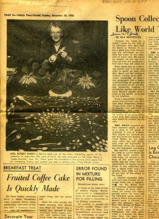 This is a newspaper artcle from the Vallejo Times Herald of 12/30/1956. It talks about the Myrtle Mann spoon collection and shows a photo of Myrtle Mann with her collection of "more than 350 spoons". (The notebook that Mrs. Mann kept lists over 600 spoons.)Collection