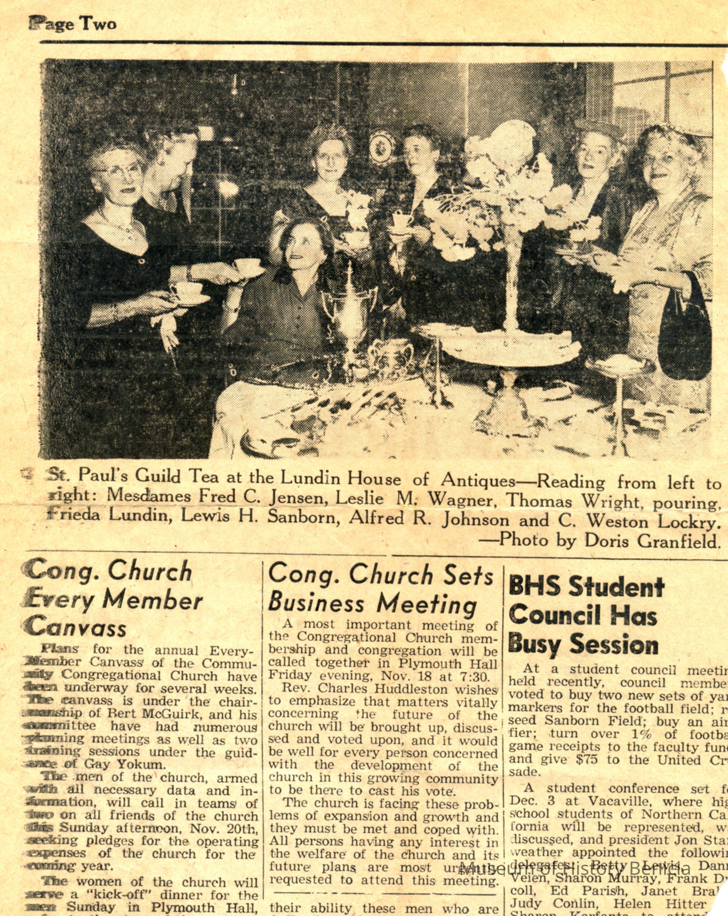 Newspaper photograph showing the ladies at St. Paul's Episcopal Guild Hall tea. Included in the photo are: Mesdames -