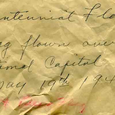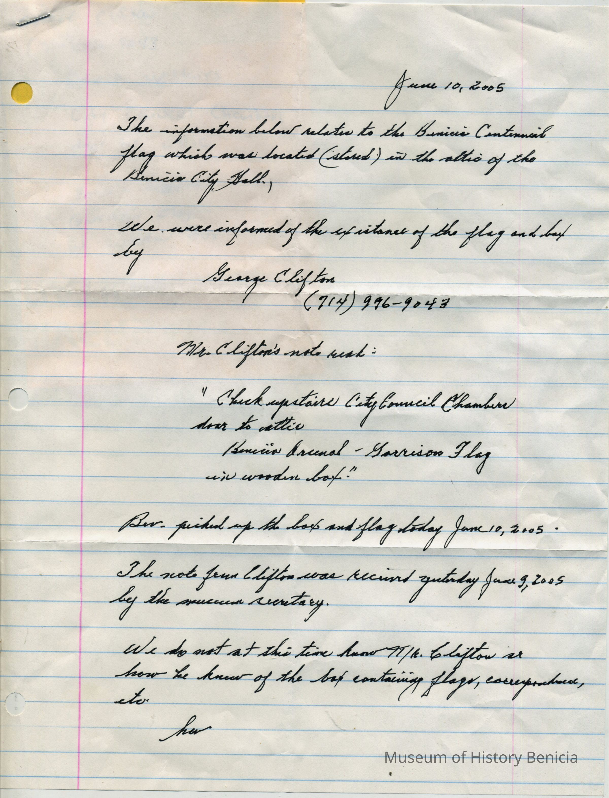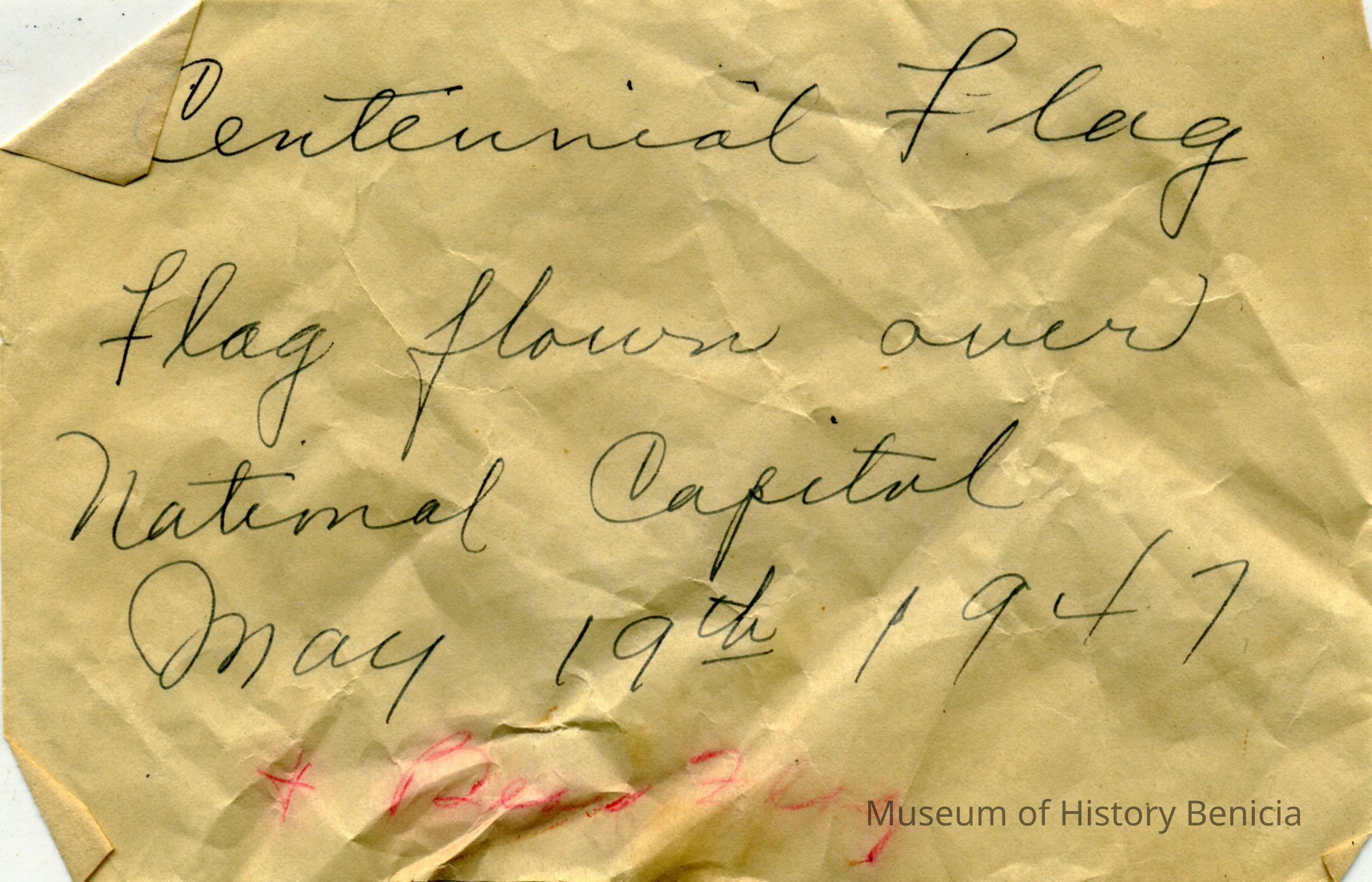 These are the notes that were taken at the time the box with the 1947 flag(s) were received from the City of Benicia. The long note is Harry Wassmann's note on who told the Museum about the box and the older small note was probably inside the box.Collection