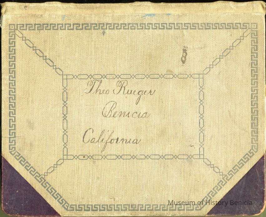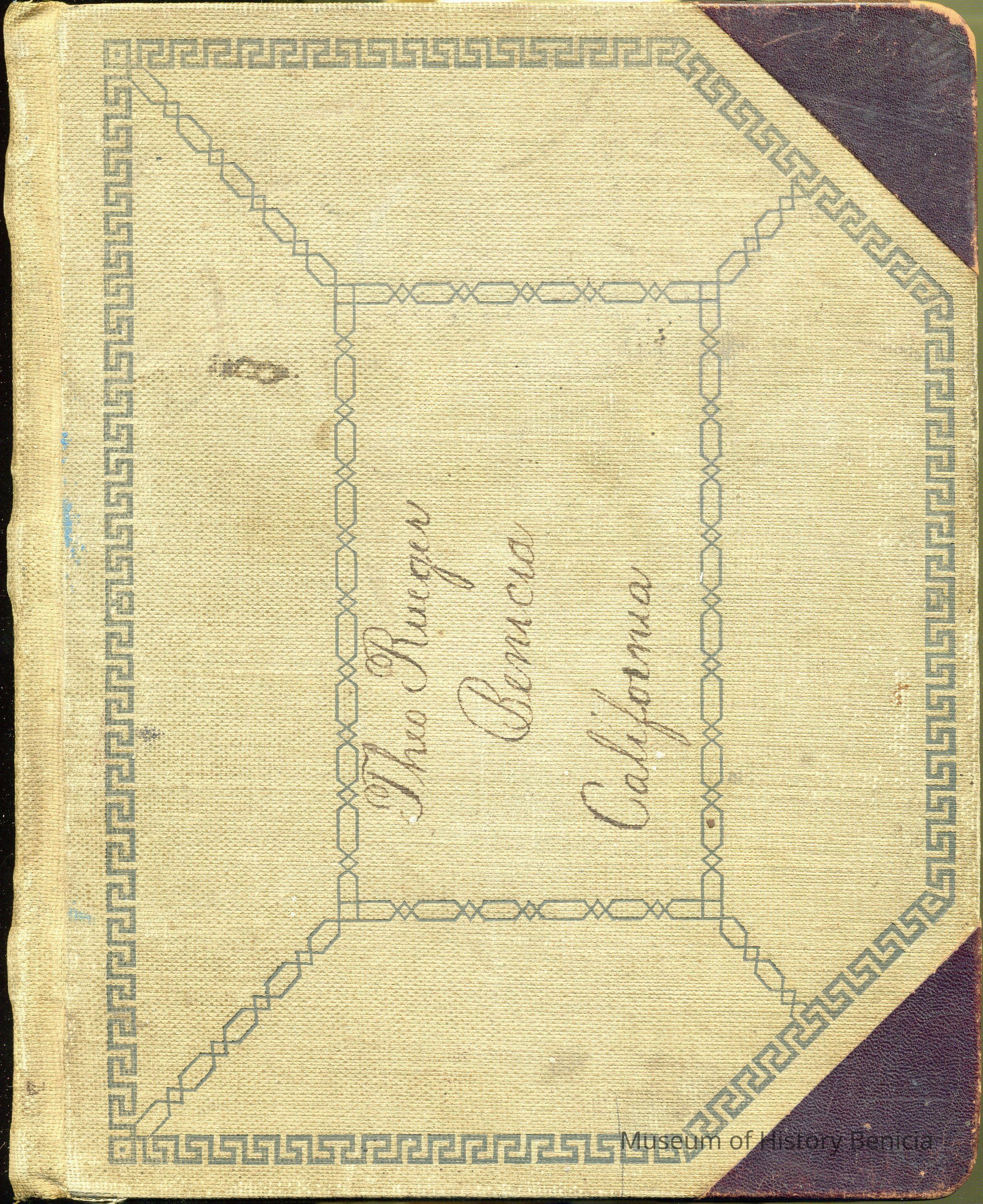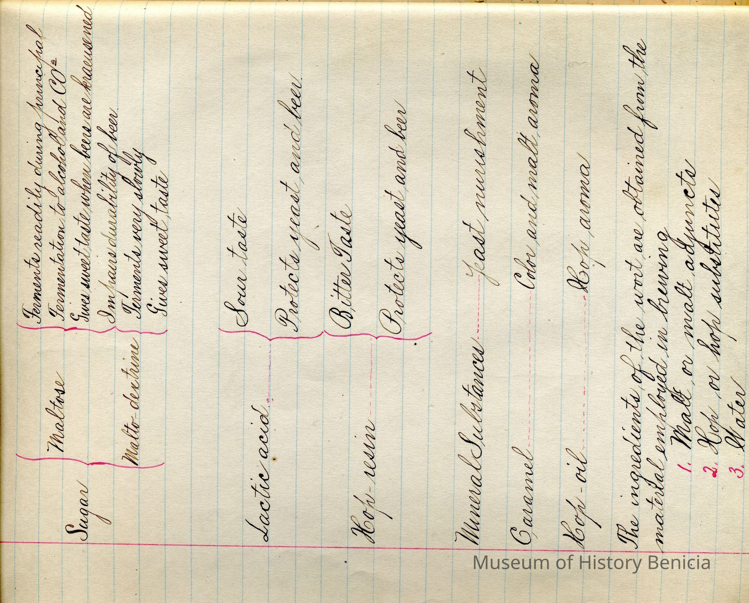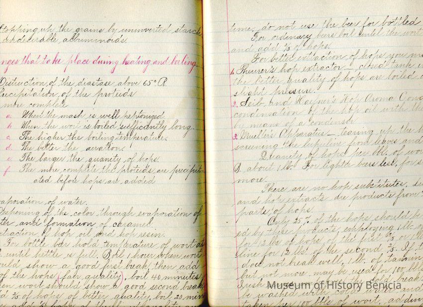 Bound notebook with "Theo. Rueger Benicia California" written on the front cover. Inside there are notes on the subject of the "Routine of Brewing" beer. Inside the notebook is written near the spine of the book is
