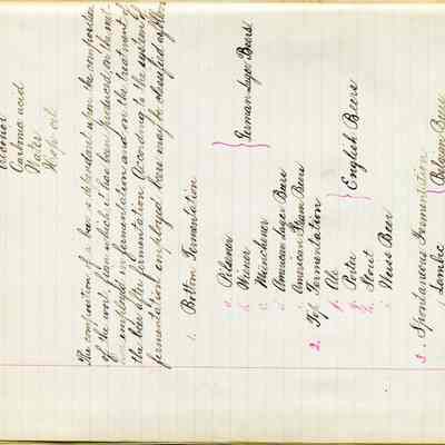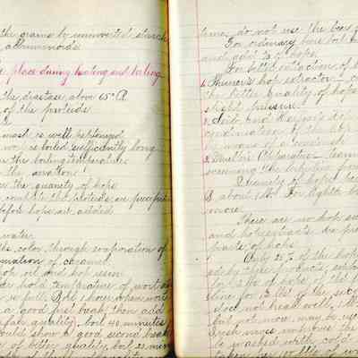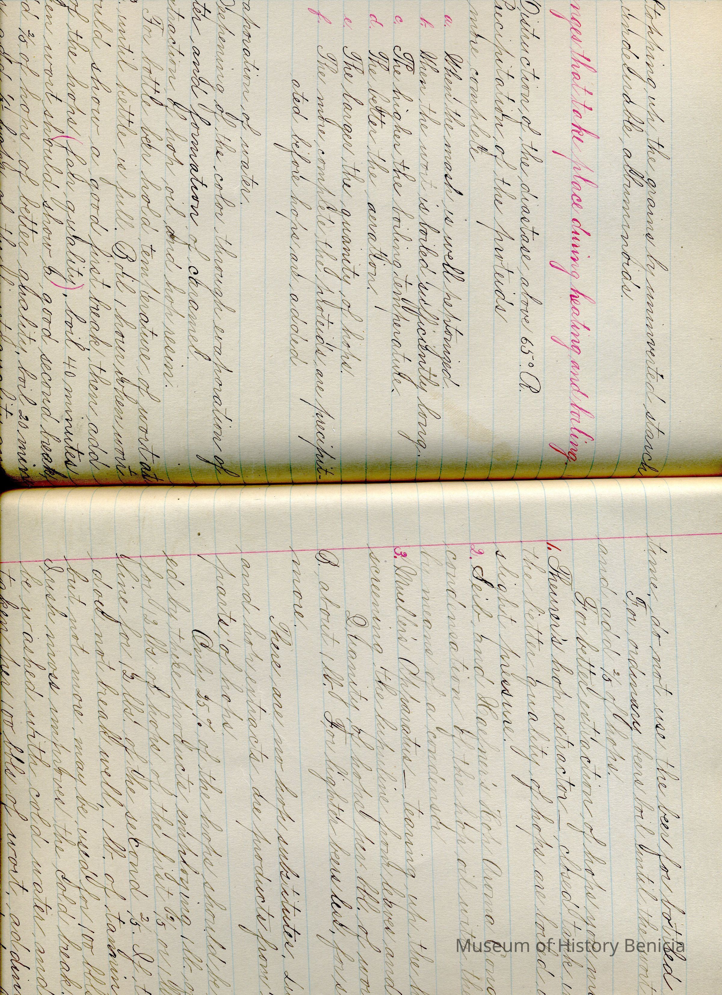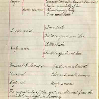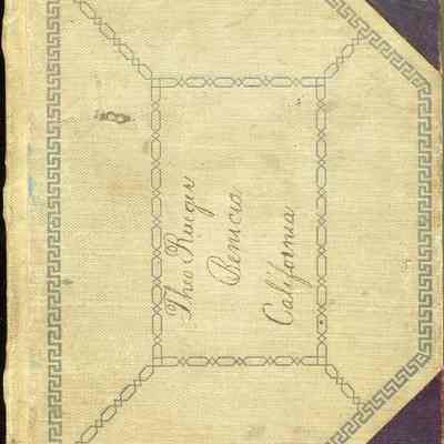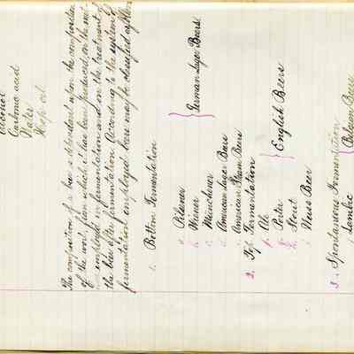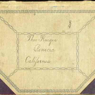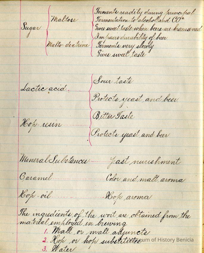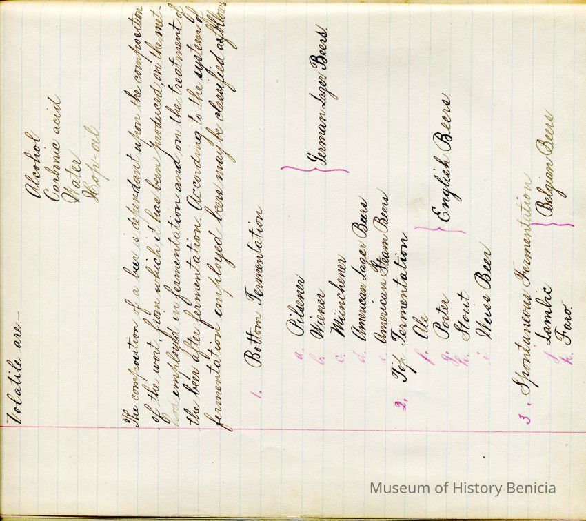 Bound notebook with "Theo. Rueger Benicia California" written on the front cover. Inside there are notes on the subject of the "Routine of Brewing" beer. Inside the notebook is written near the spine of the book is