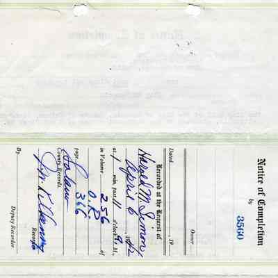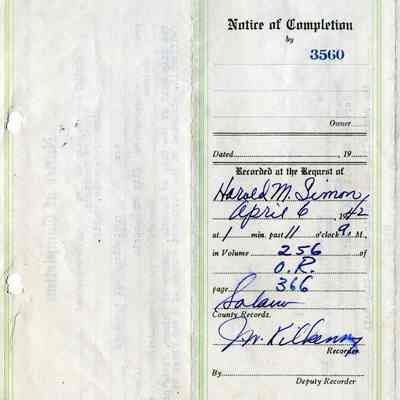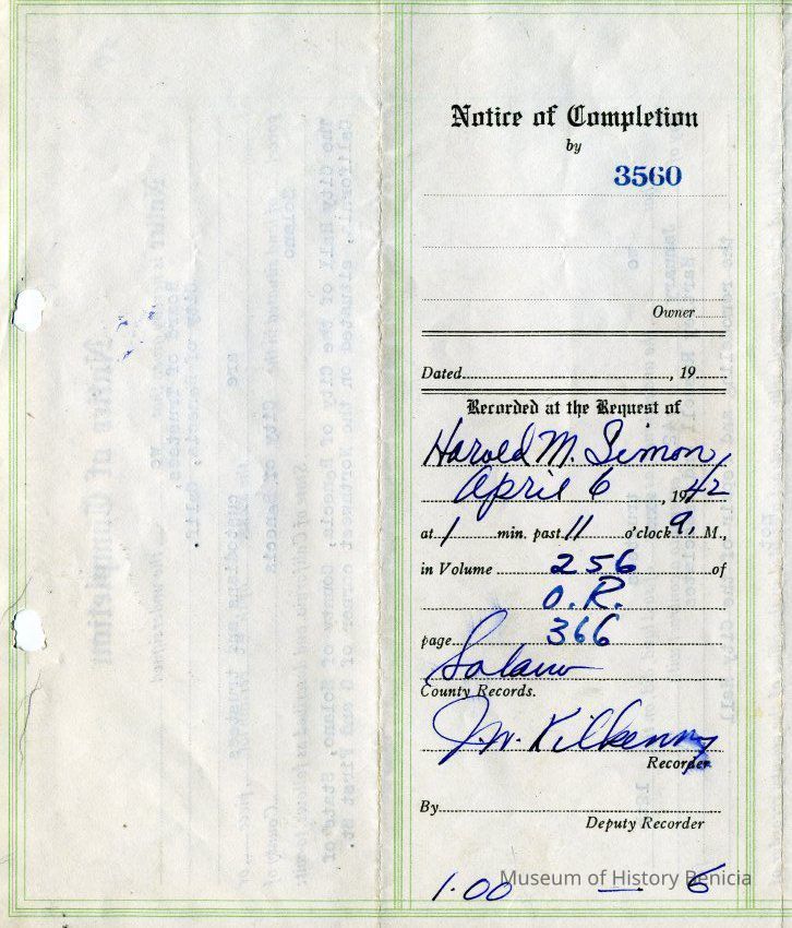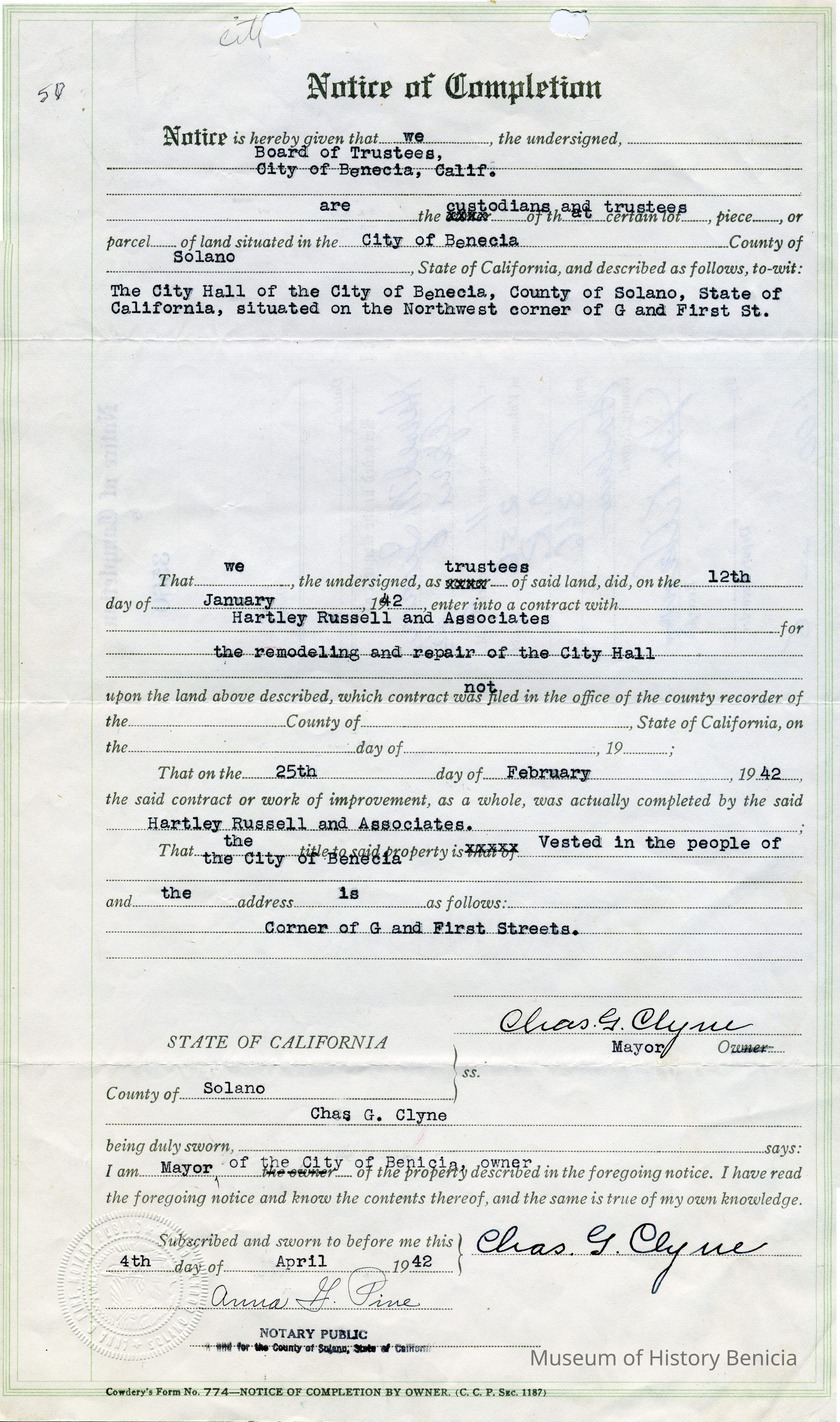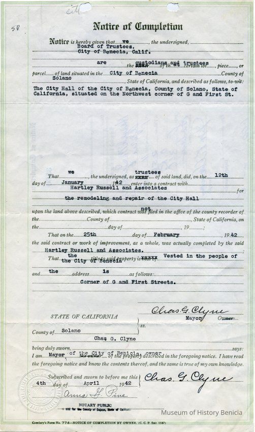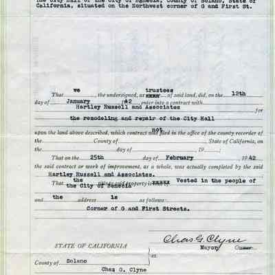 This is a notice of completion from the City of Benicia and regarding repairs to City Hall as specified in Exhibit "B" (2014.011.0385). It is signed by mayor Charles G Clyne.Collection