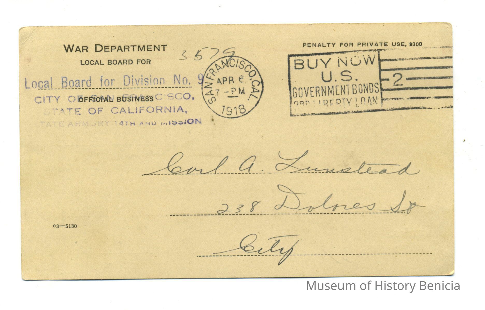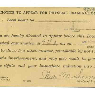 Notice for Carl August Lunsted to appear for physical examination from the War Department; card posrmarked August 7, 1918.