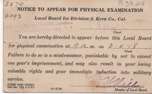 Notice to Appear for Physical Exsamination, Local Board for Division 2, Kern Co., Cal from War Department, Local Board for Division No. 2 for the County of Kern.Collection