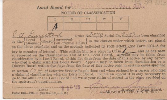Notice of Classification for C. A. Lunsted for the Division 2, Kern Co., Cal. for the War Department.