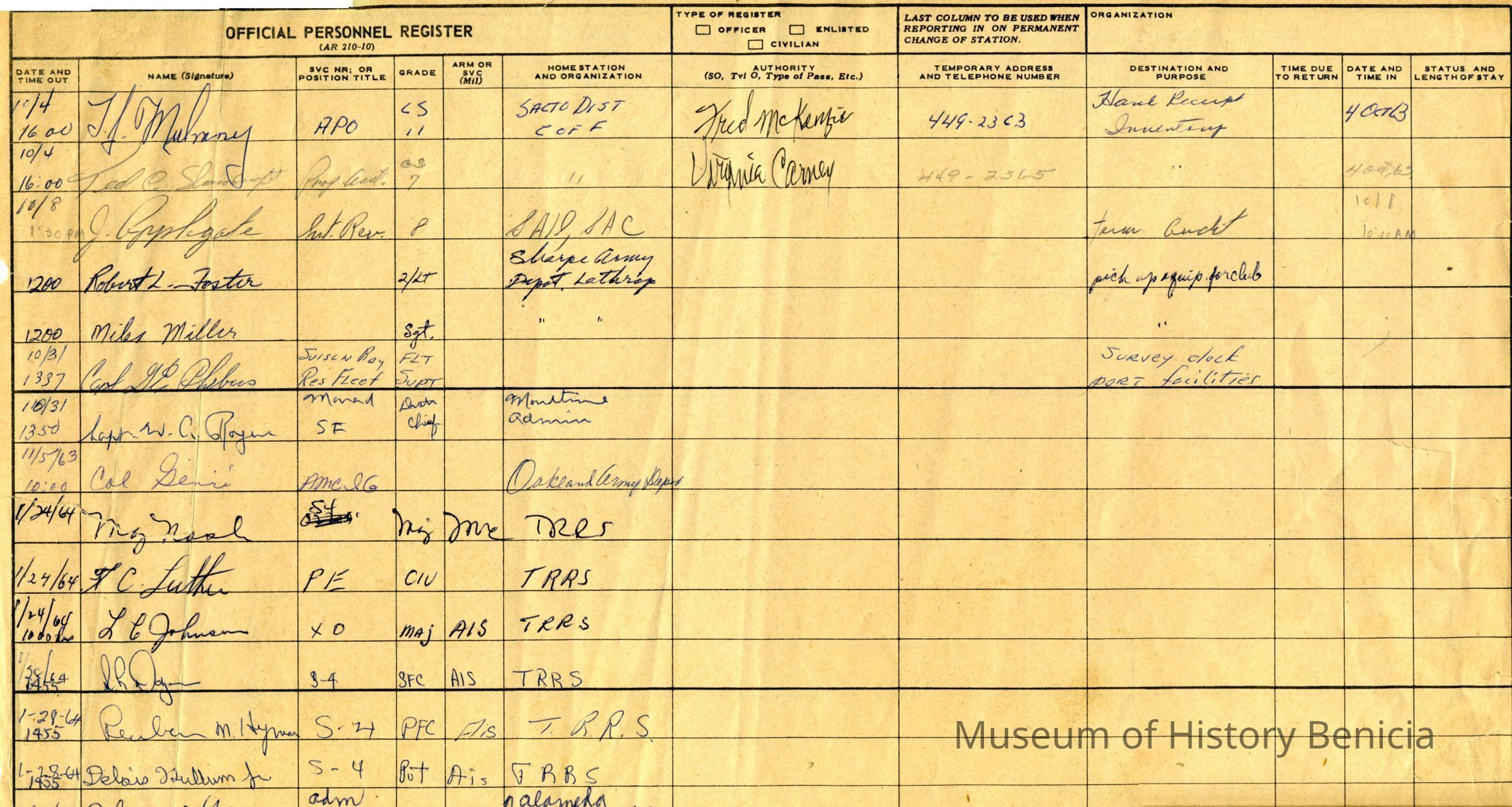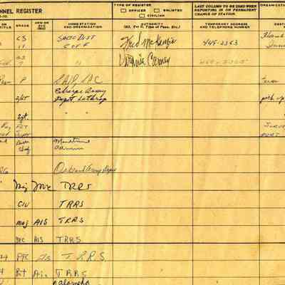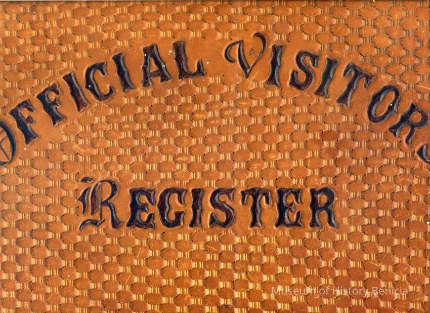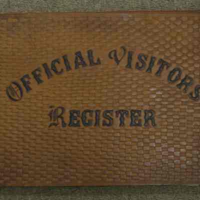 Brown leather bound ledger that visitors signed before entering the Arsenal. Visitors were from other bases, some out of state and others were from local businesses like Humble Oil.Collection