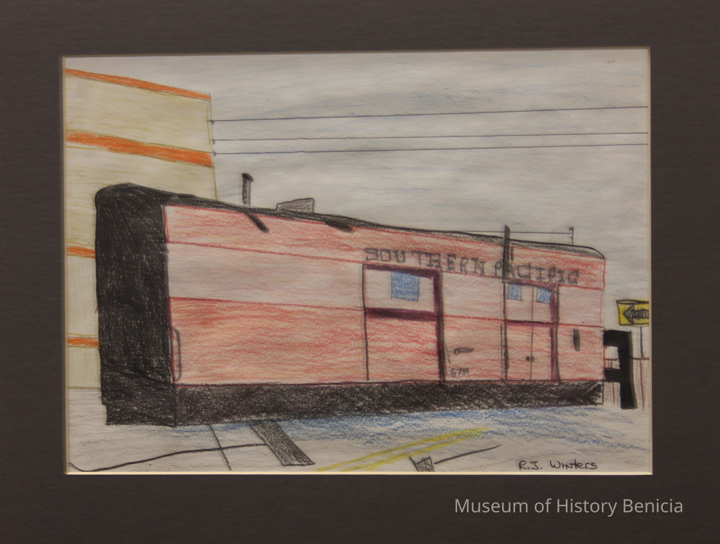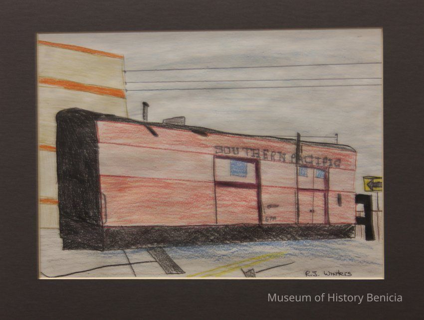 "Old Railroad Car" drawing done with colored pencils and pen by R. J. Wintersi in 1995, a Benicia Middle School student matted and mounted on foamcoreCollection