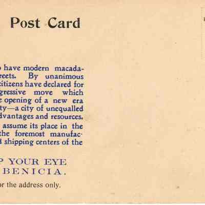 on back is an advertisement for Benicia and its "macadamized" streets