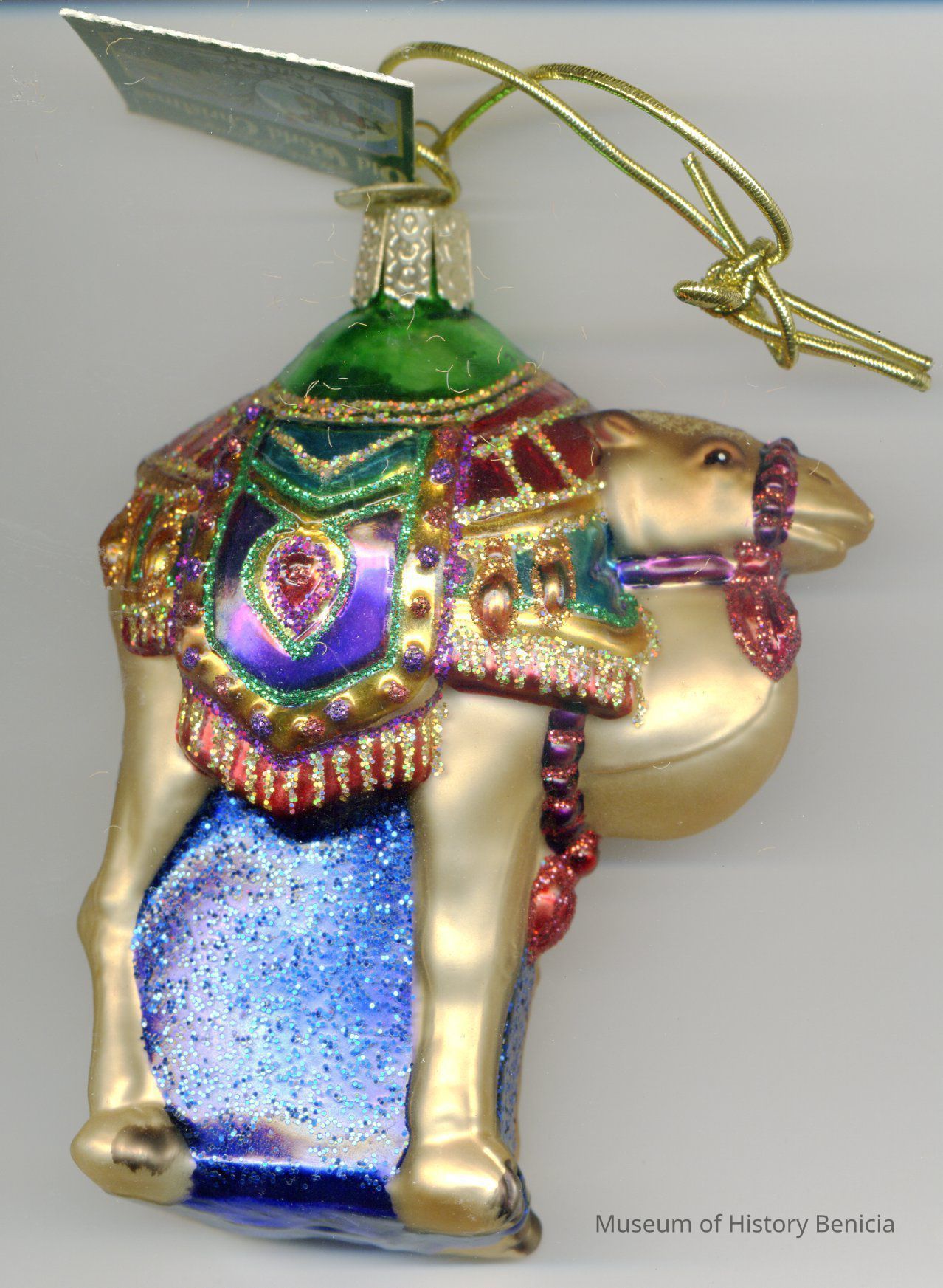 Camel Christmas ornament made from blown glass. It is gold, blue and various other colors. The tag on it says Magi's Camel 2006 and Made in ChinaCollection