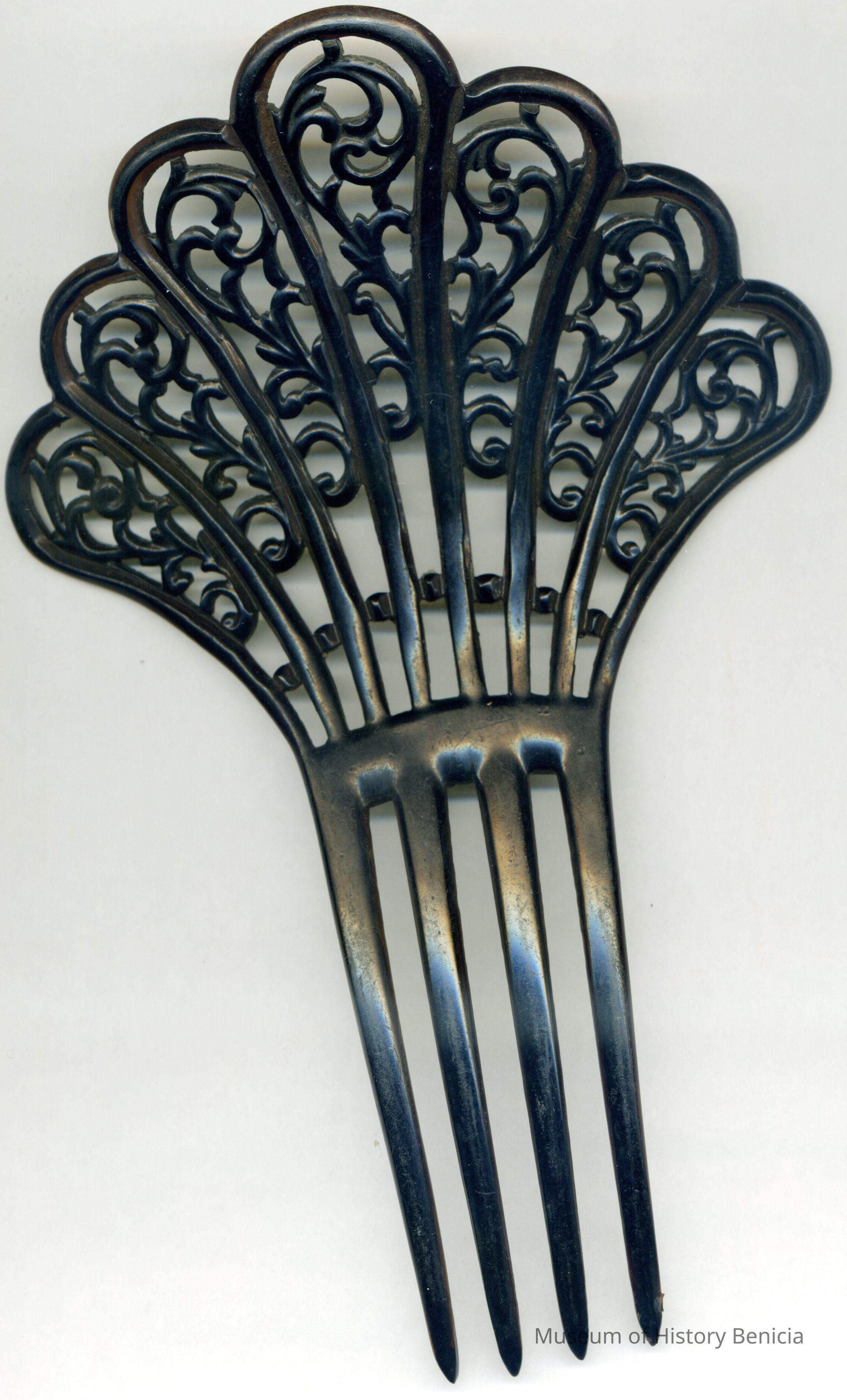 This is a small celluoid hair ornament. It was originally owned by Elizabeth Wassmann (1883-1955). She operated a women's wear shop on First street in Benicia.