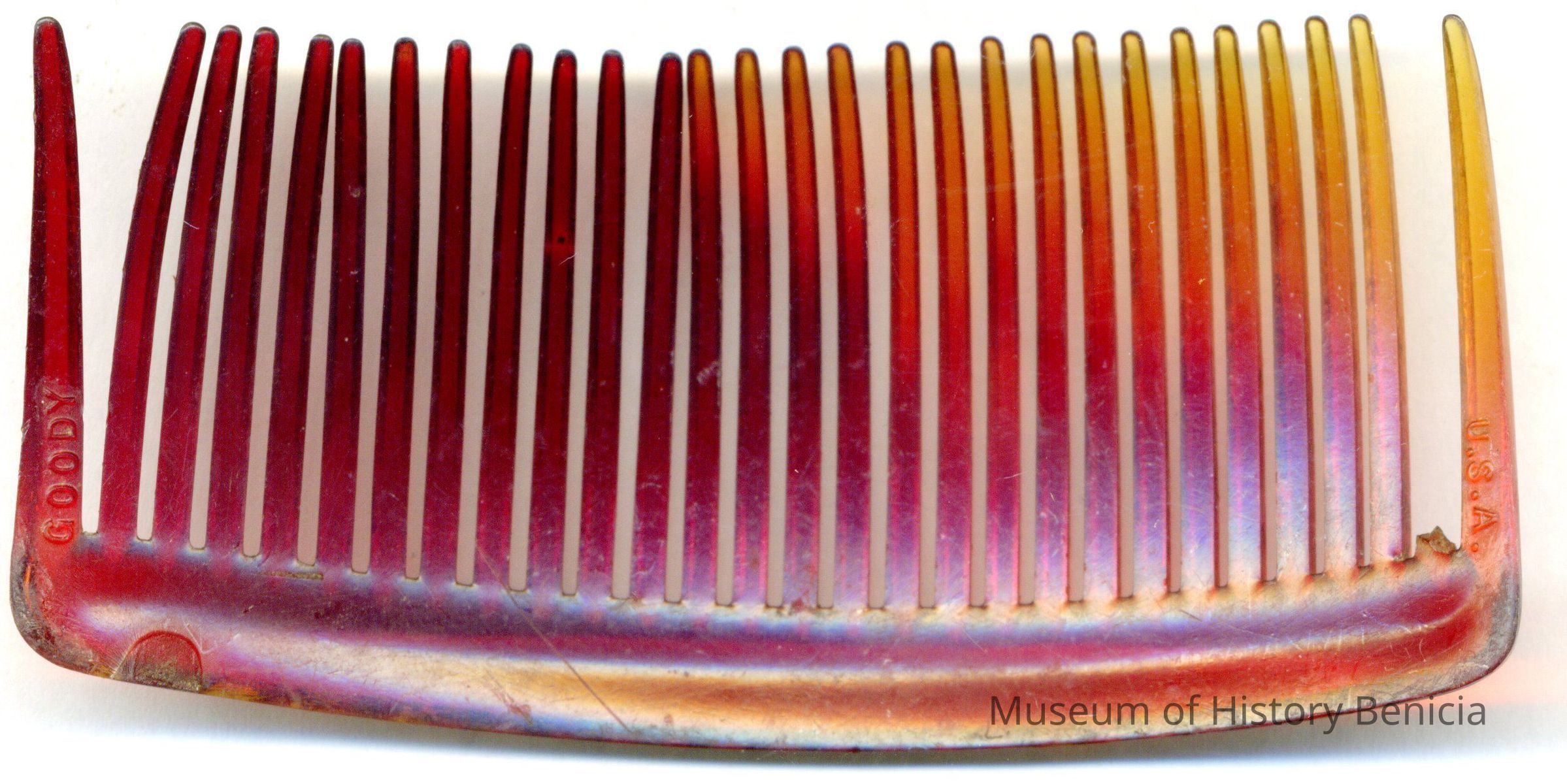 This is a small celluoid hair ornament. It was originally owned by Elizabeth Wassmann (1883-1955). She operated a women's wear shop on First street in Benicia.