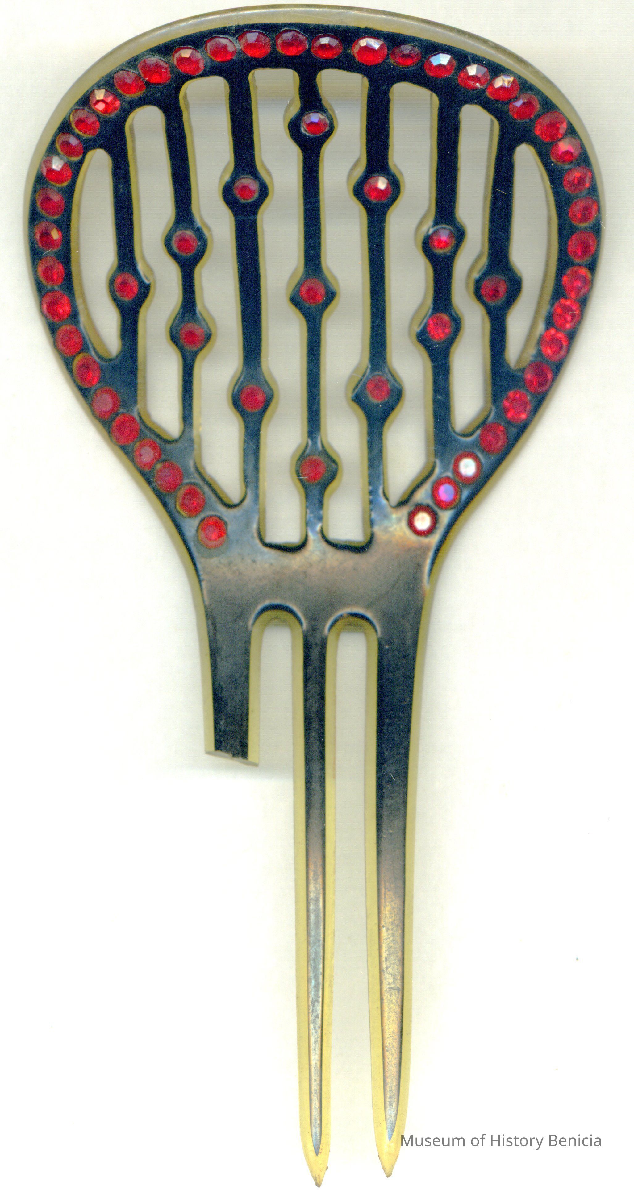 This is a small celluoid hair ornament. It was originally owned by Elizabeth Wassmann (1883-1955). She operated a women's wear shop on First street in Benicia.