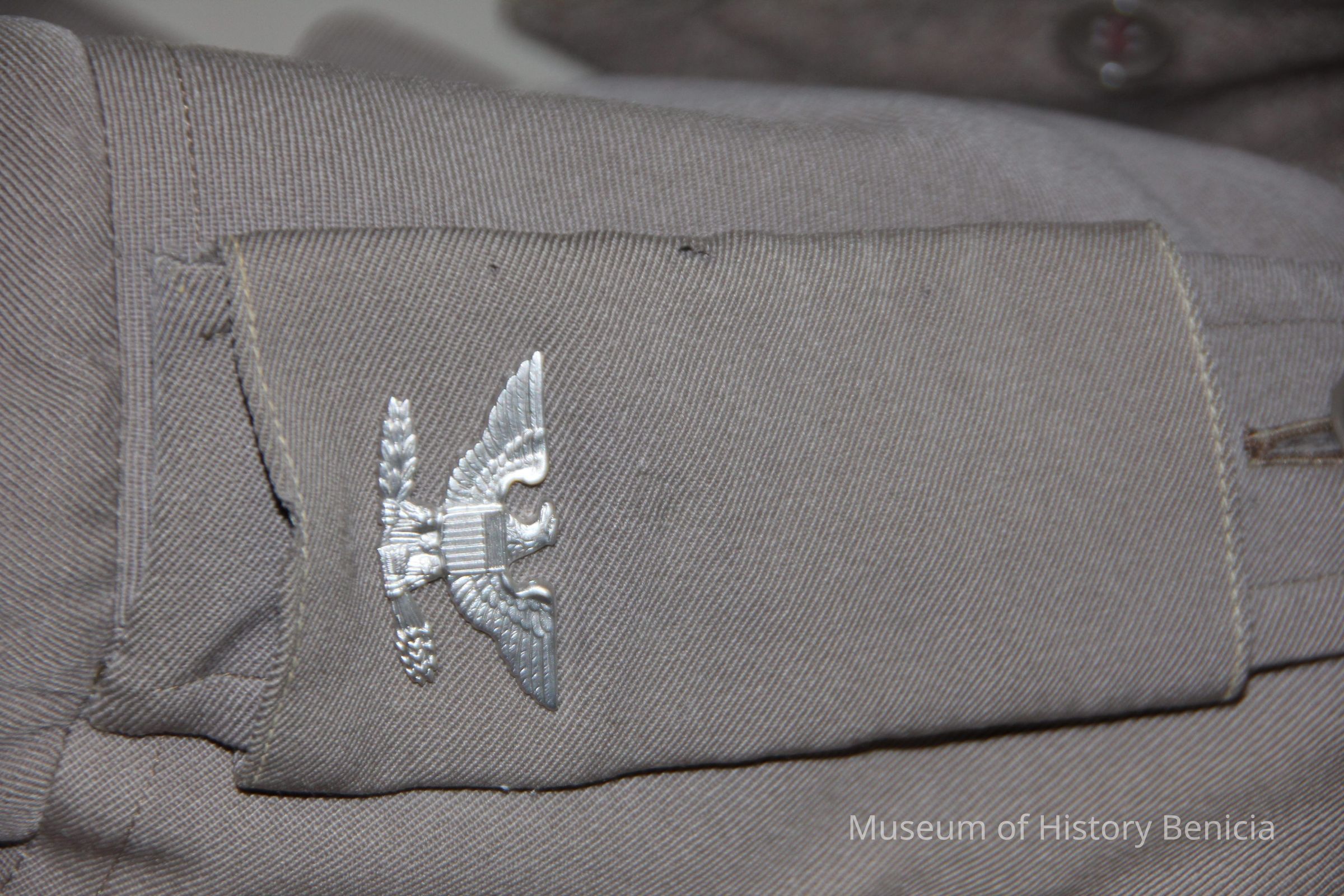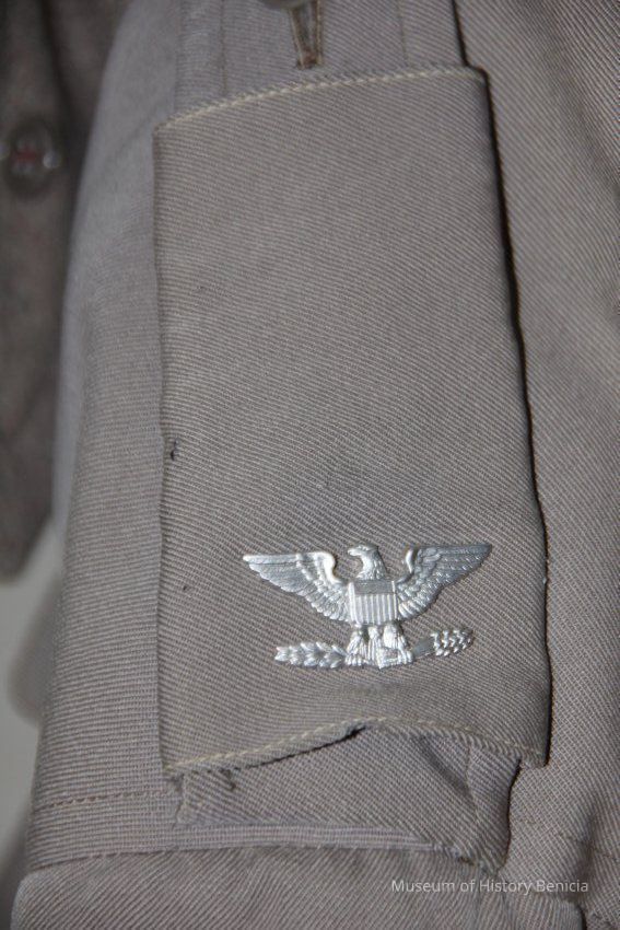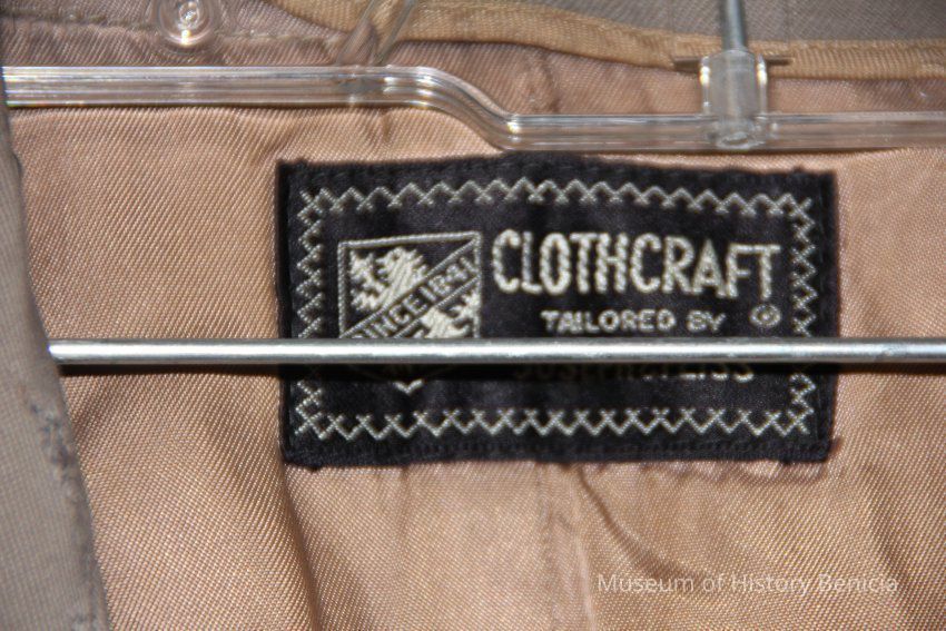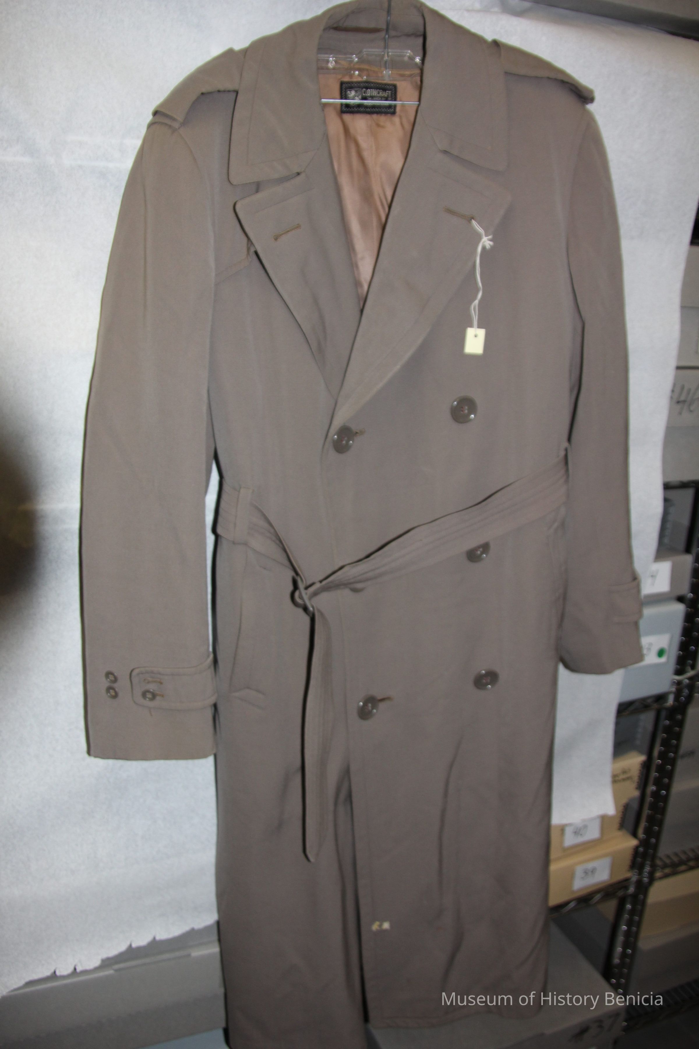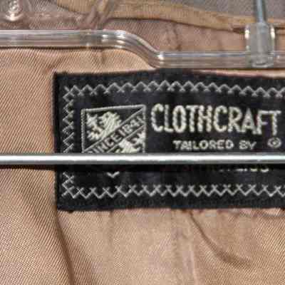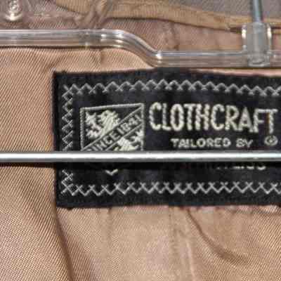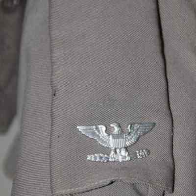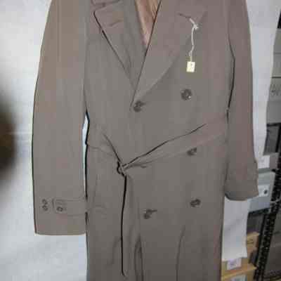 Overcoat to an Army military uniform. The uniform is green and the coat is gray. It has a zip-out linning and an eagle pin on one shoulder. The label says "Clothcraft tailored by Joseph & Feiss".