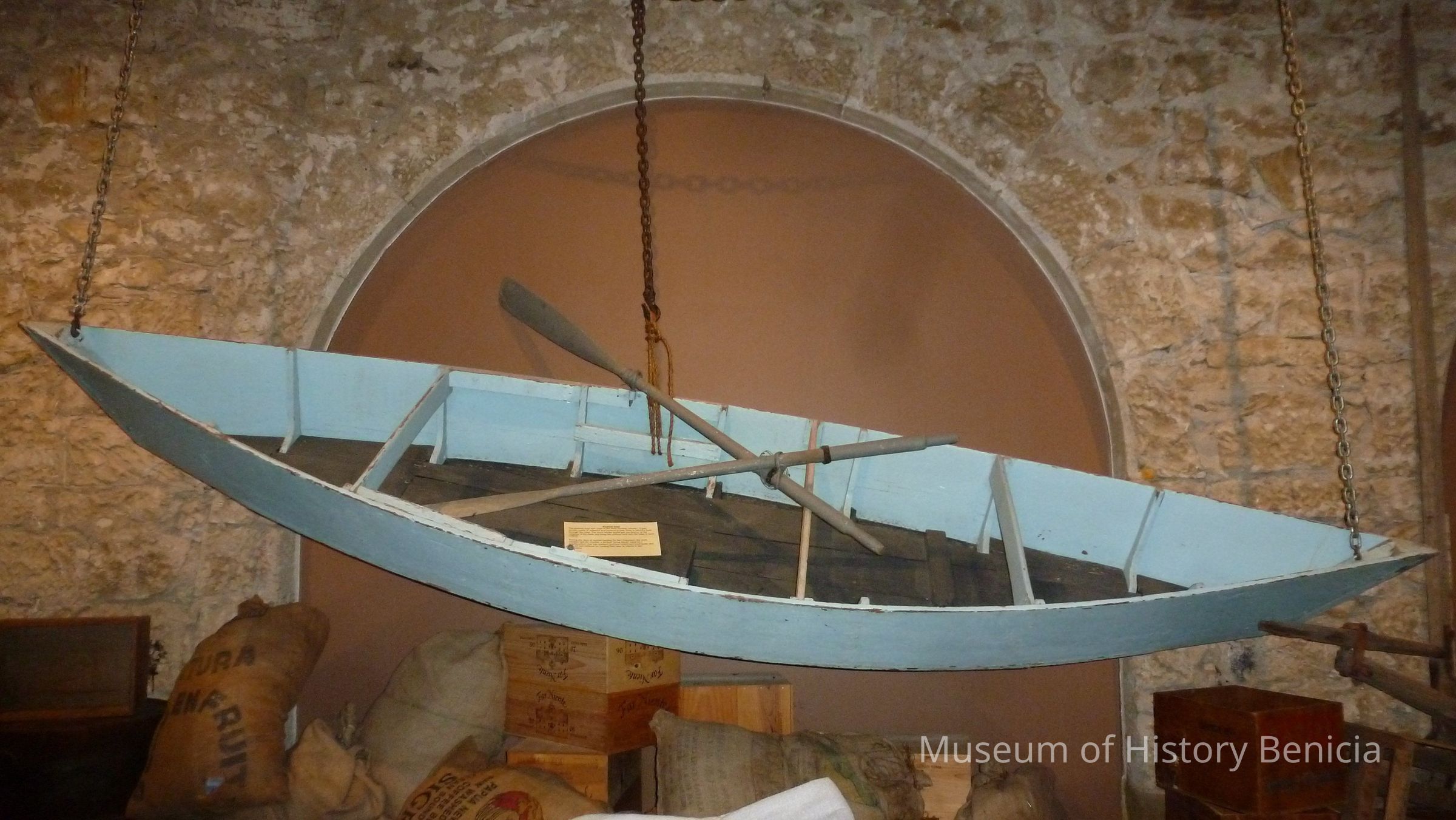 Double-ended, flat bottomed pick-ax boat. Made of Wood. Used by donor for duck hunting in the Delta.