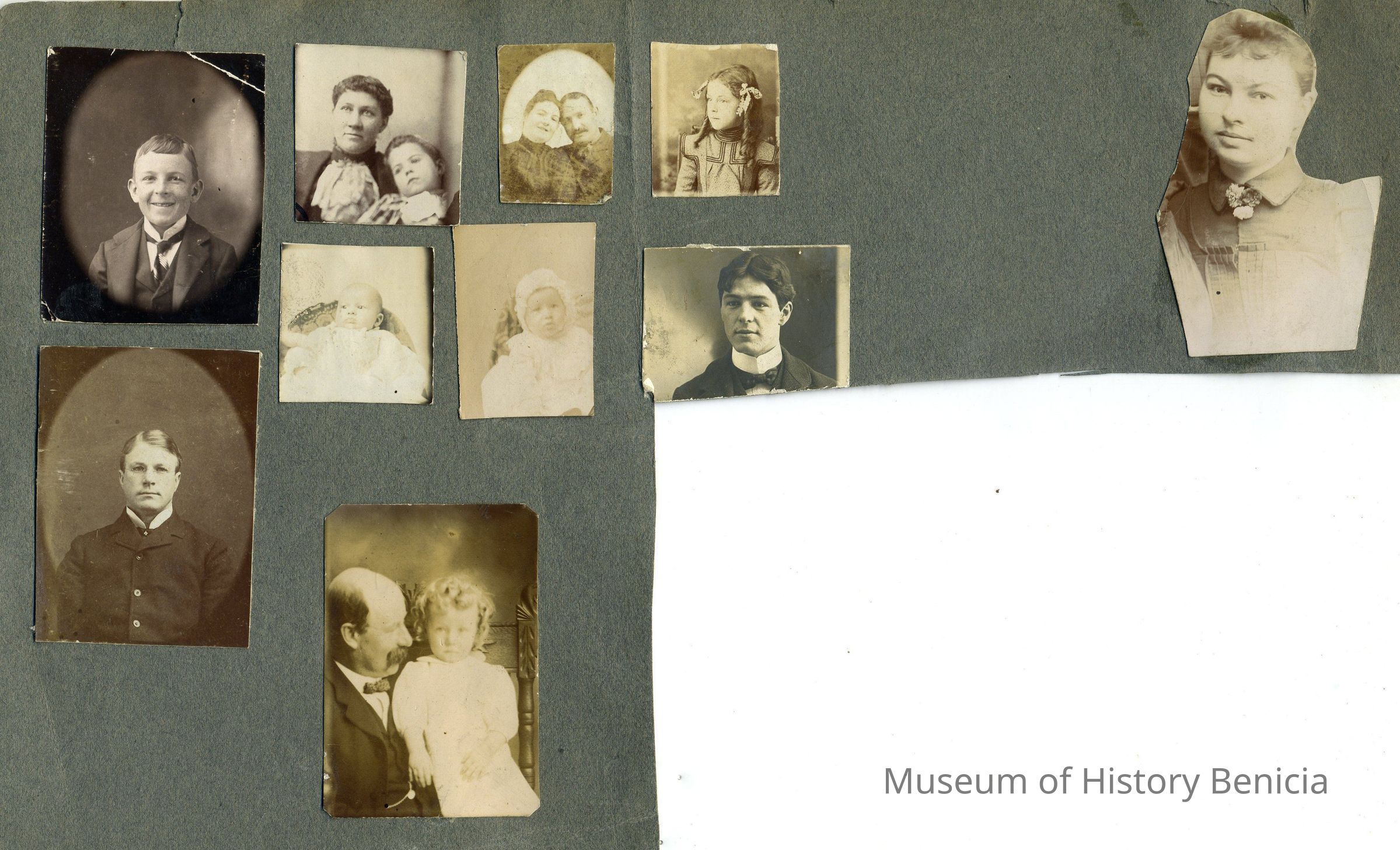 Section of a photo album page with ten black and white photographs glued to the page; none of the individuals are identified; sizes range: 1-3/8" x 1-3/4"; 1-3/8" x 2"; 1" x 1"; 7/8" x 1-1/4"; 3/4" x 1";1" x 1-3/8"; 2-1/4" x 1-1/2"; all are cut to size.