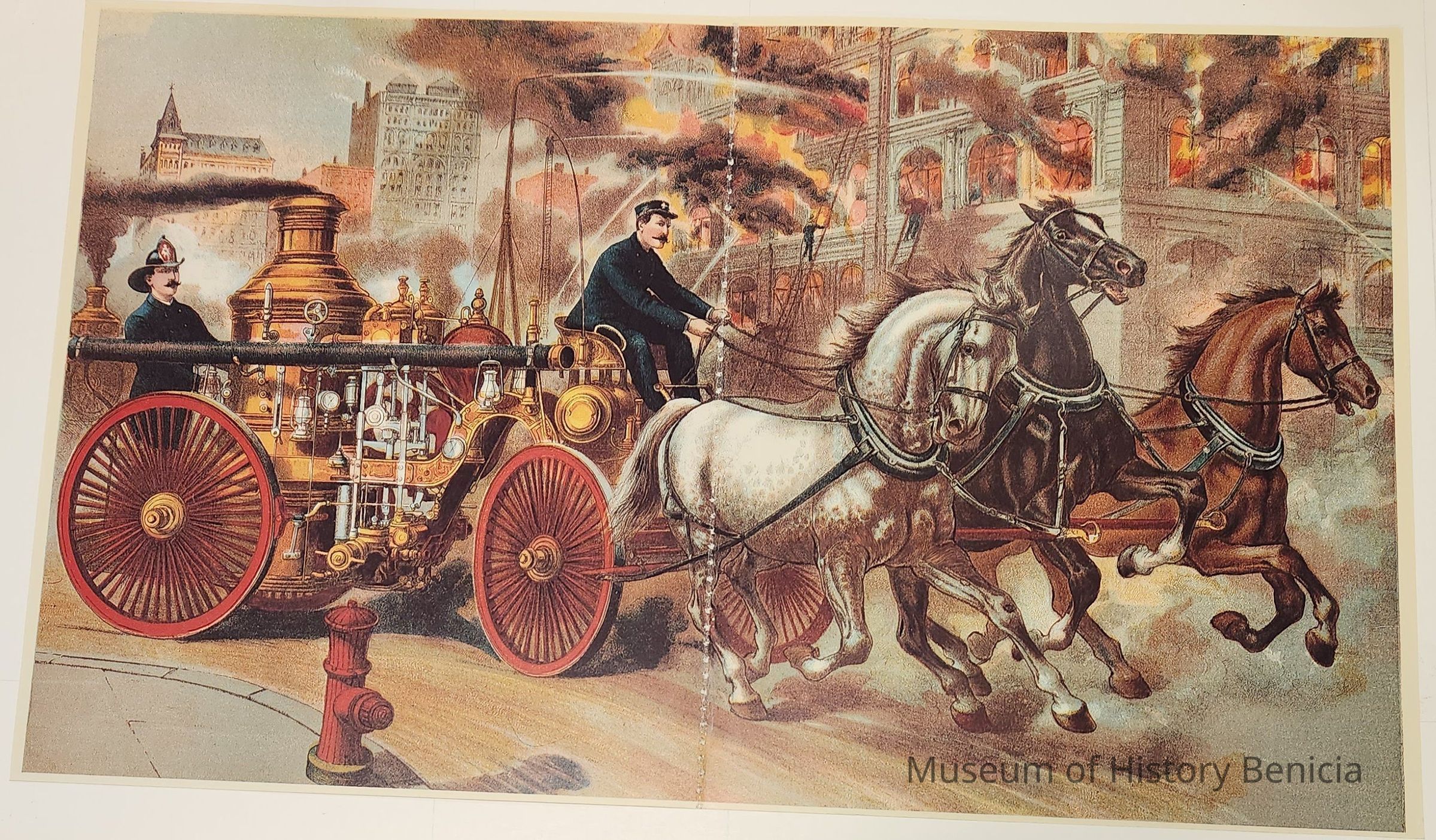 It is a glossy color drawing of a steam pumper being pulled by three horses (each a different color). There is part of a story on the reverse side having to do with firemen climbing ladders and fighting fires.