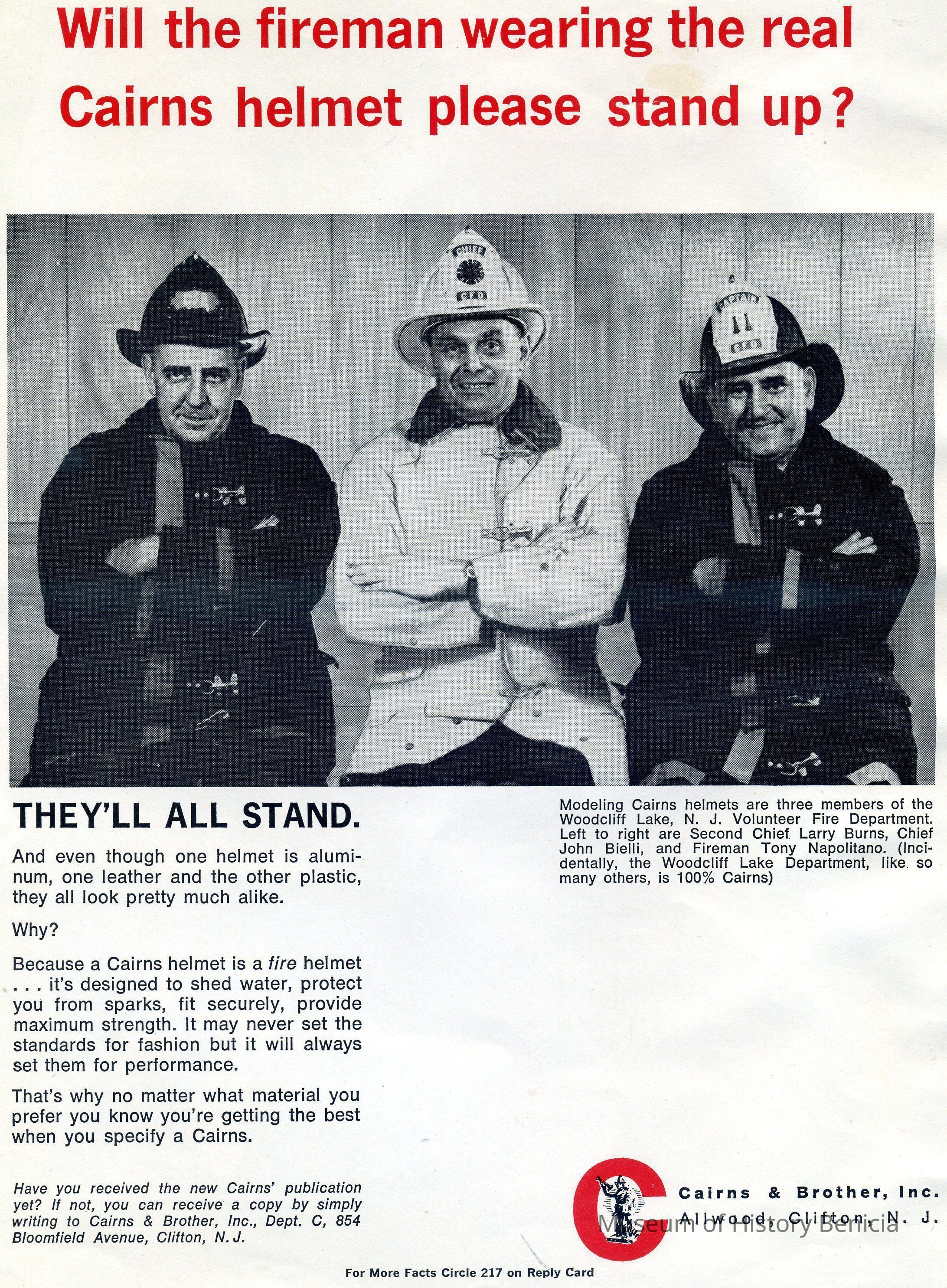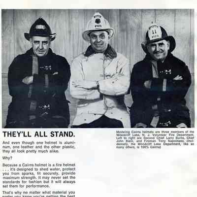 0n reverse side: "Will the fireman wearing the real Cairns helmet please stand up?" above a picture of three men in fireman's gear.
