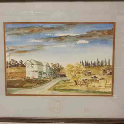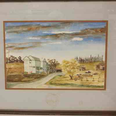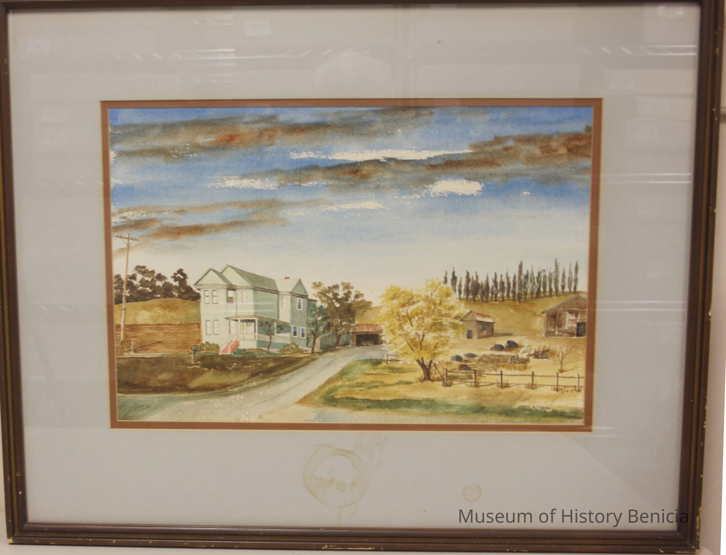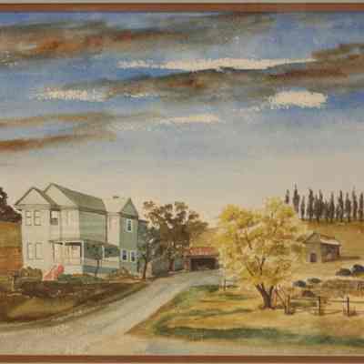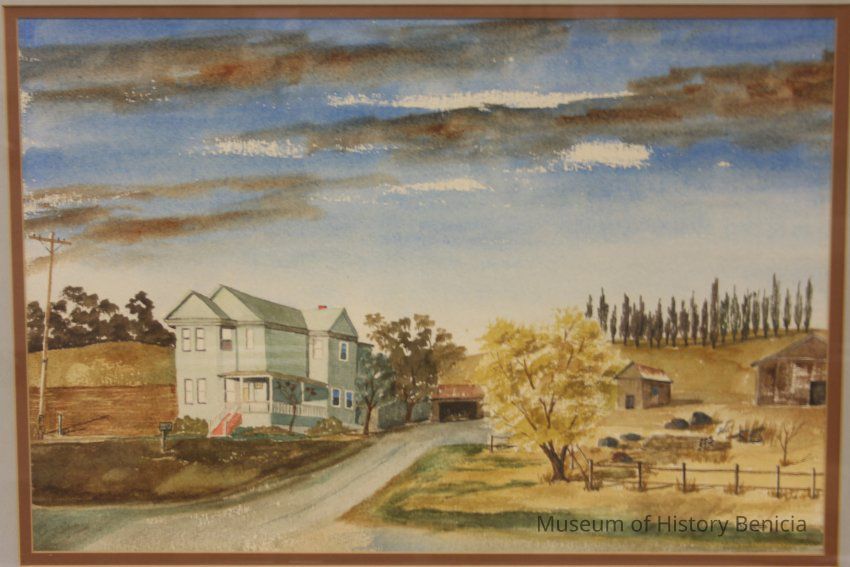watercolor painting by William O'Brien (Benicia artist, now deceased) Subject is the Corcoran House, a two story structure situated within a rural/country scene. House location: Benicia, Rose Drive and (Miller Road) Columbus Pkwy. Also known as the Urban Braito House. painted in 1974Collection