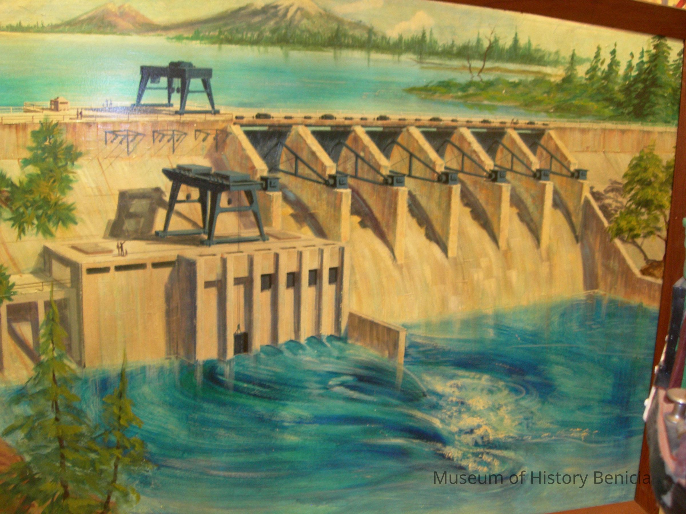 oil painting on masonite: shows dam and cranes and gates manufactured by Yuba Mfg. Co.