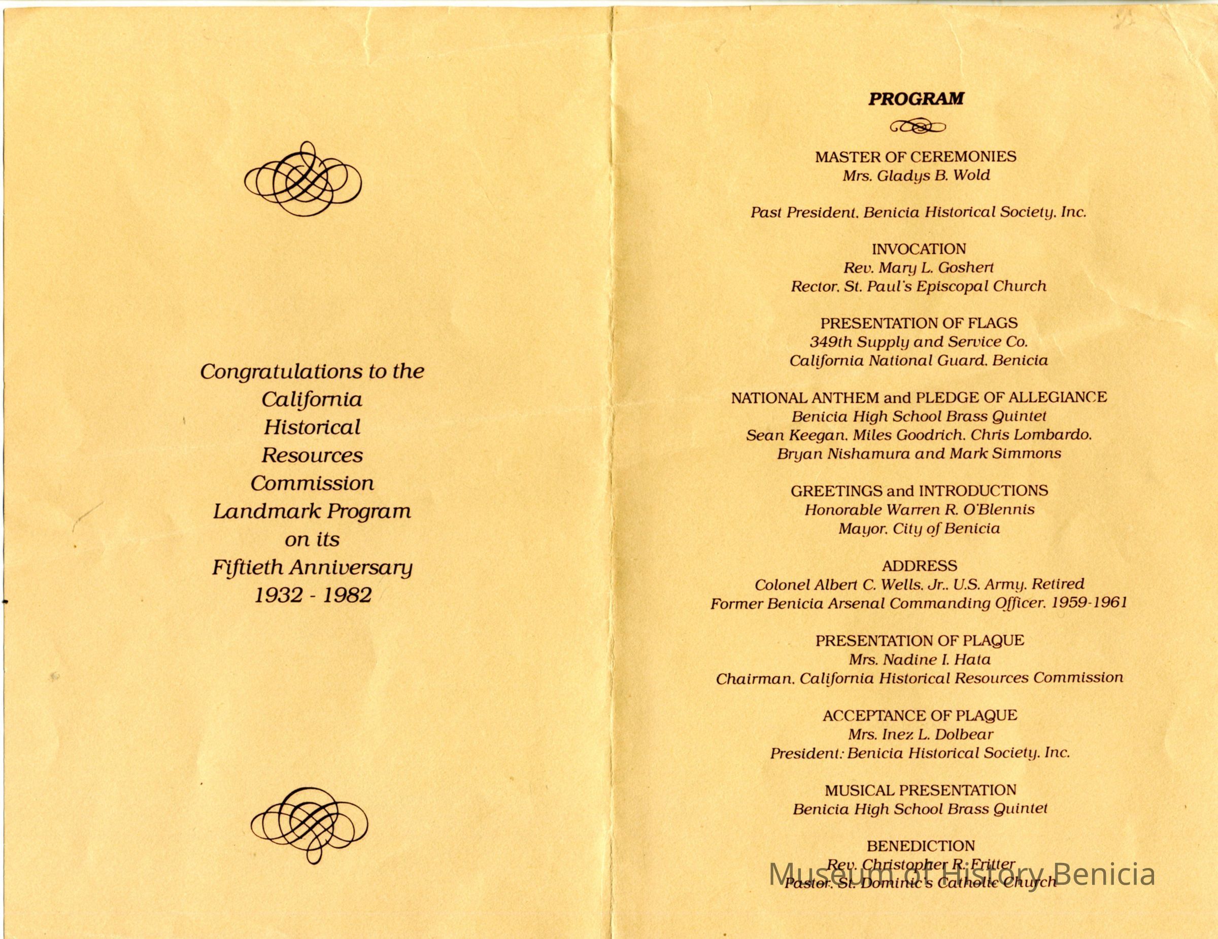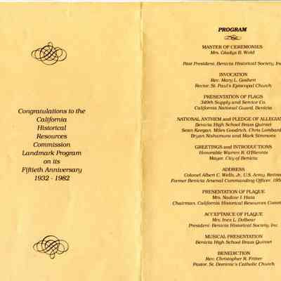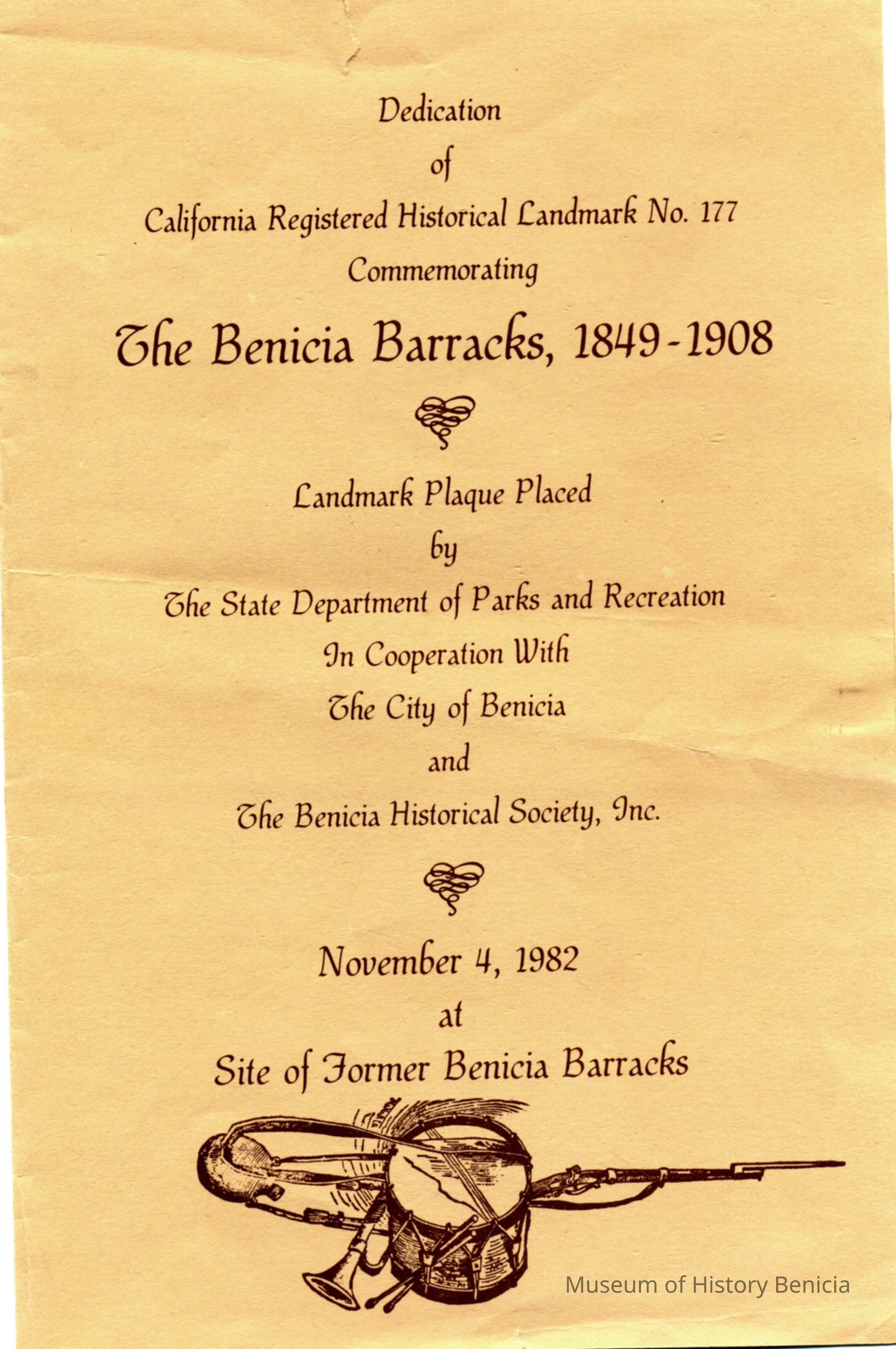 This is a pamphlet for the dedication of a plaque commemorating the Benicia Barracks, 1849-1908. This was a collaboration of the California Department of Parks and Recreation, City of Benicia, and the Benicia Historical Society.Collection