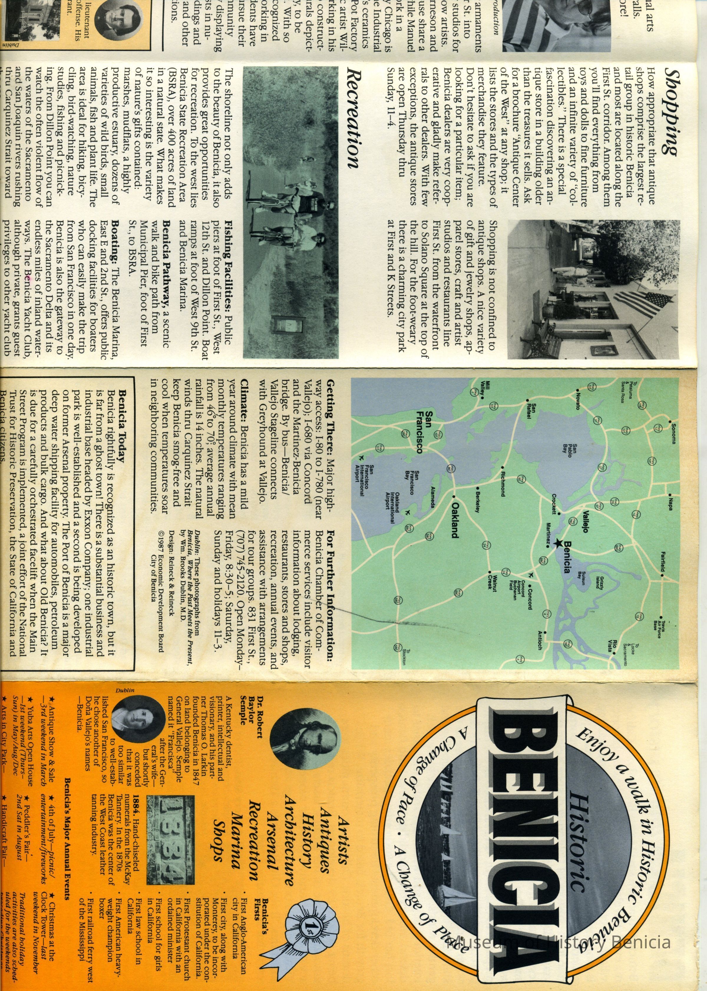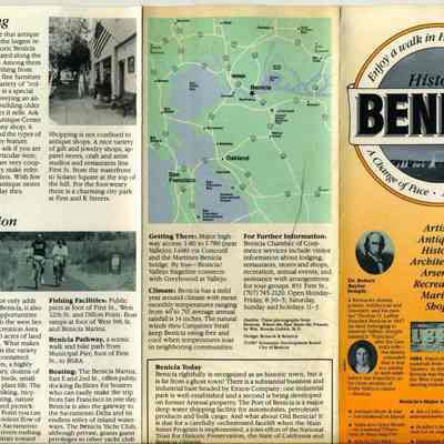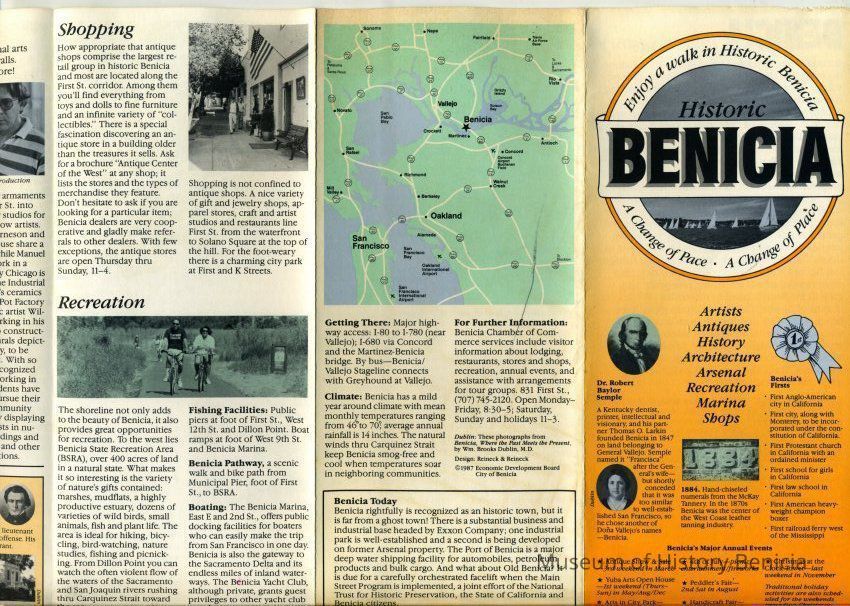This is a brochure for the City of Benicia. It was produced by the Benicia Economic Development Board in 1987. It talks about Benicia historic sites, annual events, business and church sites, arts, recreation, and shopping.Collection