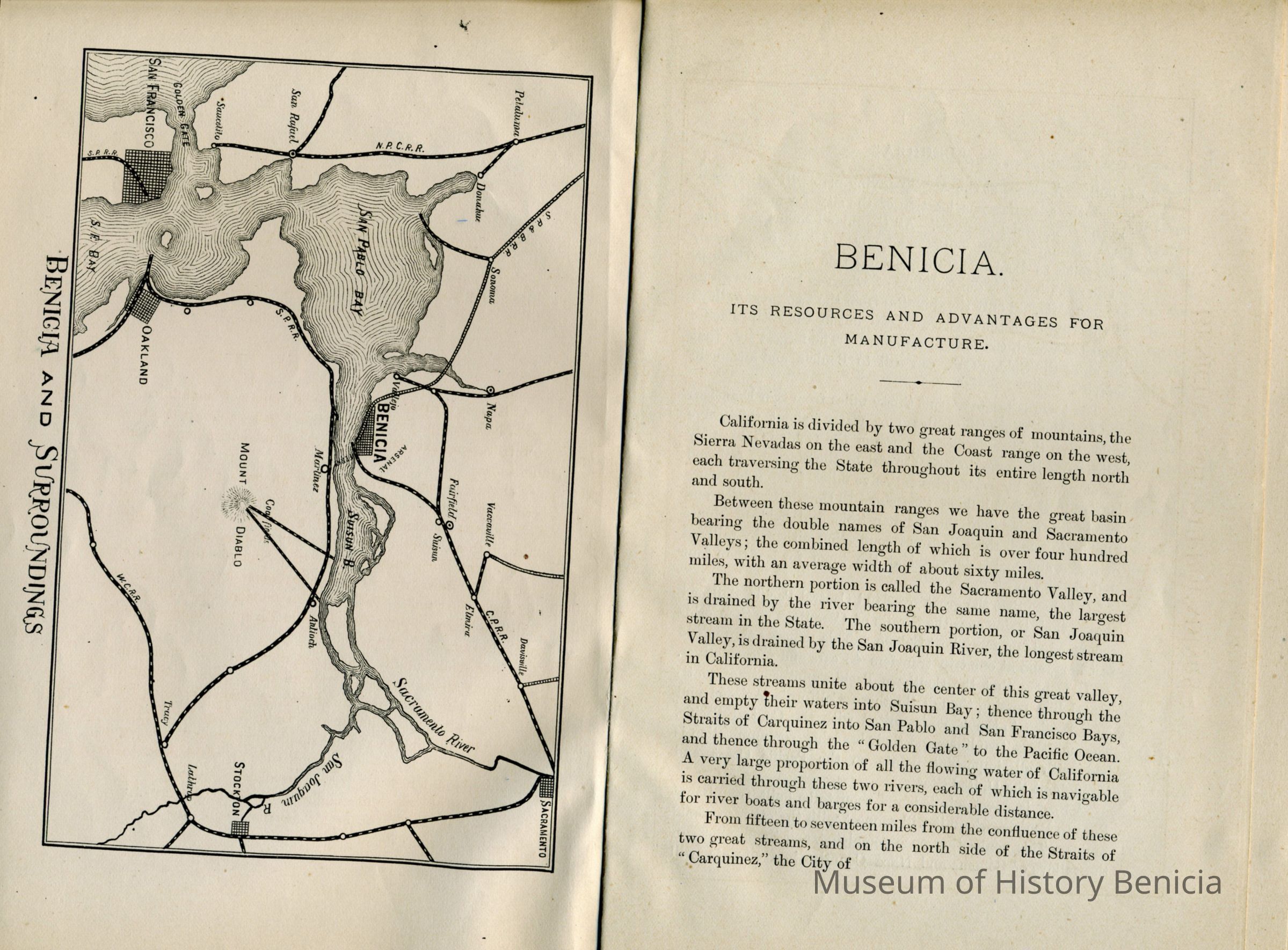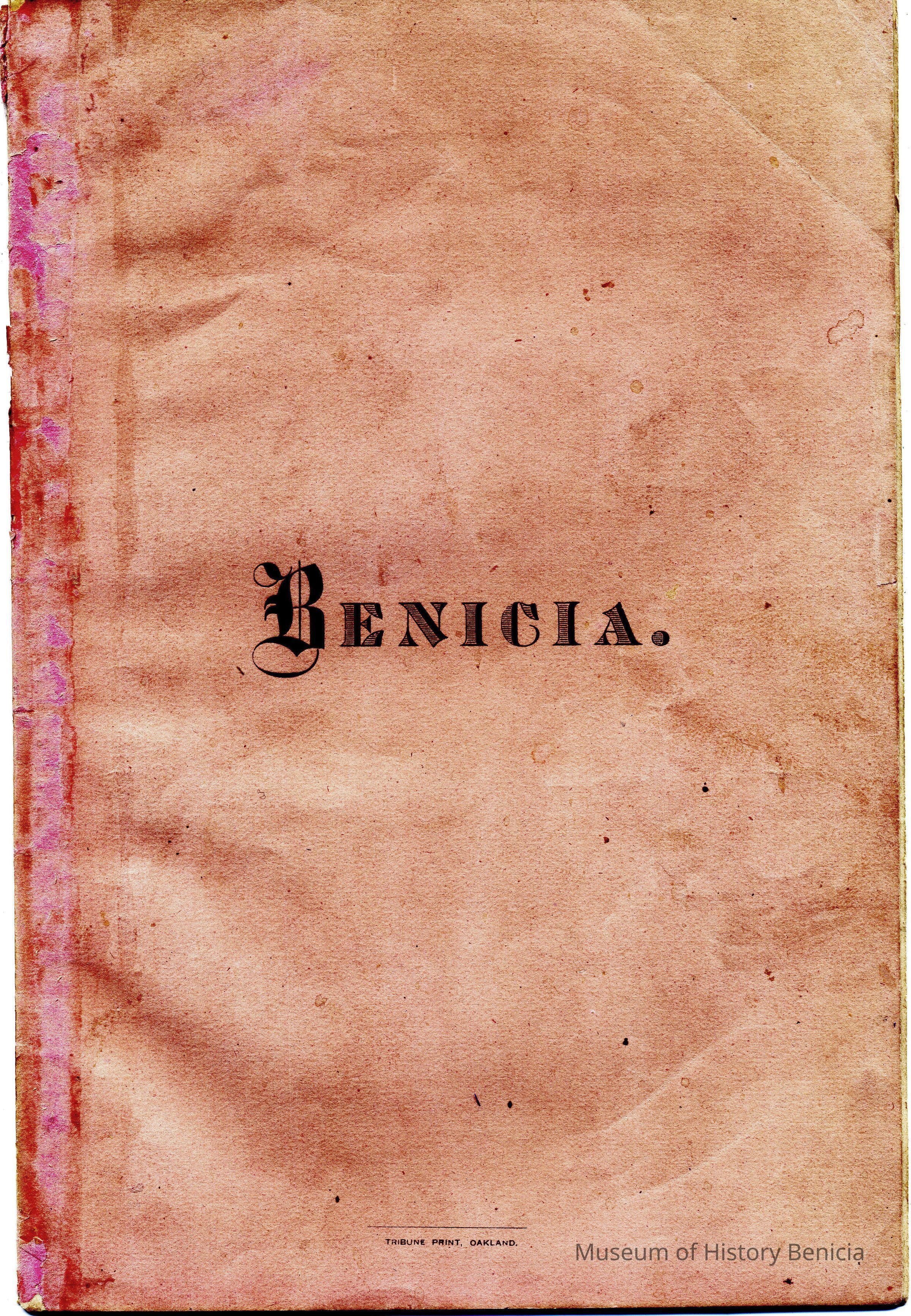An early booklet describing Benicia and it's many advantages. It discusses the business, agriculture, schools, homes, etc. in Benicia. The intent is to draw more people to move to Benicia and to attract new business.