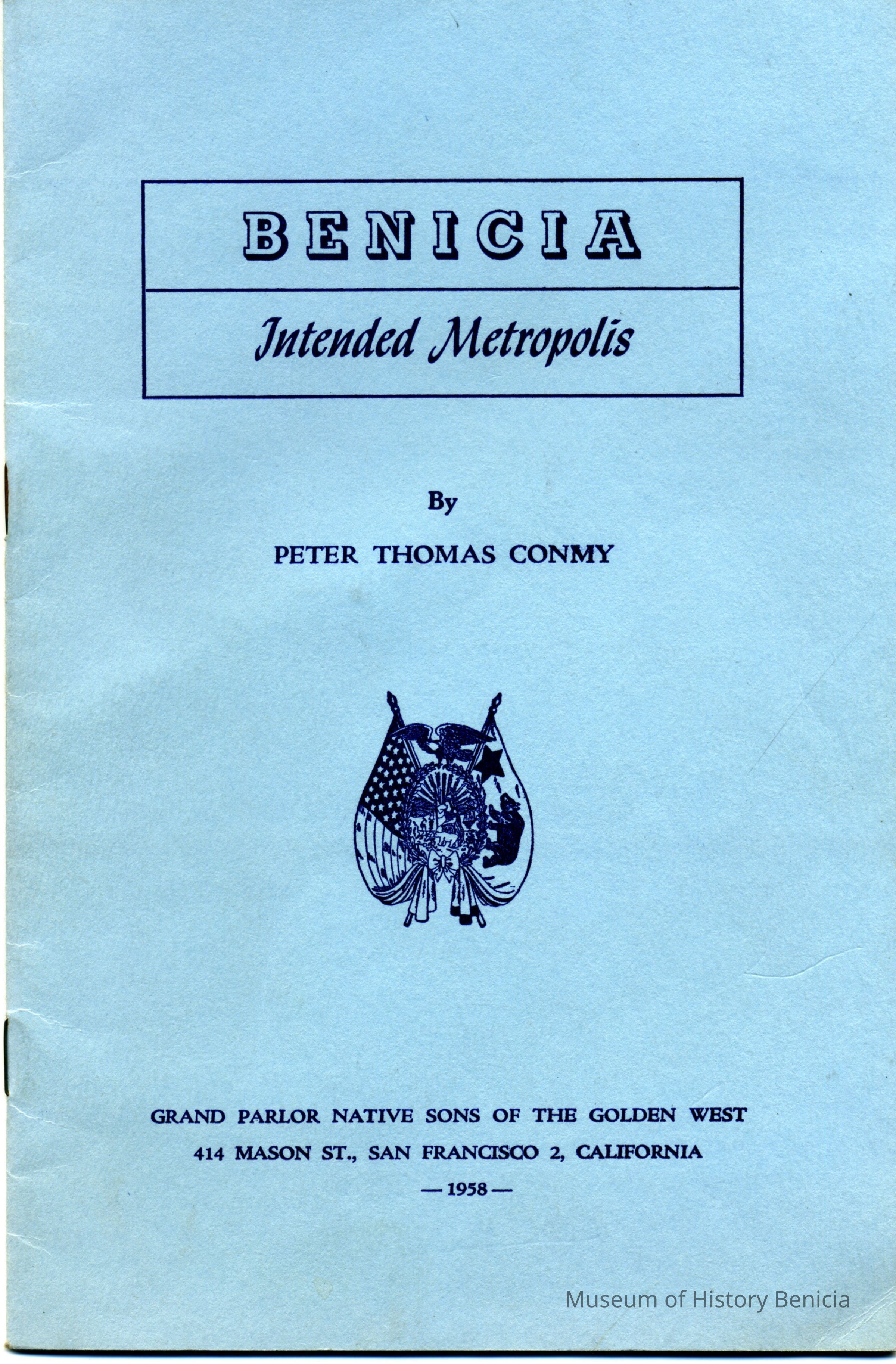 This is a pamphlet about Benicia by Peter Thomas Conmy of the Grand Parlor, Native Sons of the Golden West. It is autographed by the author. The pamphlet was written for the re-dedication ceremonies of the Sate Capitol in 1958. It describes the history of Vallejo and Benicia.Collection