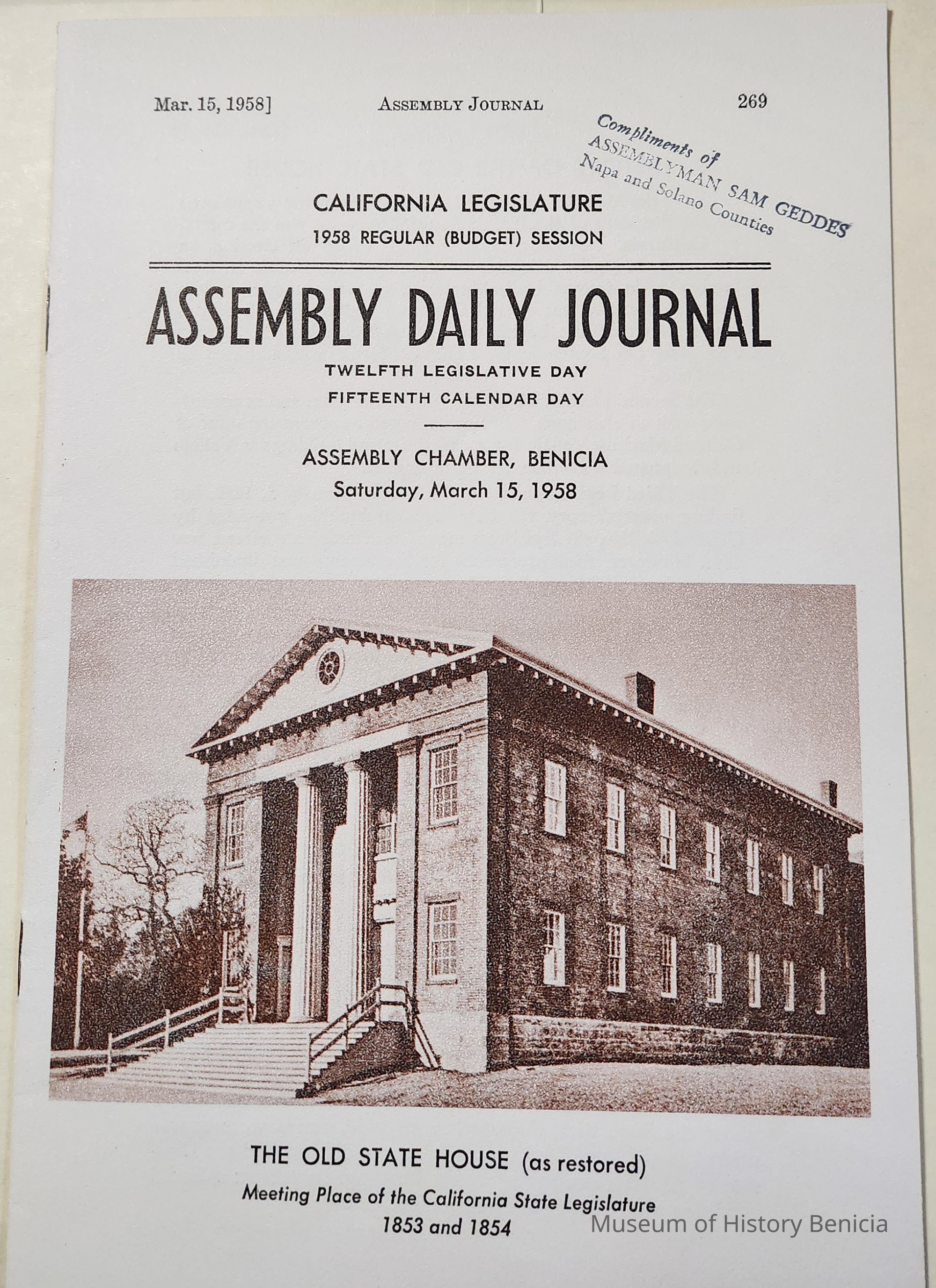 Booklet/Pamphlet: "California Legislature / 1958 Regular (Budget) Session / Assembly Daily Journal / Twelfth Legislative Day / Fifteenth Calendar Day / Assembly Chambers, Benicia / Saturday, March 15, 1958 / [photo of the Capitol Building] / The Old State House (as restored) / Meeting Place of the California State Legislature / 1853 and 1854" pages 269-282 in the overall Assemble record; brown ink on ecru colored paper, folded and stapled at center fold; included inside: History of Old State House, Minutes of the Budget Session held in Benicia; stamped on the front and inside back: "Compliments of Assemblyman San Geddes, Napa and Solano Counties".Collection