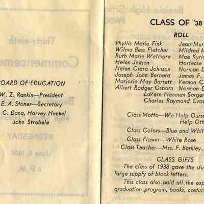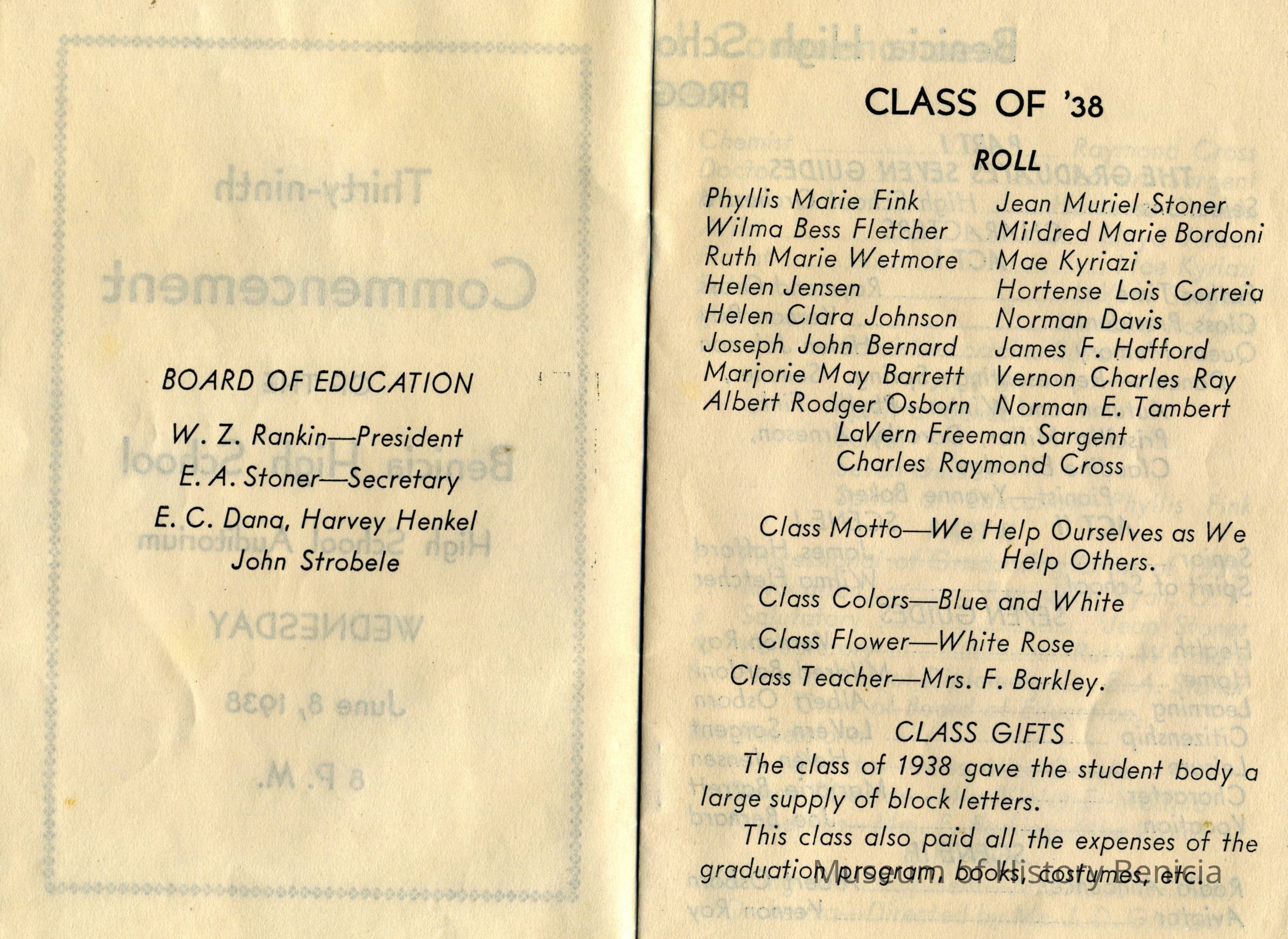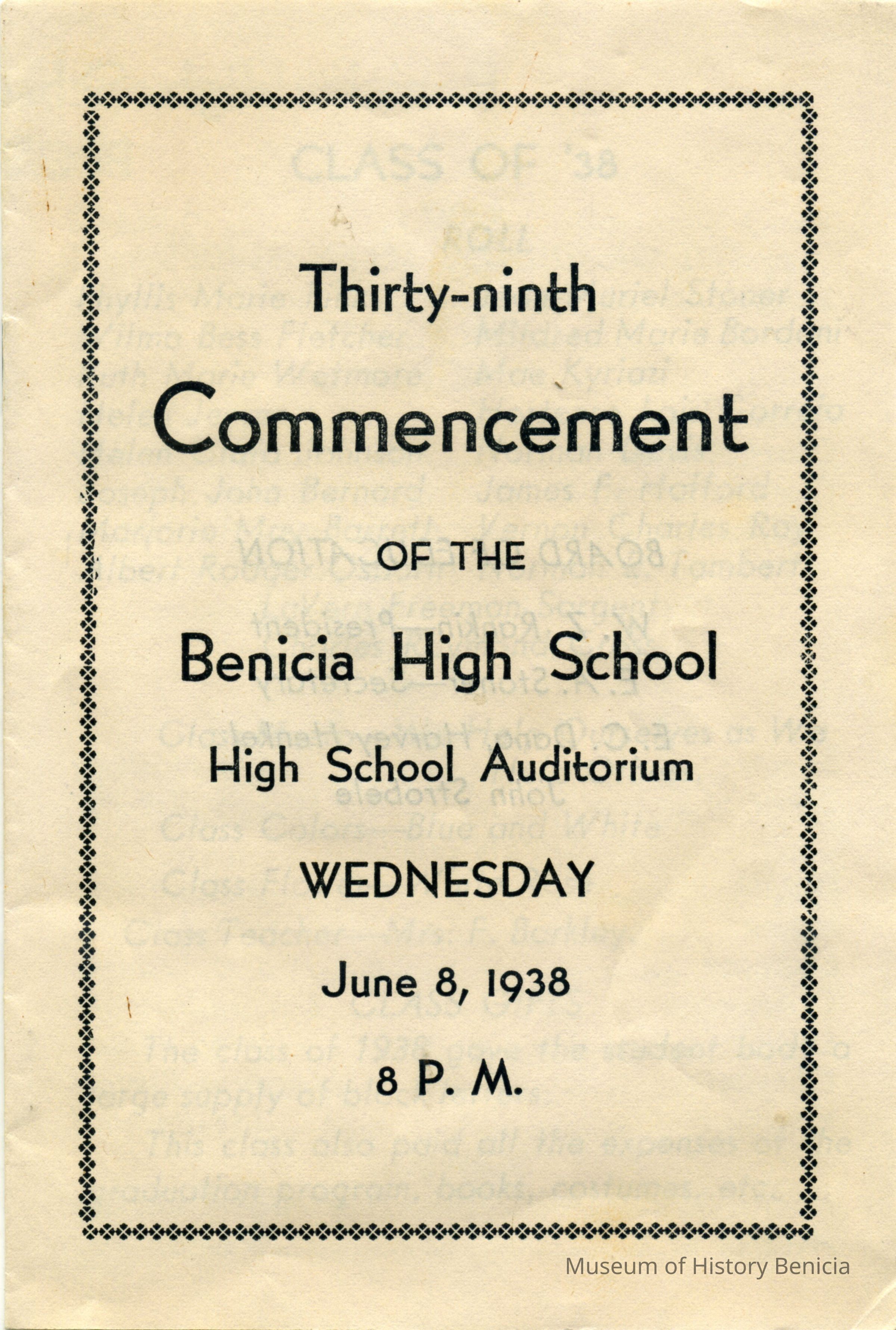 This is a commencment announcement for the 1938 Benicia High School. It lists the program and the class members. It was held in the High School auditorium. The graduates are: