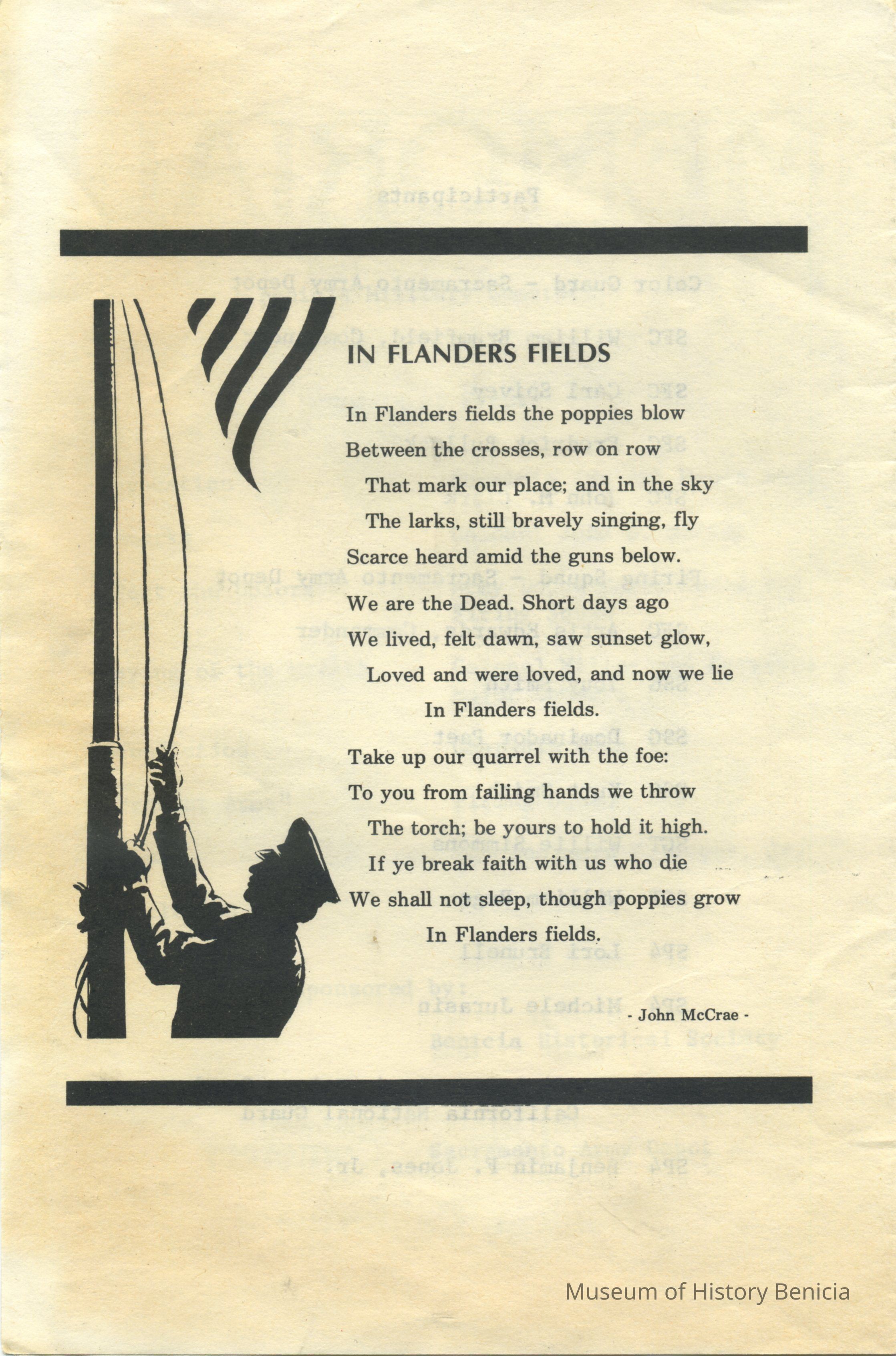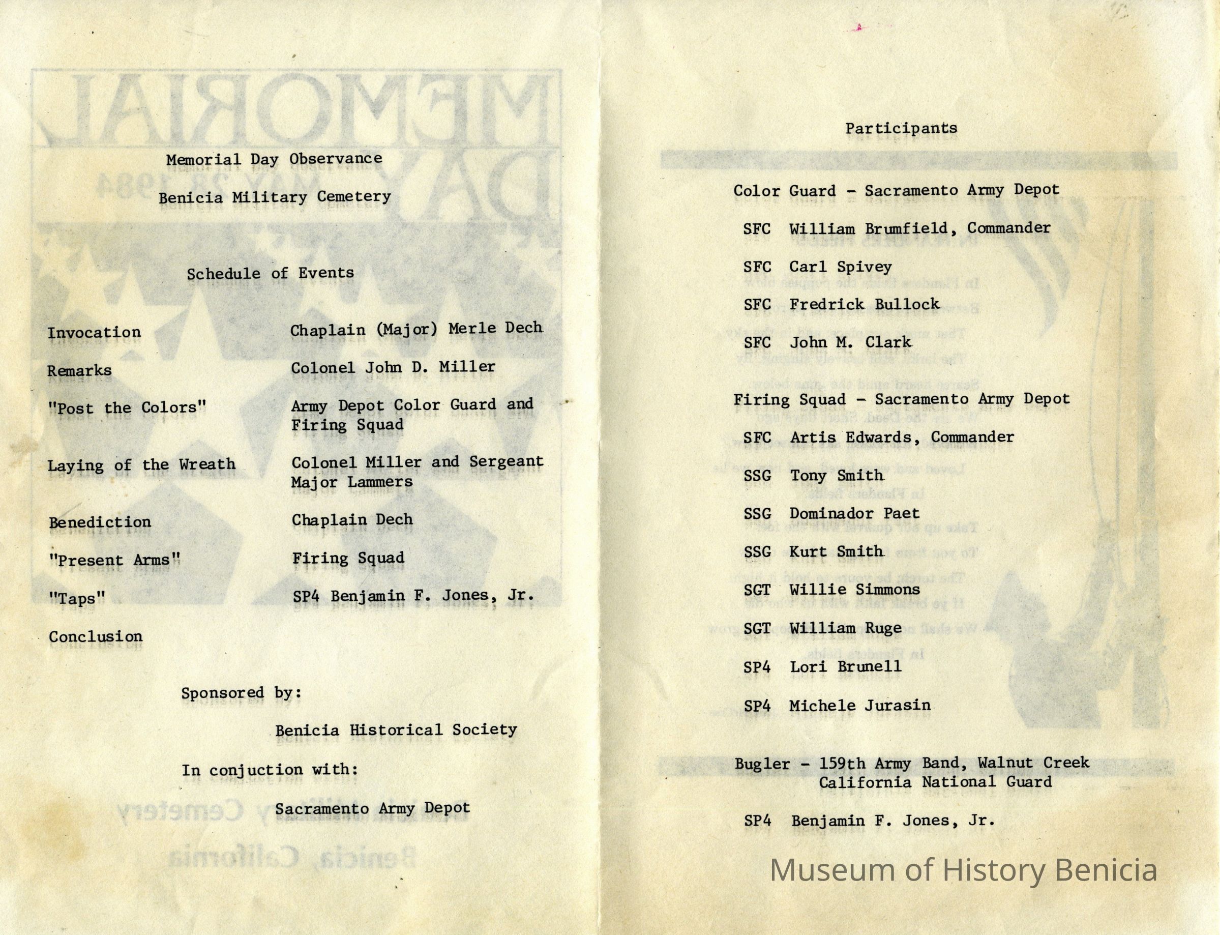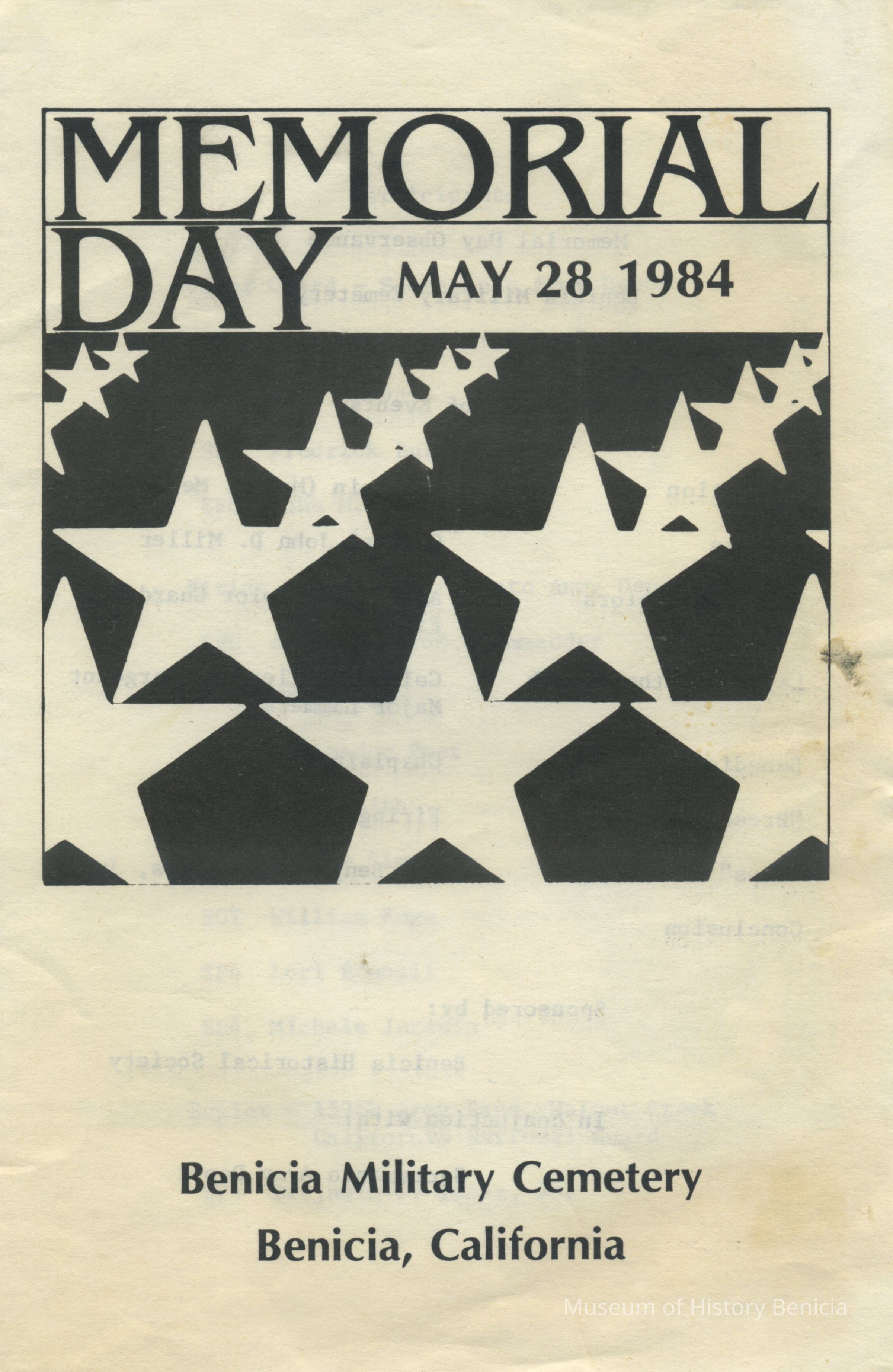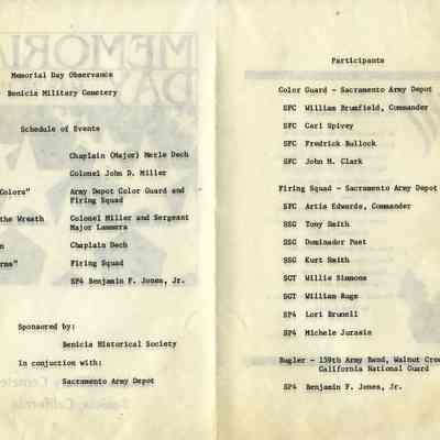 This is a brochure for the Memorial Day Service at the Benicia Military Cemetery for 05/28/1984. These observances became a tradition sponsored by the Benicia Historical Society. They started after the Society led by Harry Wassmann, pushed to have the cemetery rehabilitated in the early 1980's. The cooperation between the Society and the Sacramento Army Depot became a proud tradition in Benicia.Collection