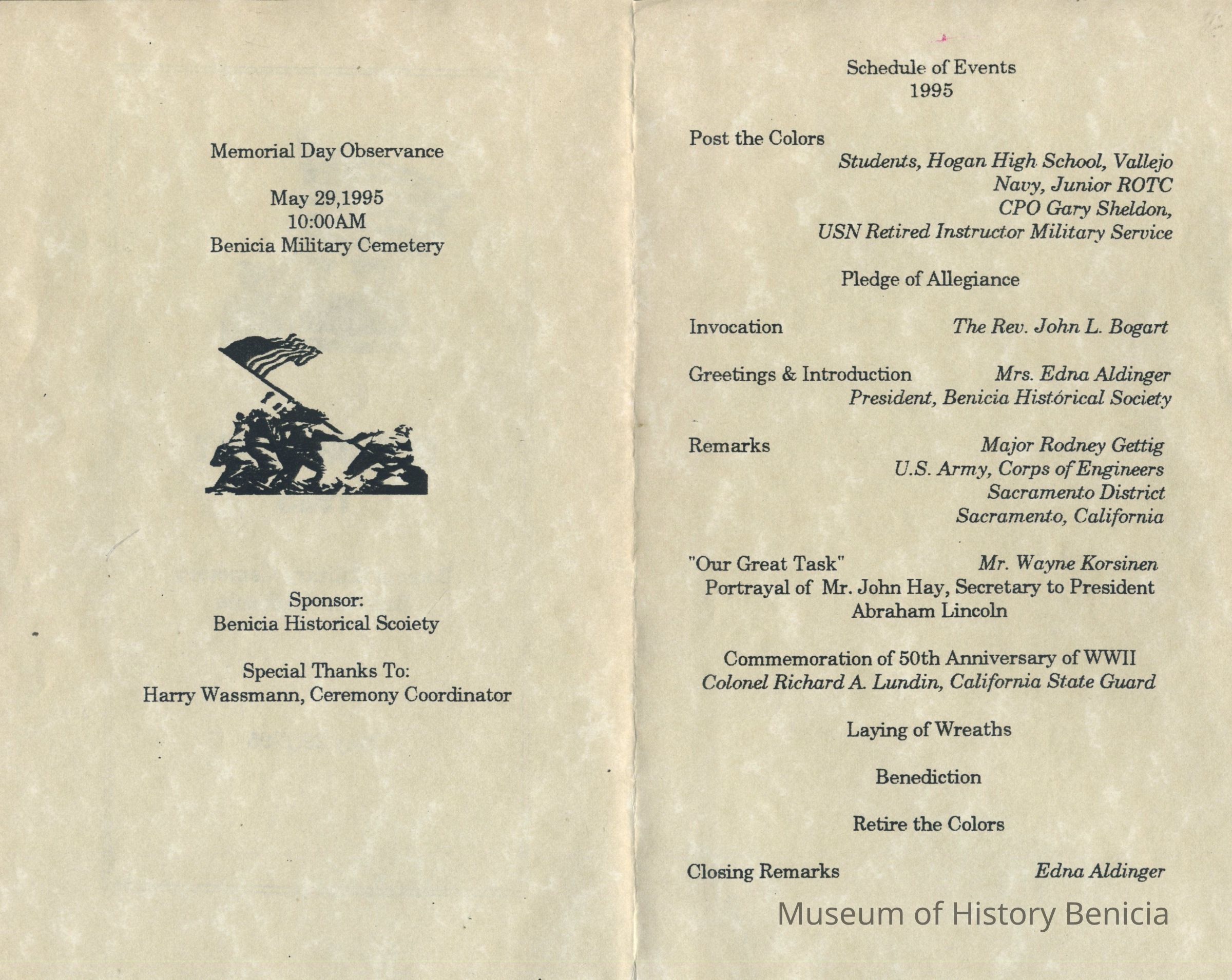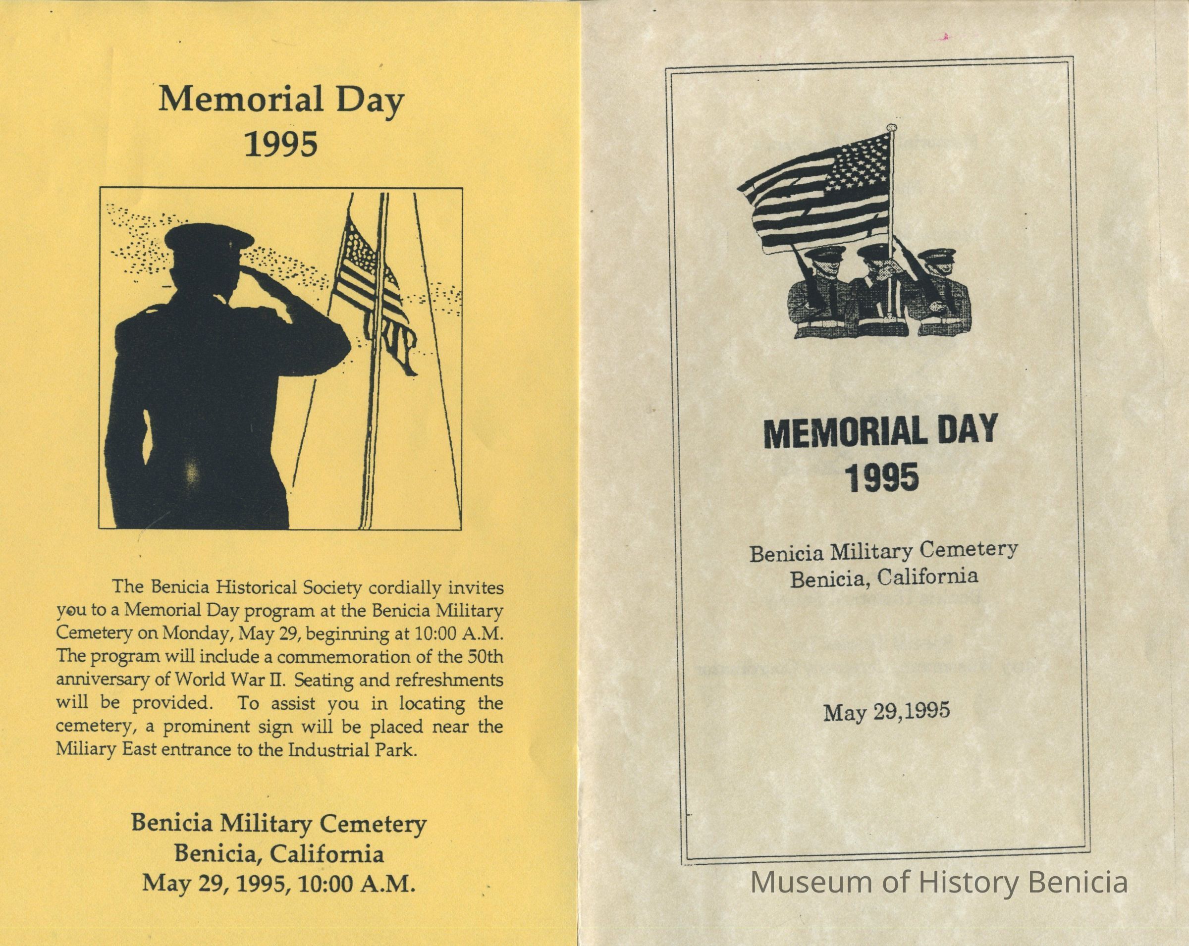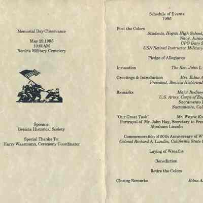 This is a brochure for the Memorial Day Service at the Benicia Military Cemetery for 05/29/1995. These observances became a tradition sponsored by the Benicia Historical Society. They started after the Society led by Harry Wassmann, pushed to have the cemetery rehabilitated in the early 1980's. The cooperation between the Society and the Sacramento Army Depot became a proud tradition in Benicia.Collection