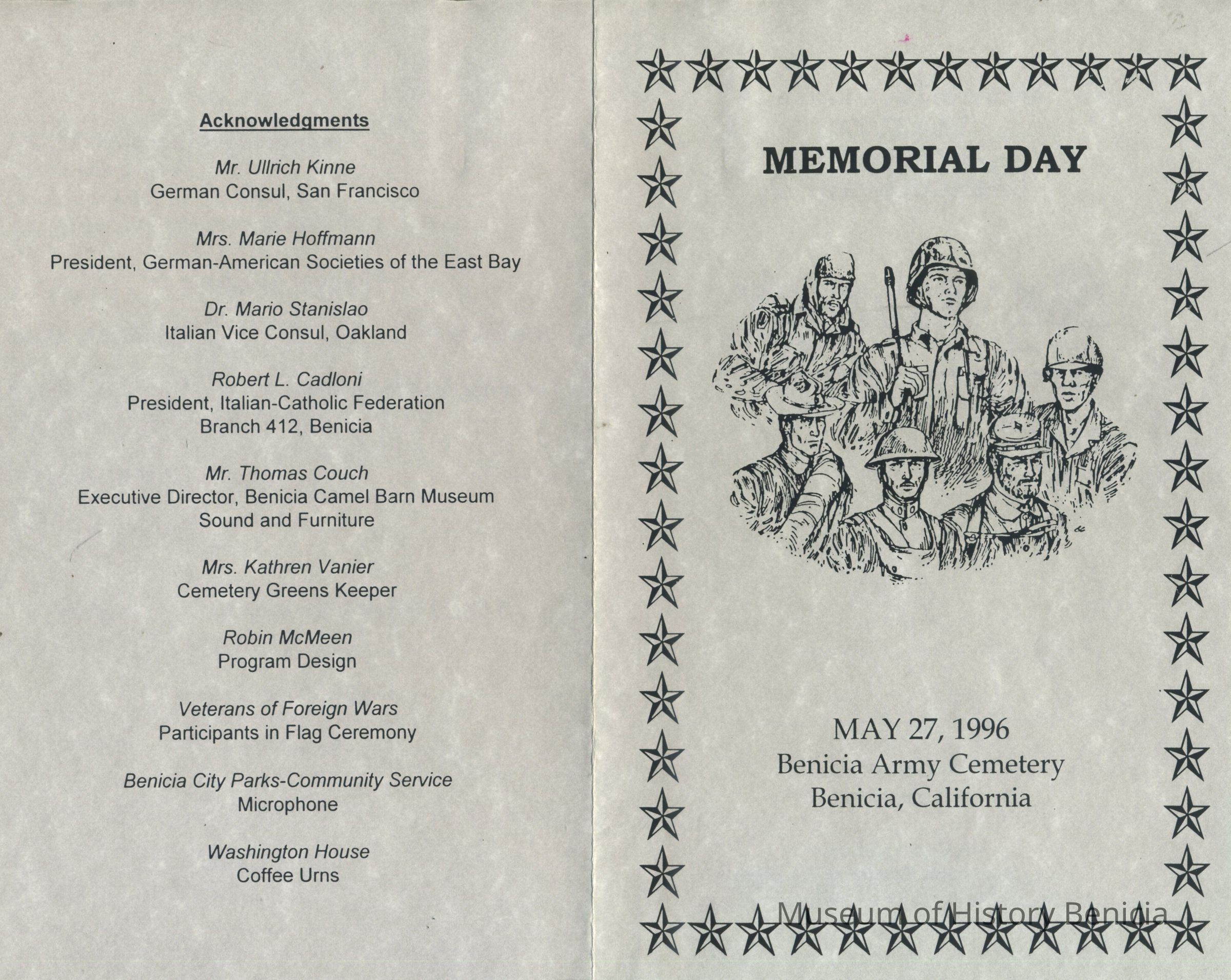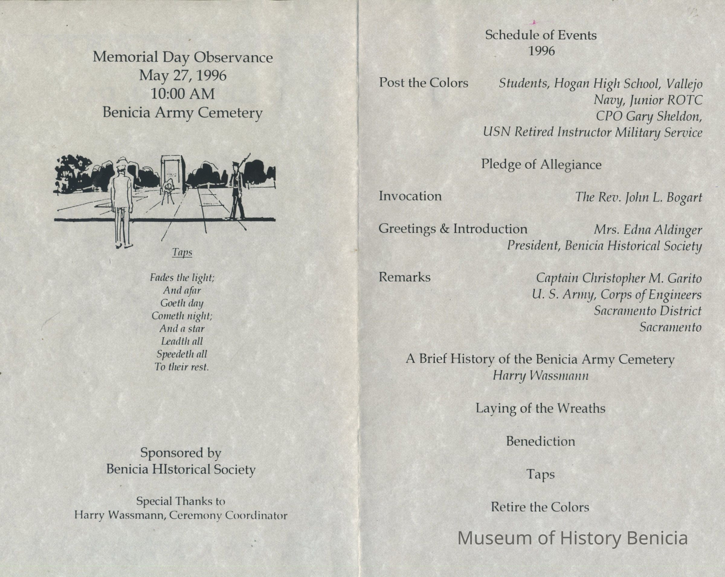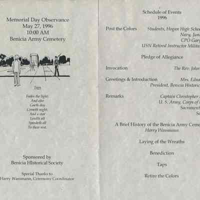 This is a brochure for the Memorial Day Service at the Benicia Military Cemetery for 05/27/1996. These observances became a tradition sponsored by the Benicia Historical Society. They started after the Society led by Harry Wassmann, pushed to have the cemetery rehabilitated in the early 1980's. The cooperation between the Society and the Sacramento Army Depot became a proud tradition in Benicia.Collection