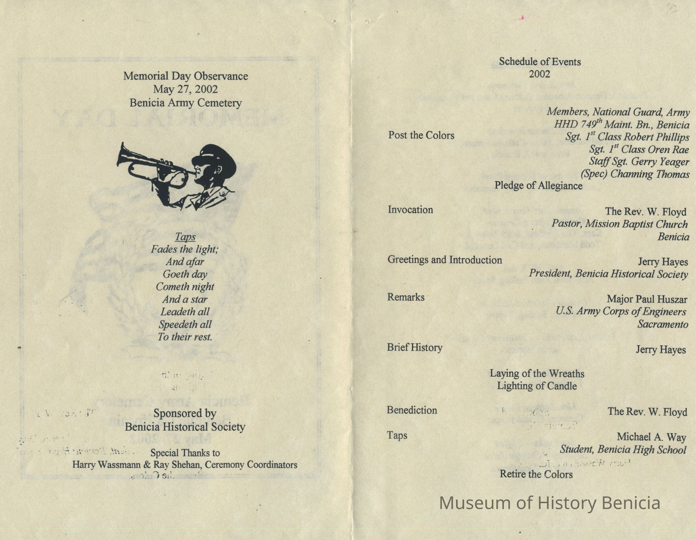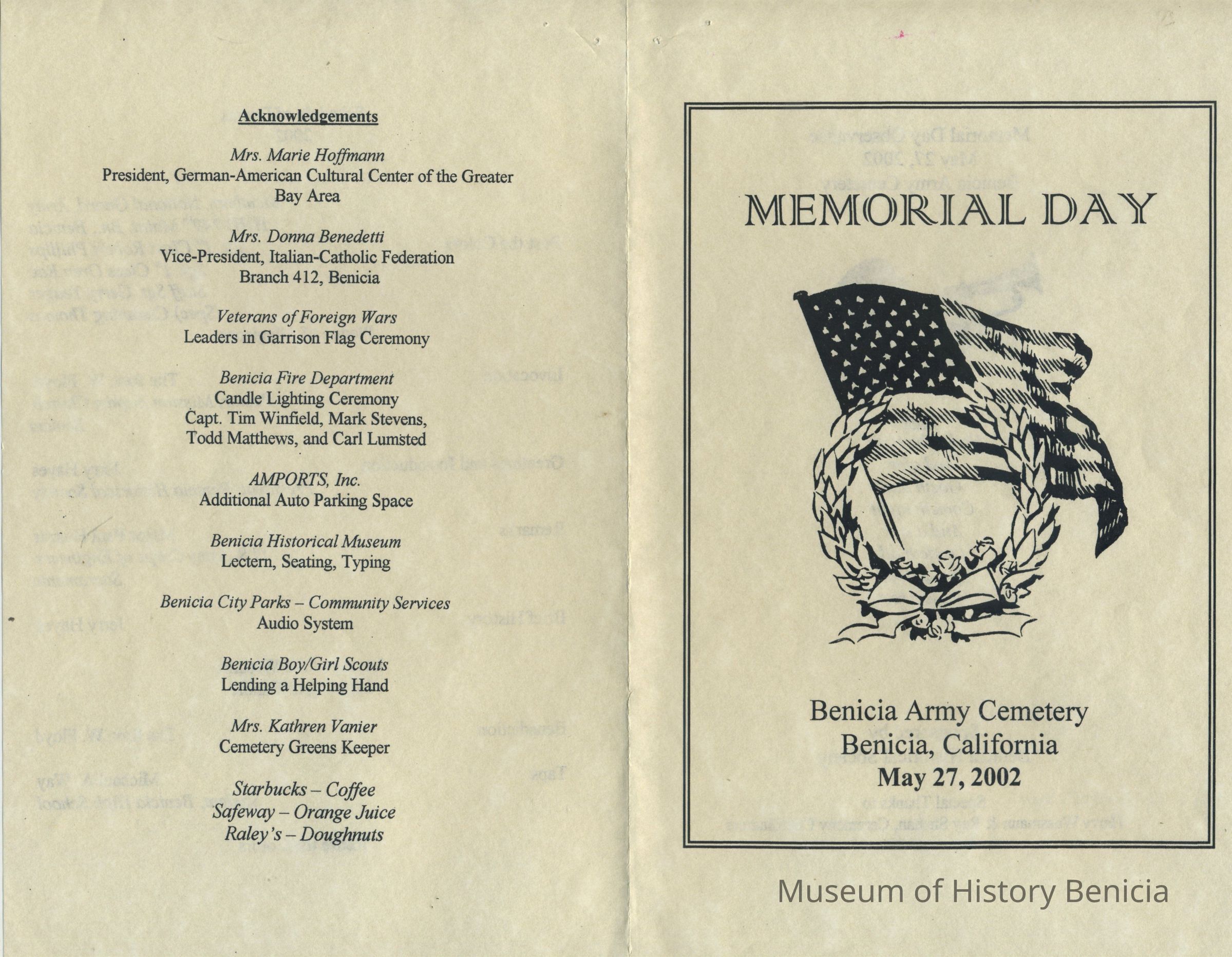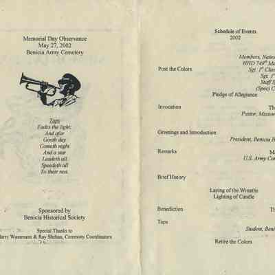 This is a brochure for the Memorial Day Service at the Benicia Military Cemetery for 05/27/2002. These observances became a tradition sponsored by the Benicia Historical Society. They started after the Society led by Harry Wassmann, pushed to have the cemetery rehabilitated in the early 1980's. The cooperation between the Society and the Sacramento Army Depot became a proud tradition in Benicia.Collection